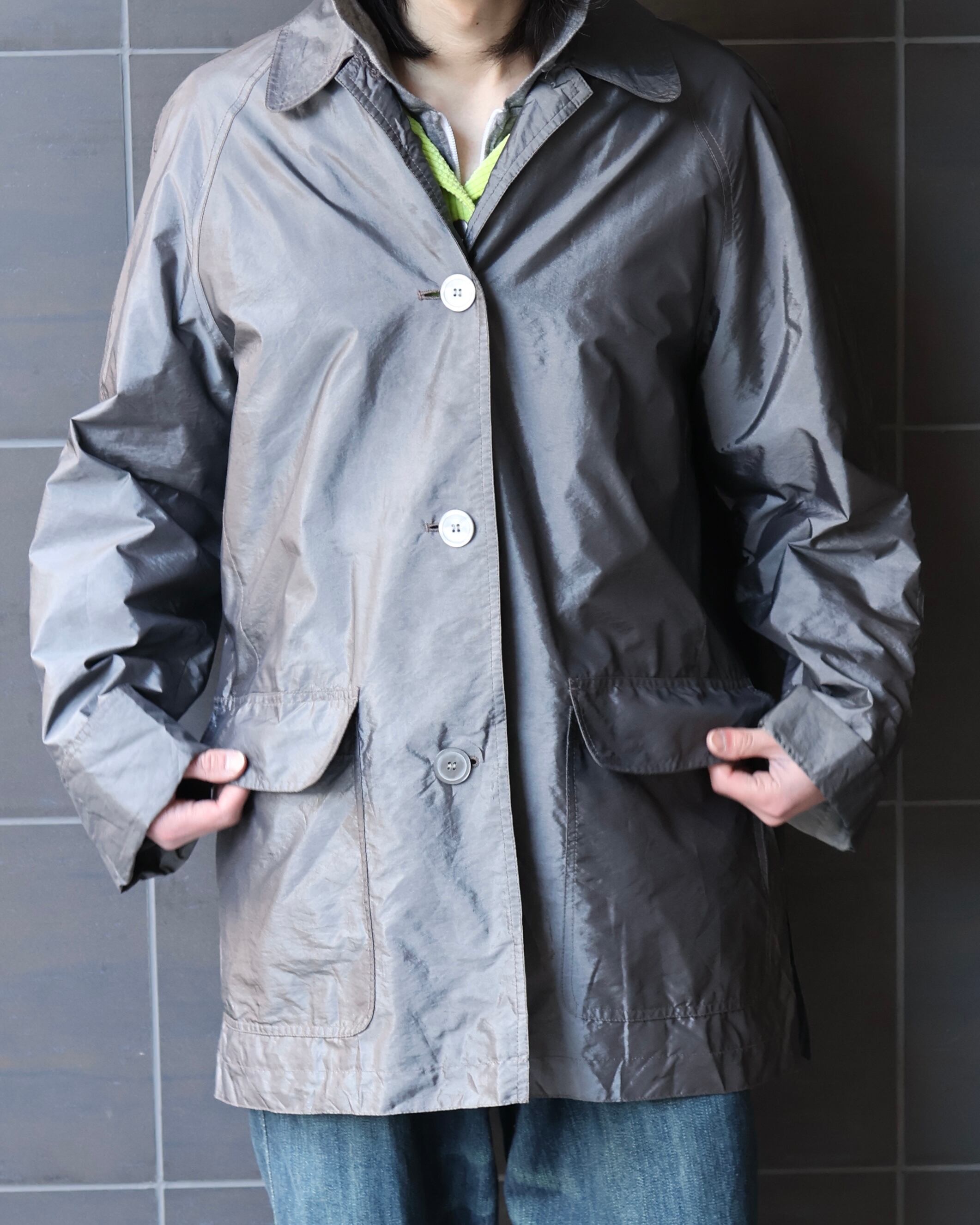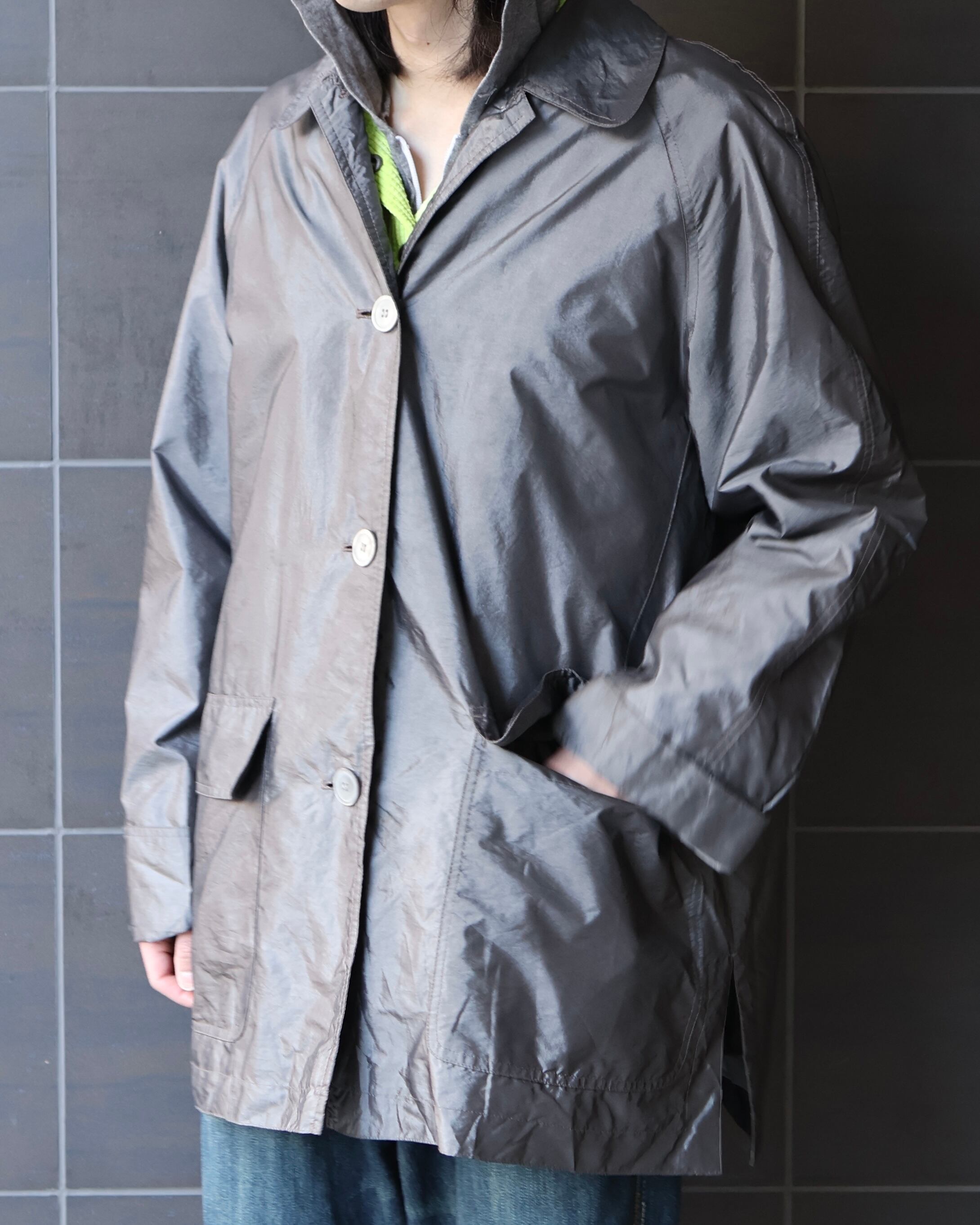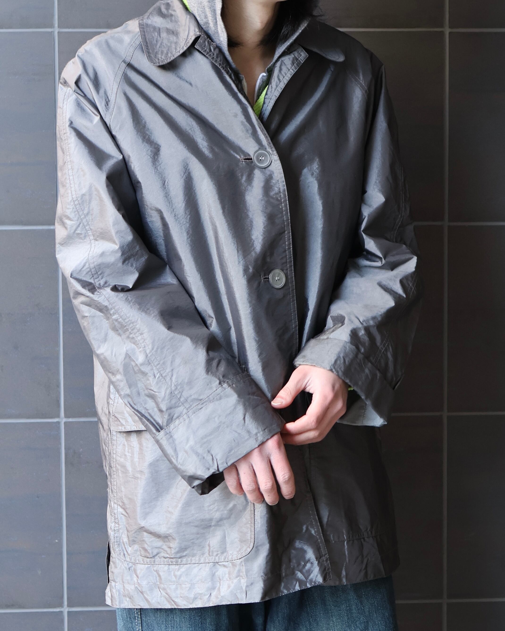 軽い素材感のため春にも着用可能なジャケットでカラーリングがシルバーのため色を取り入れたスタイリングからモードなスタイリングにも最適なアイテム。