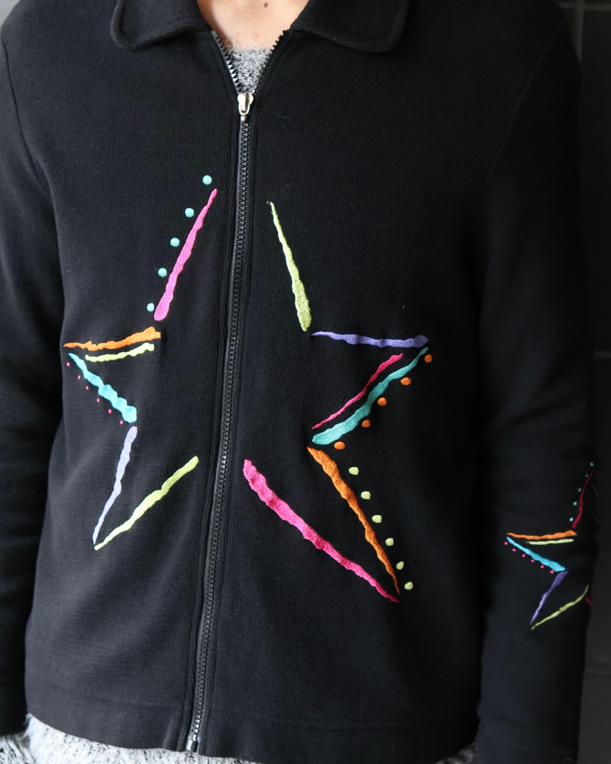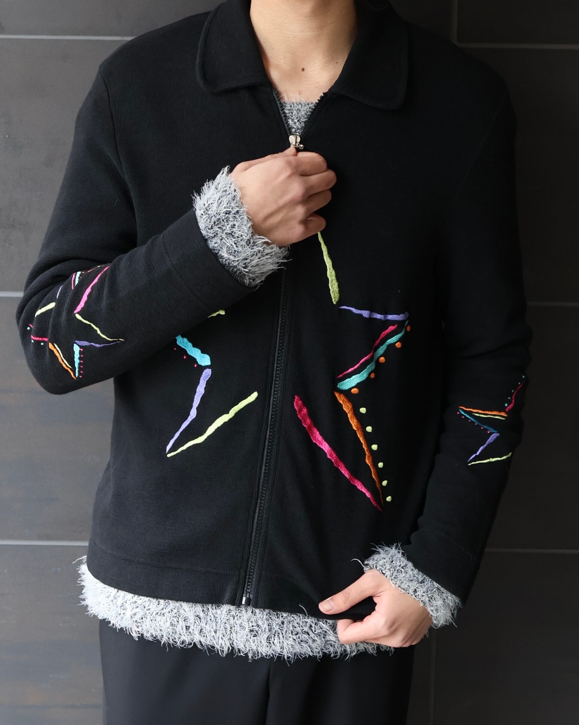 フロント、袖部分の刺繍デザインが特徴的なジップアップニットブルゾン