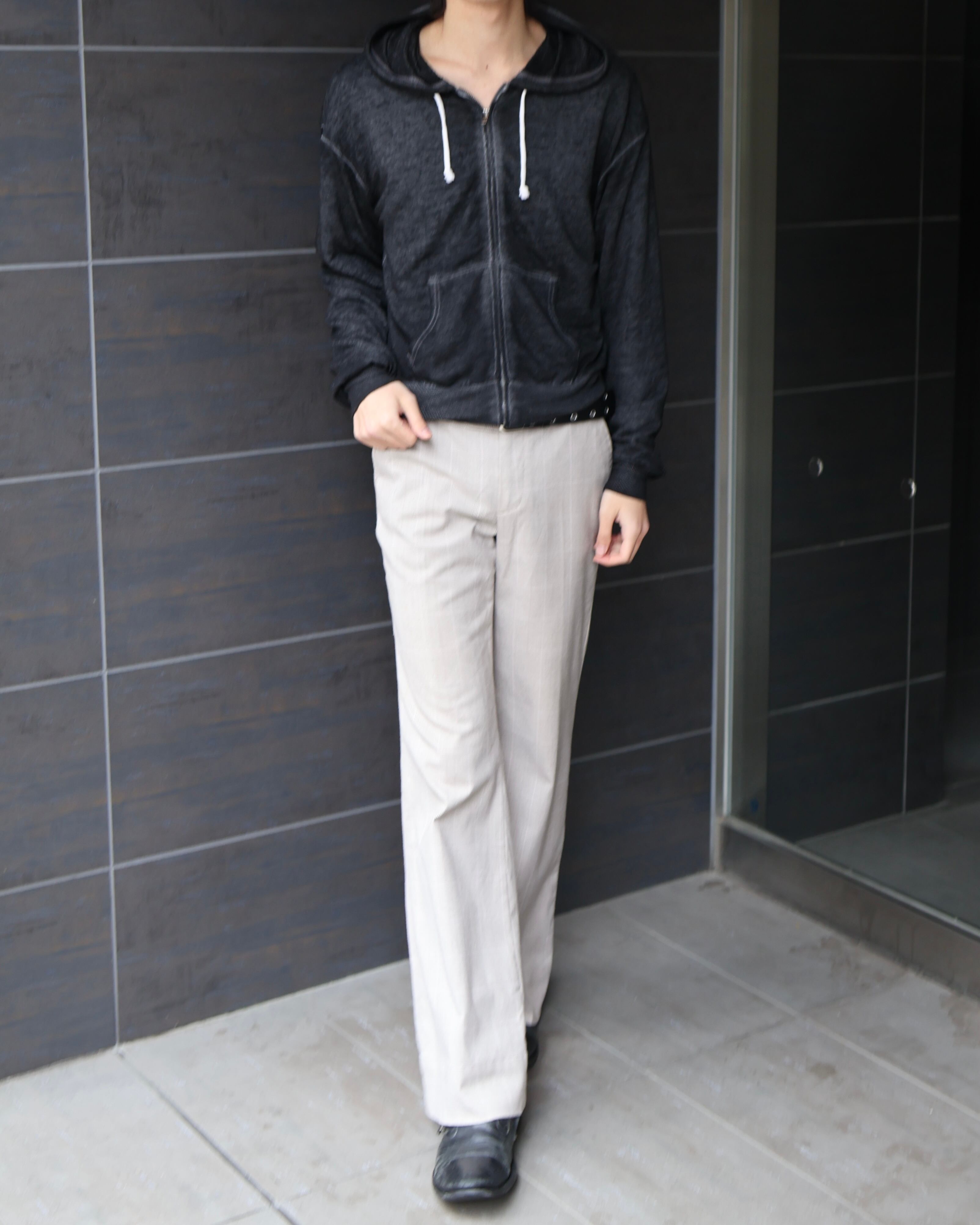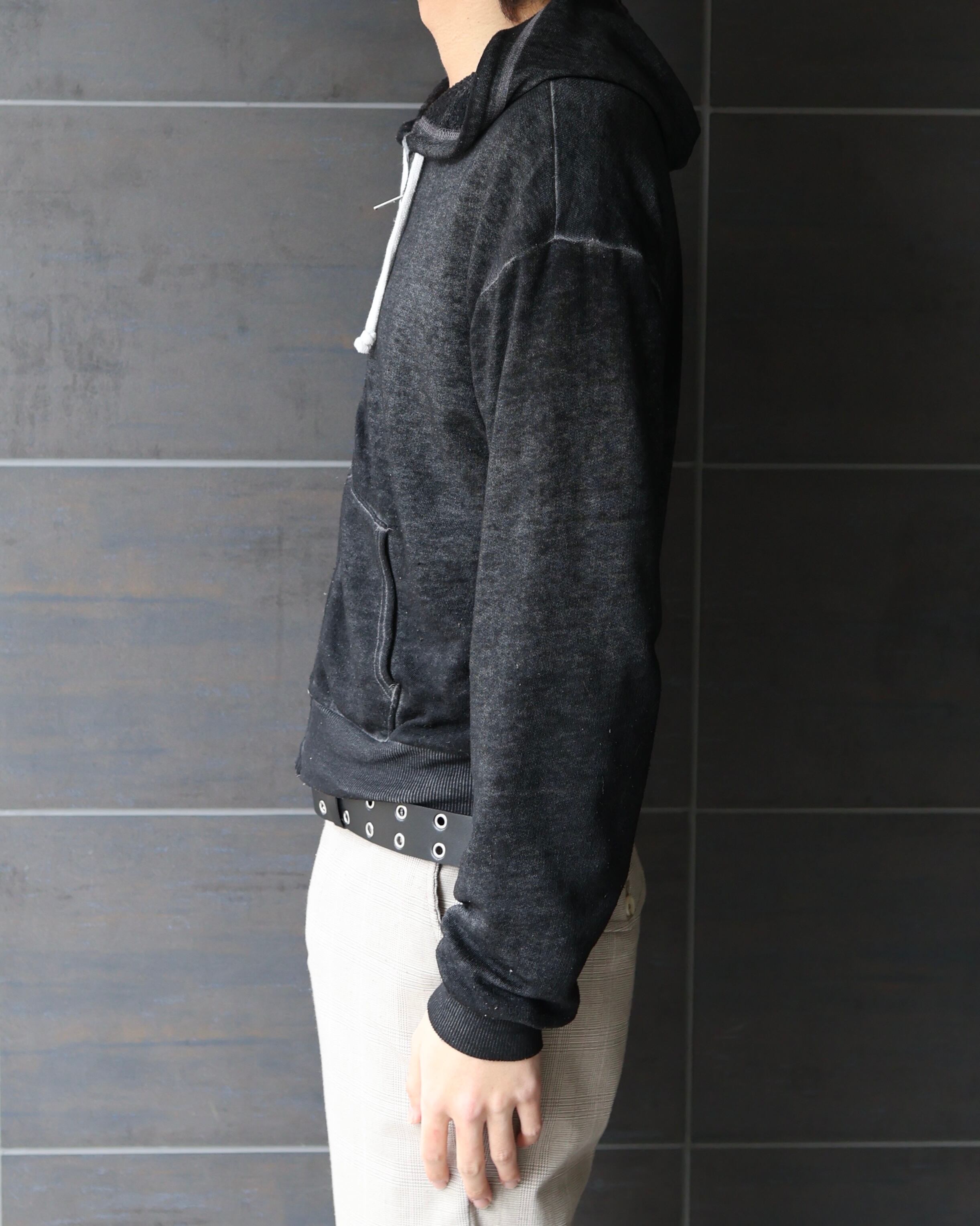 フェード感のあるカラーリングでモードなスタイリングに落とし込むことで黒の中でも差別化を図りやすいアイテム。インナーとしても活用可能