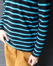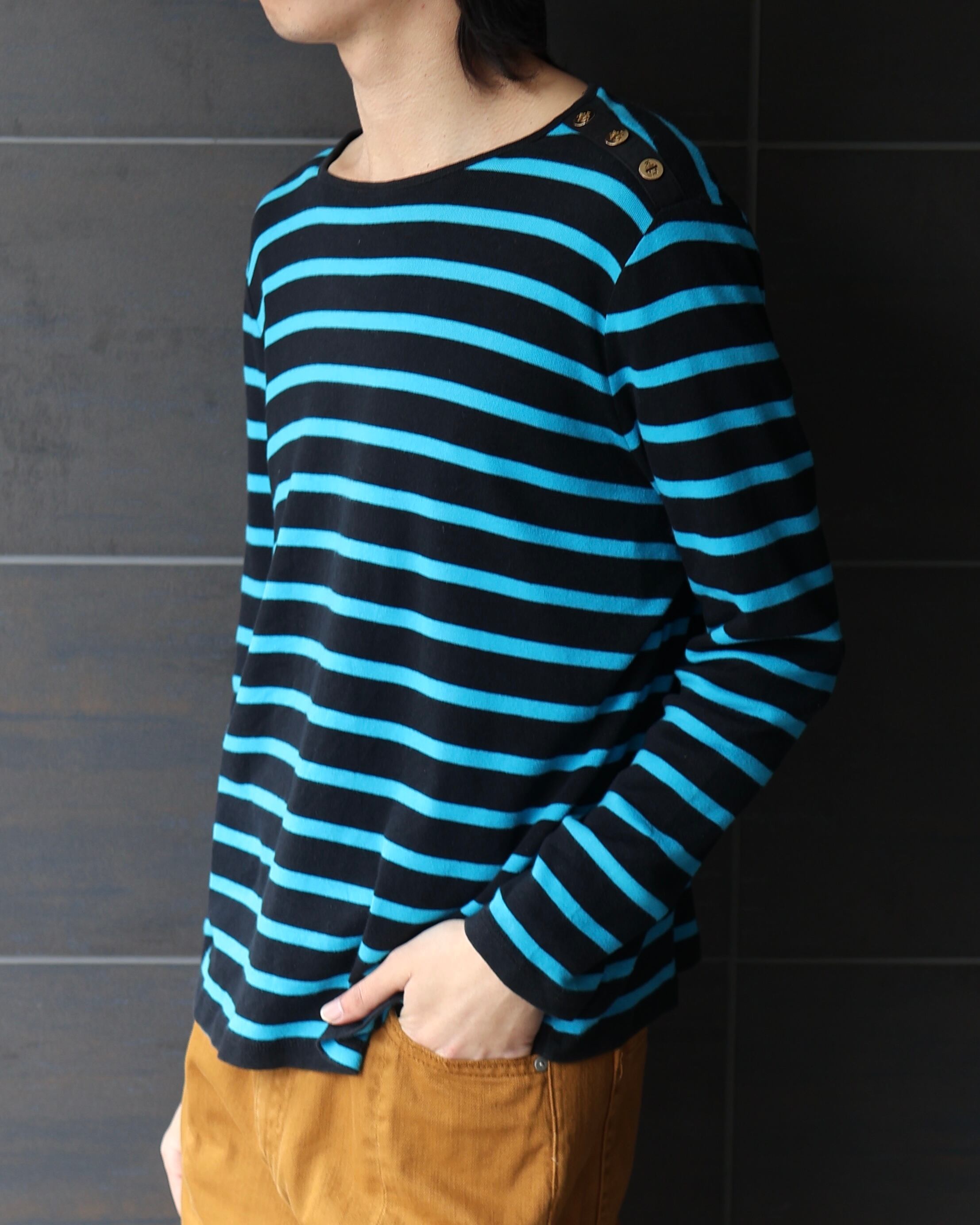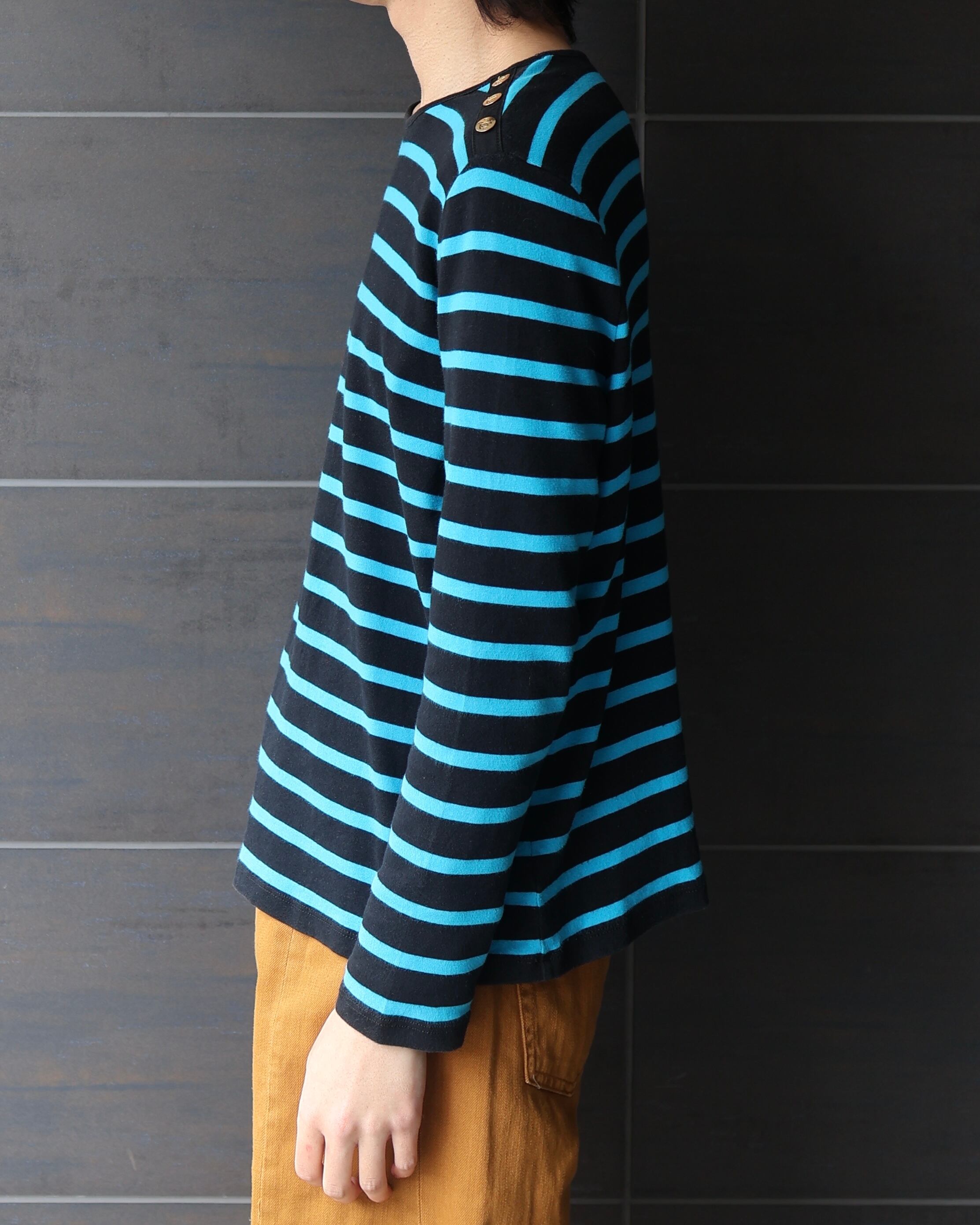 ショルダーボタンのデザインが特徴的なストライプトップ