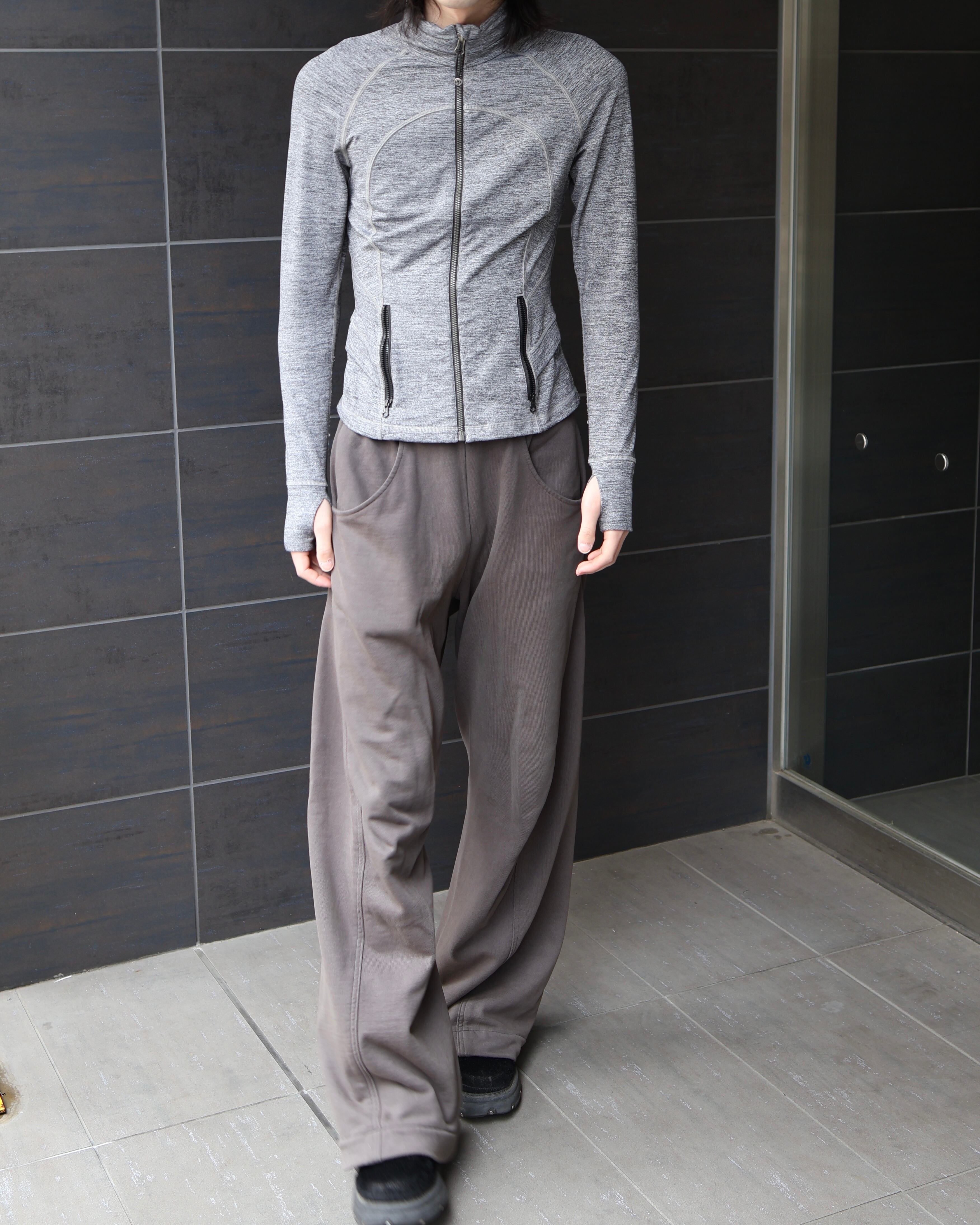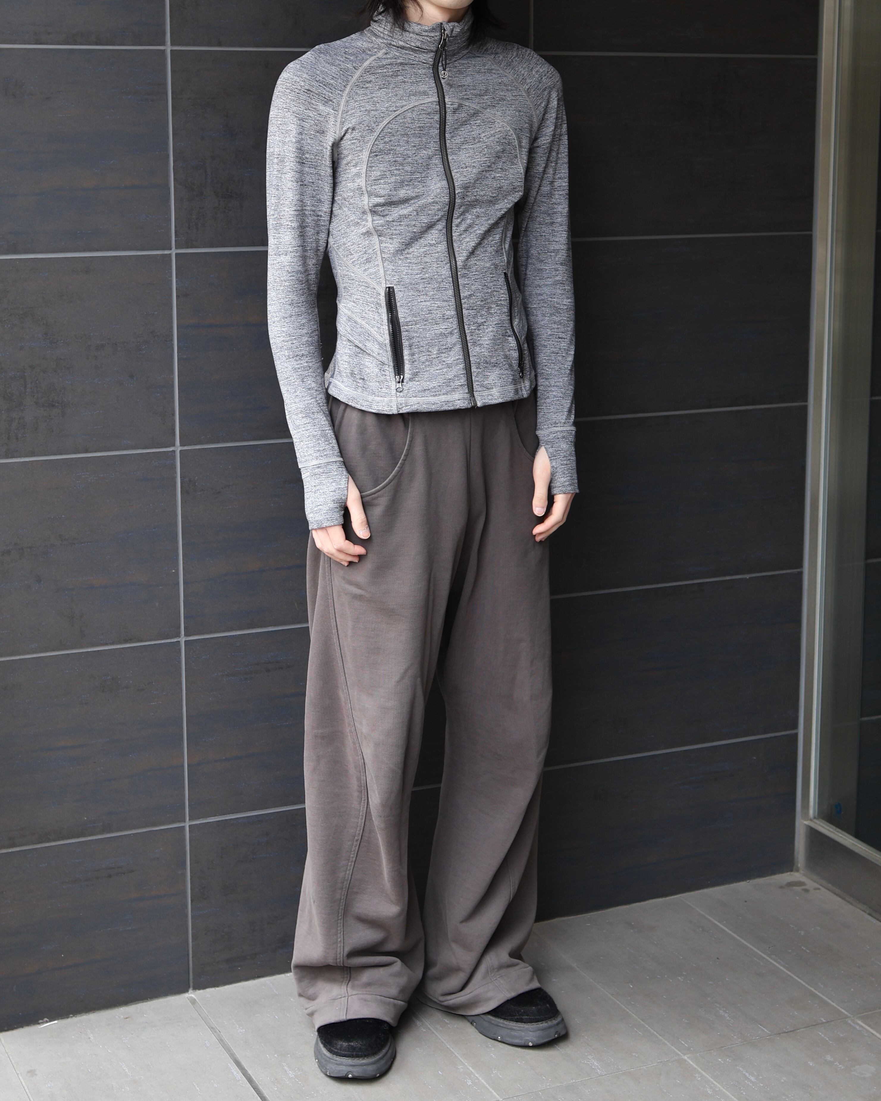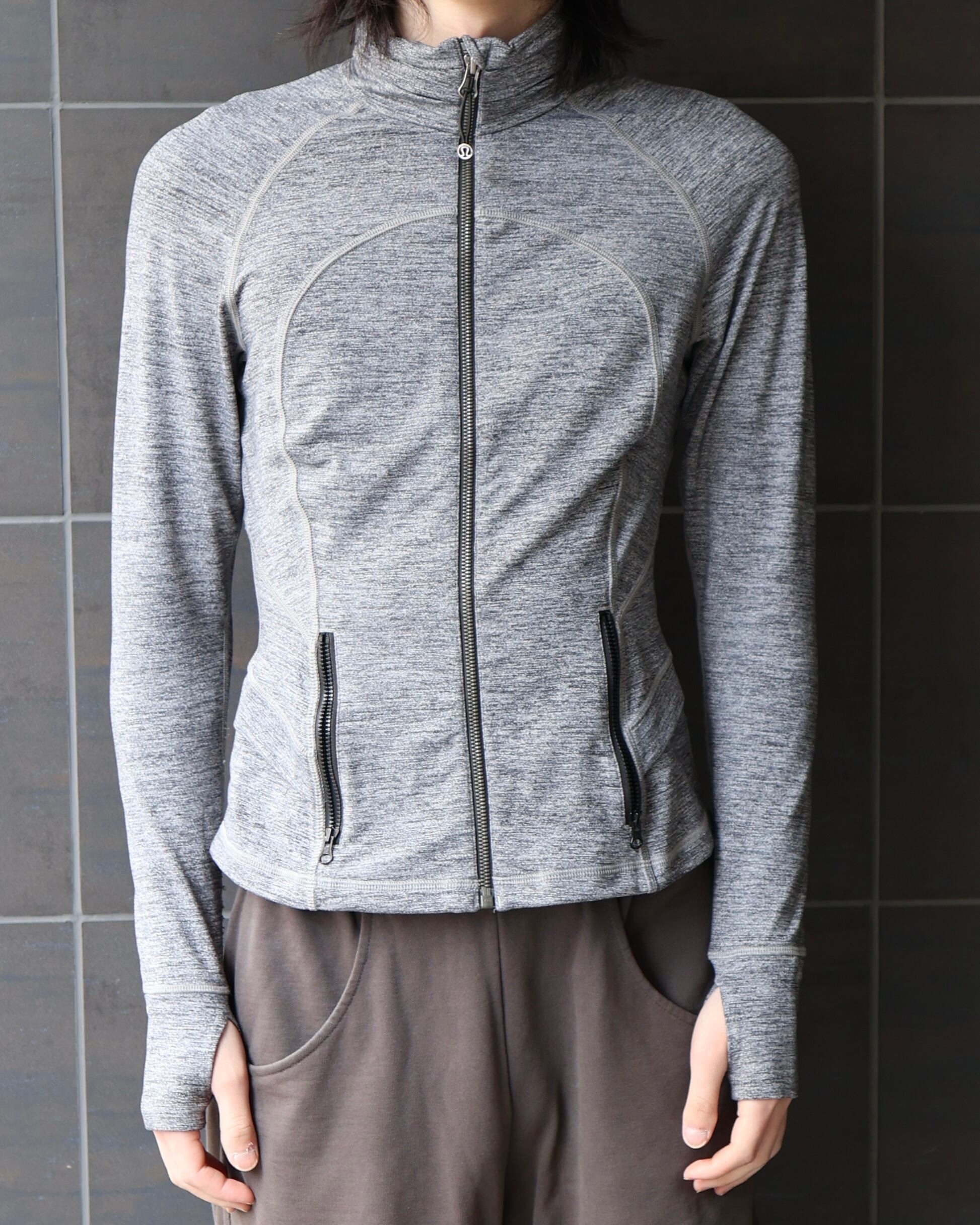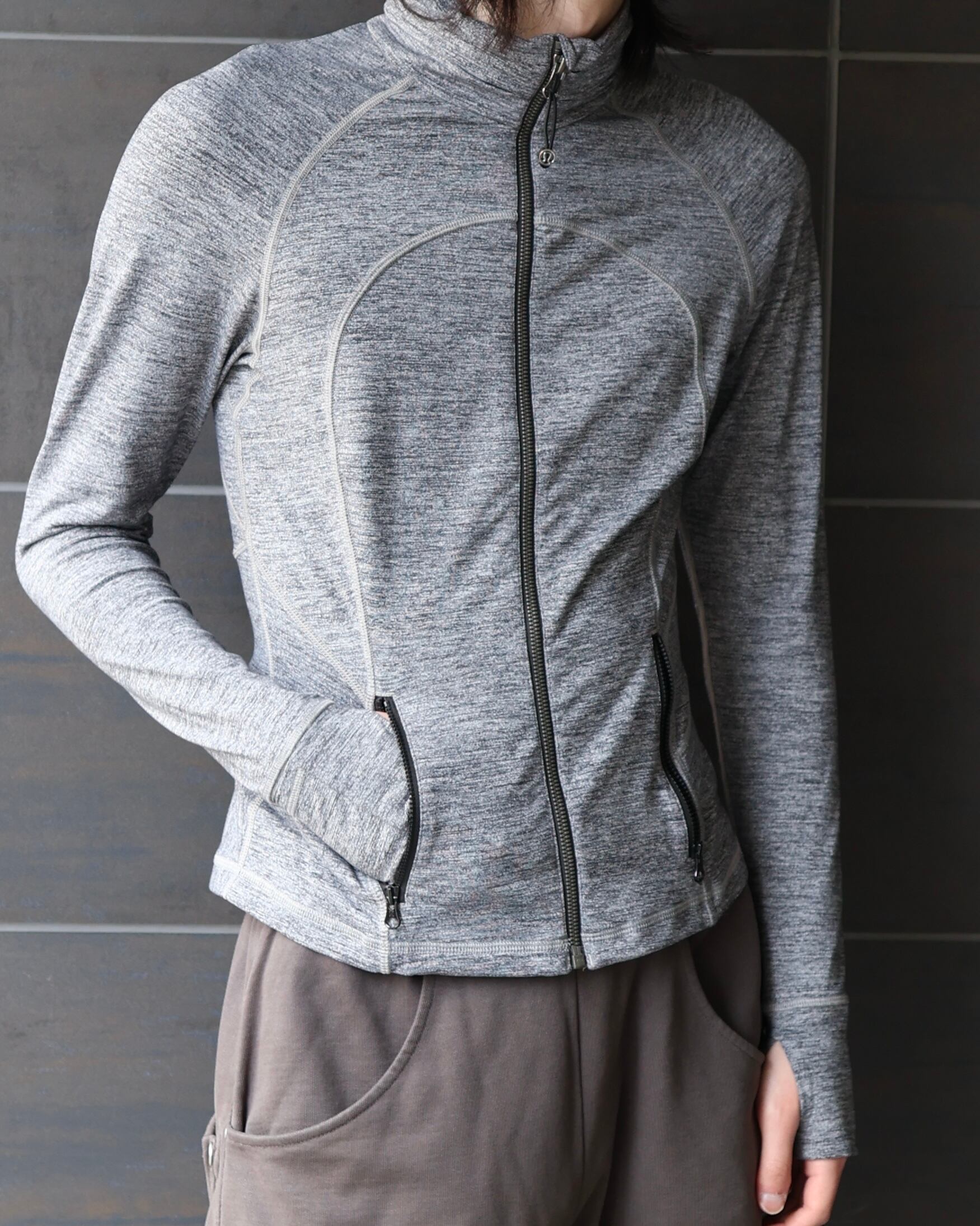 背中のドレープ感のあるディティールが特徴的なサムホールのついたジップアップトップス