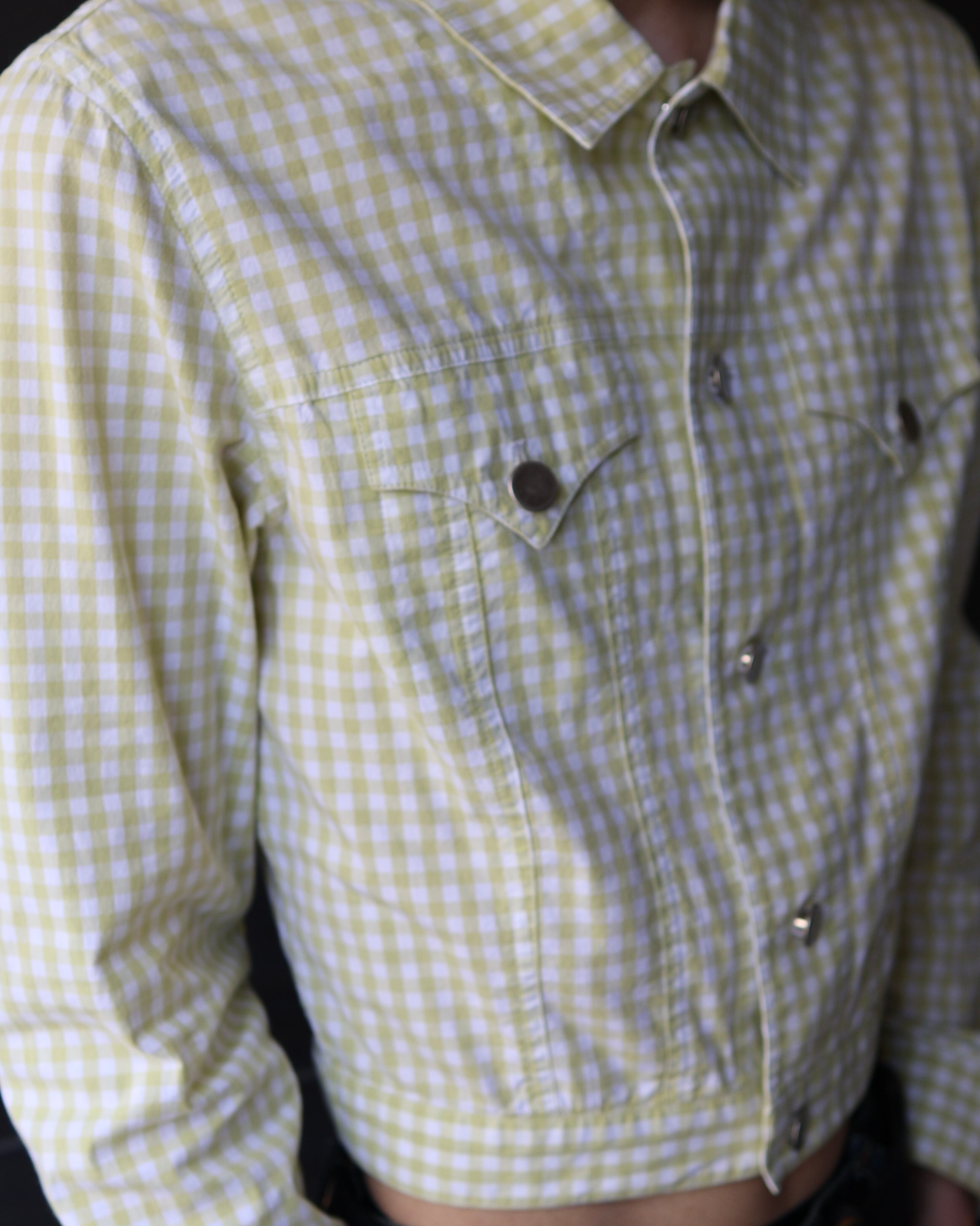 軽い素材感で短丈のため春夏にもスタイル良く一枚で着用することができるアイテム。