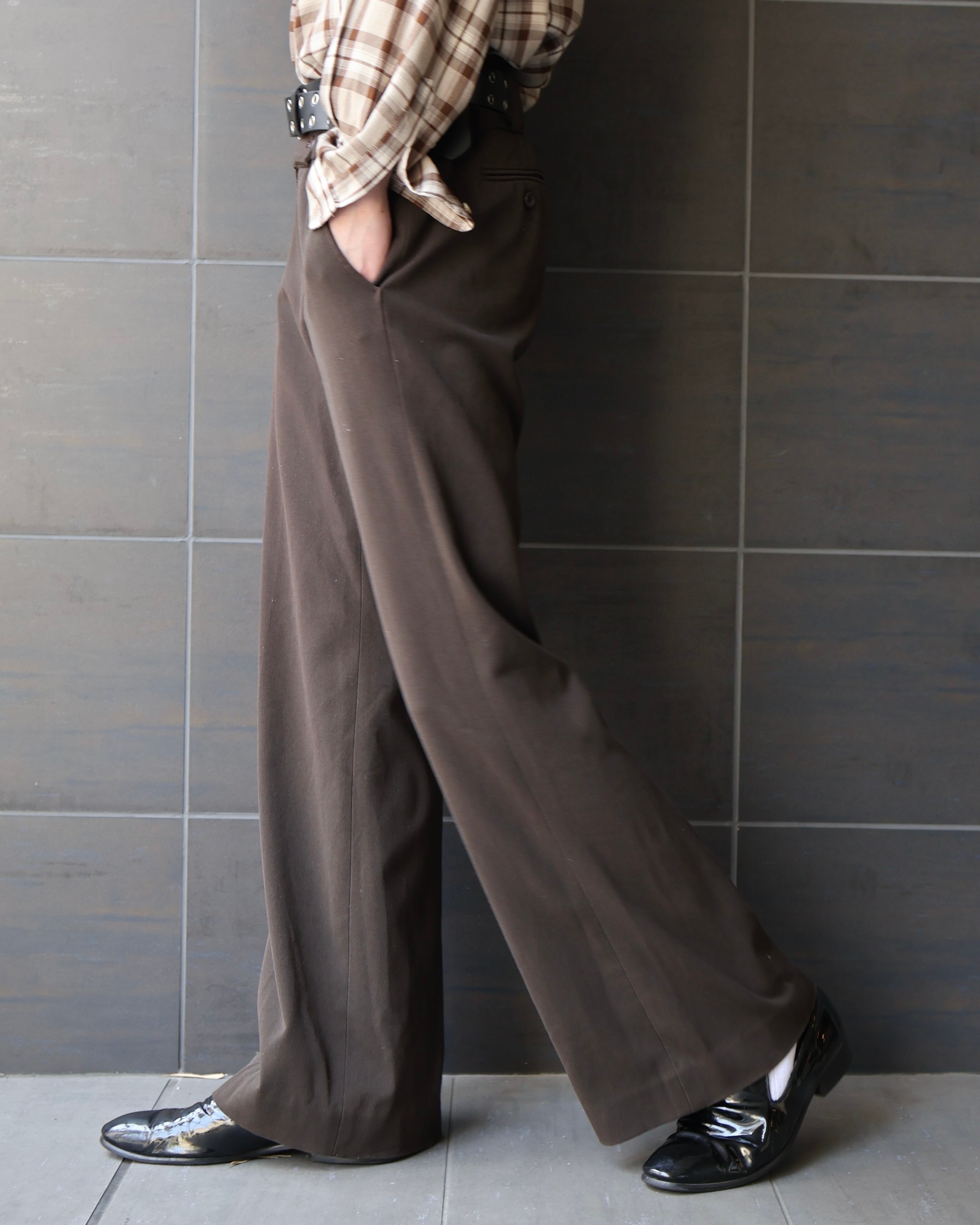 シルエットが美しく落ち着いたカラーリングのためさまざまなスタイリングに落とし込むことが可能なアイテム。色物のスラックスを持っていない方にはよりおすすめ