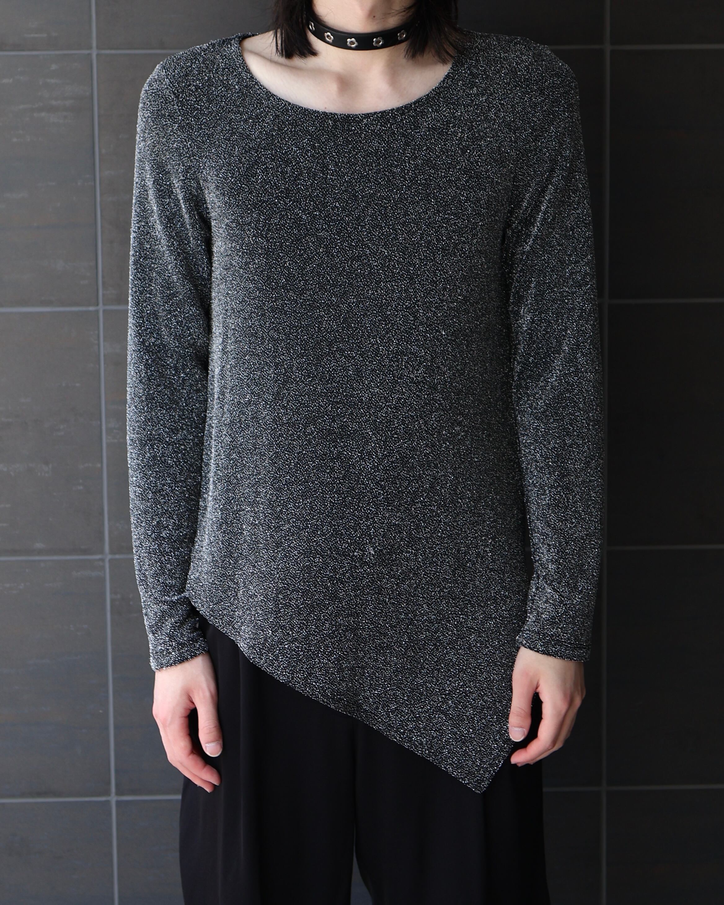 裾部分がアシンメトリーとなっているラメデザイントップ