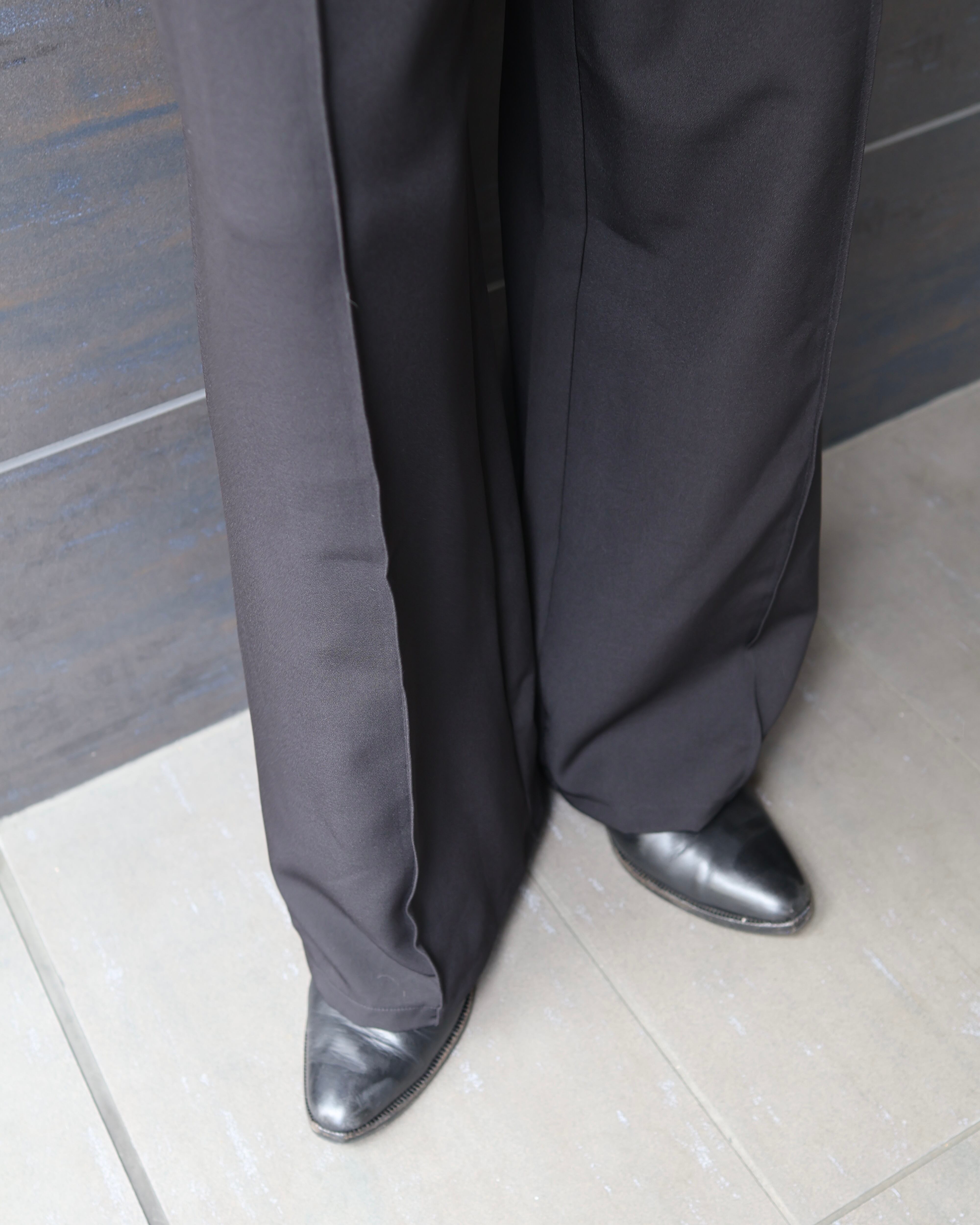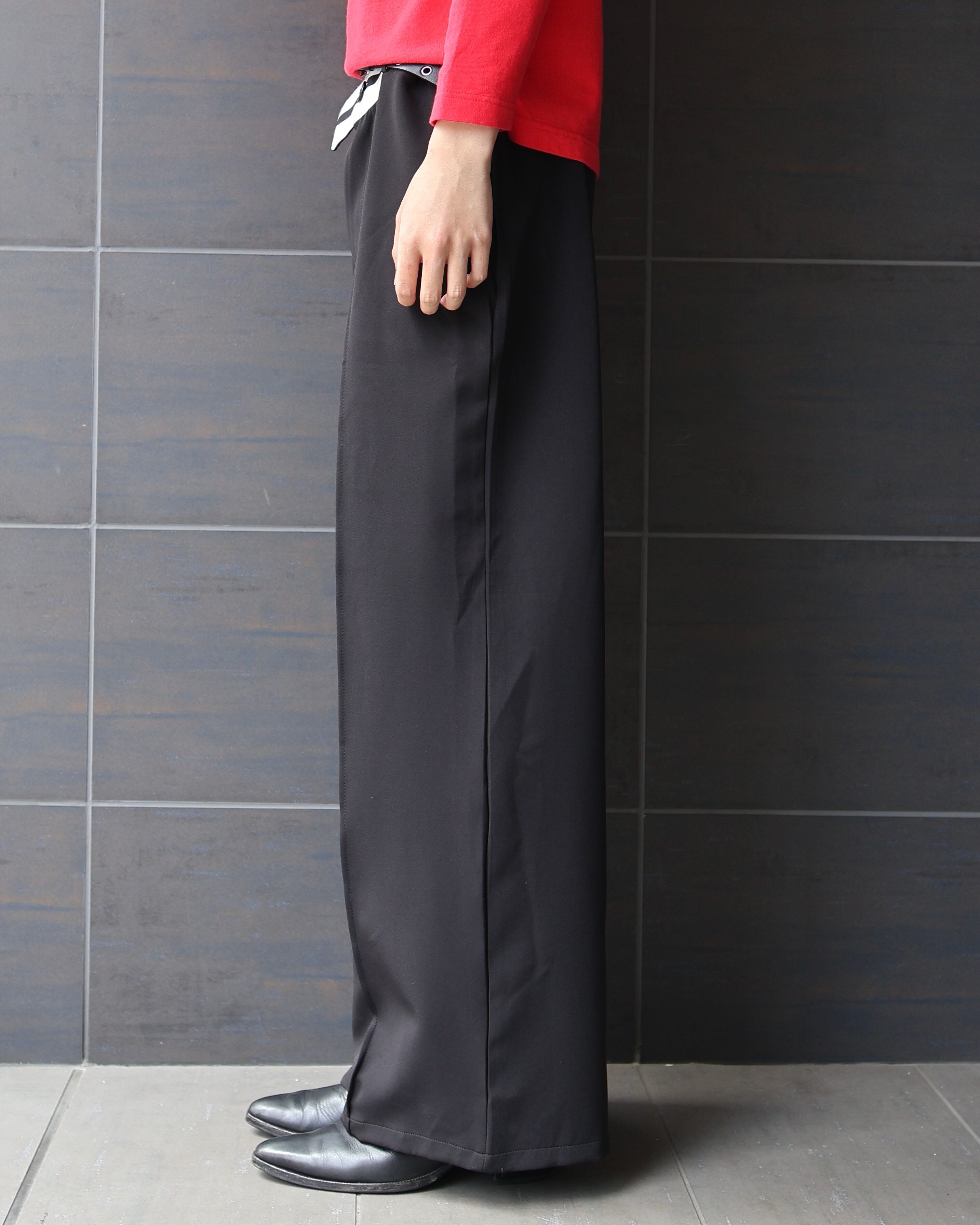 ウエスト部分がアシンメトリーになっているワイドストレートスラックス