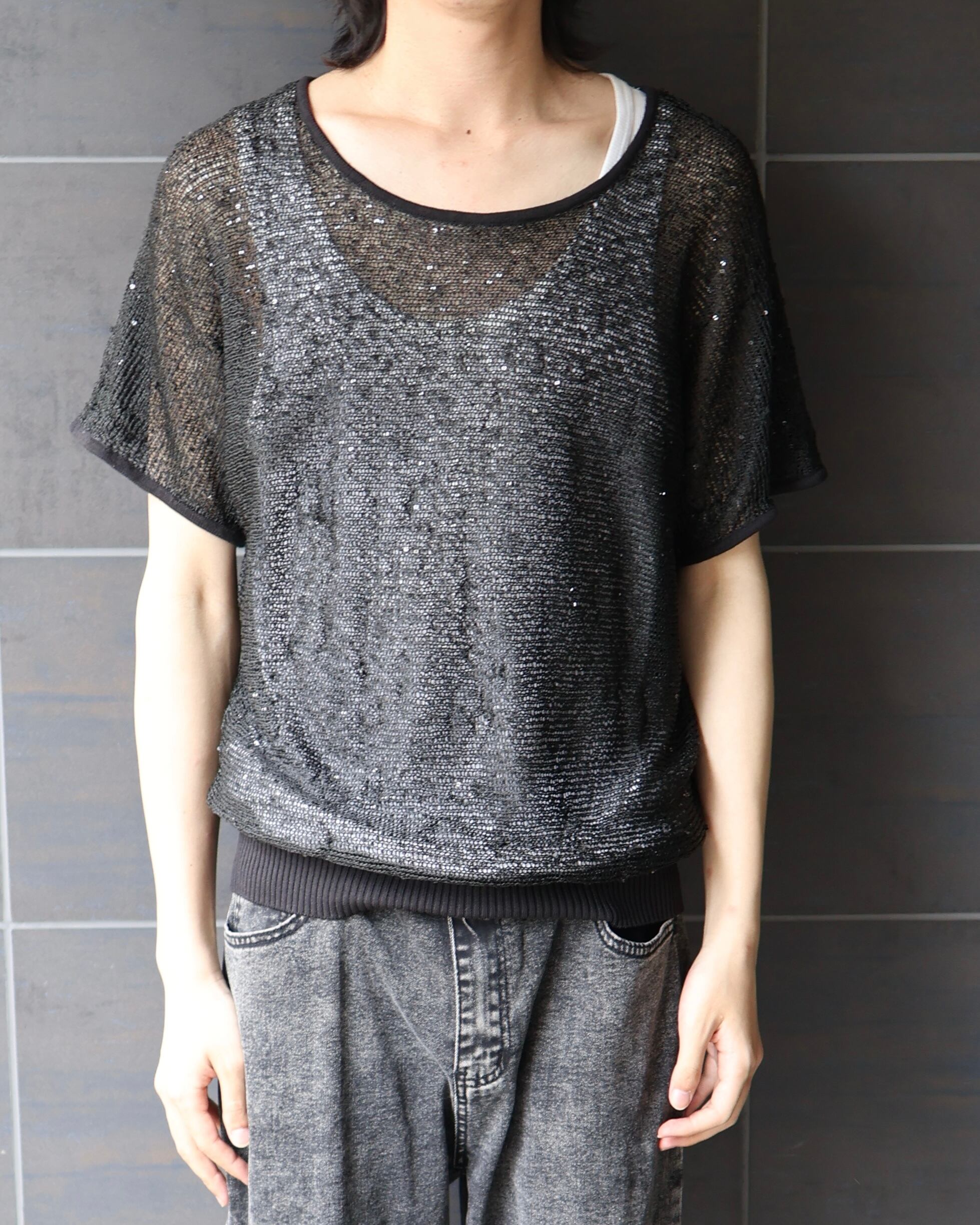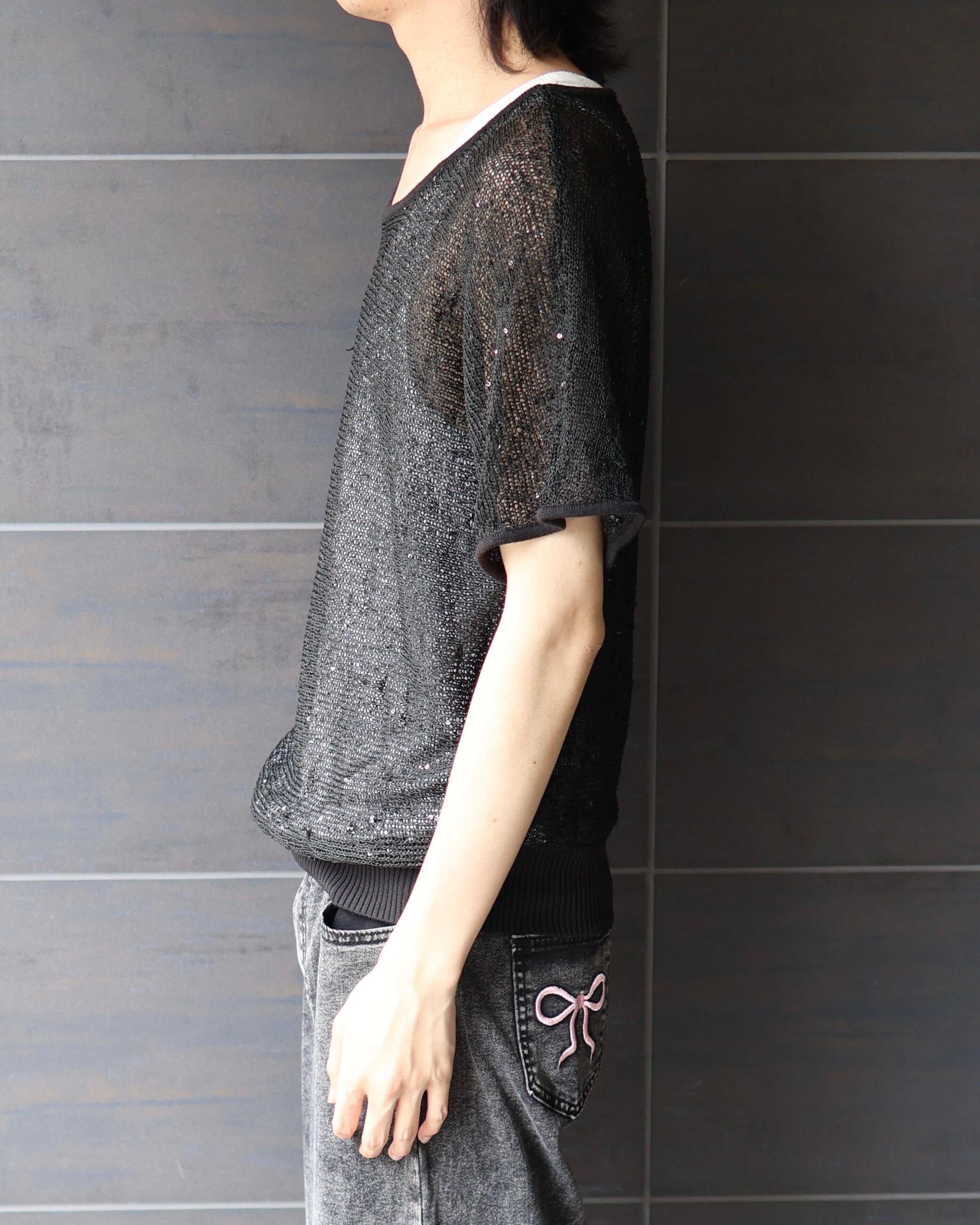 スパンコールによるデザイン性が特徴的なシアーニット