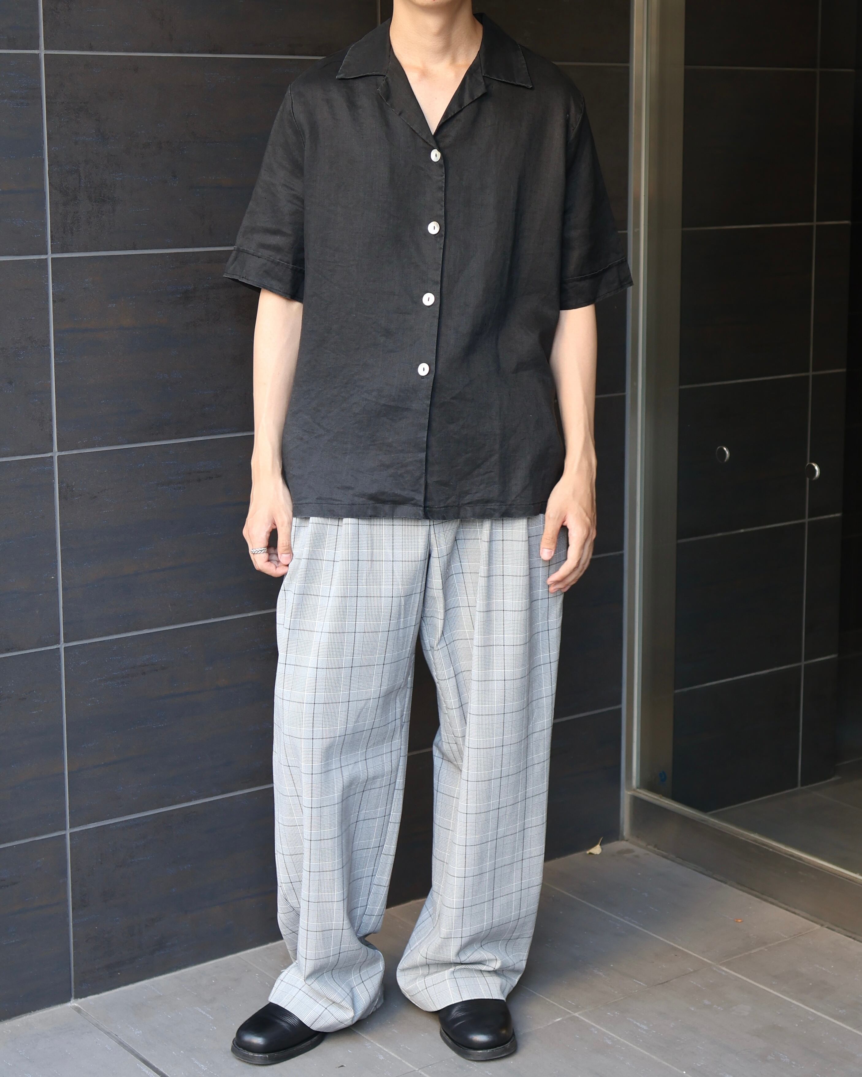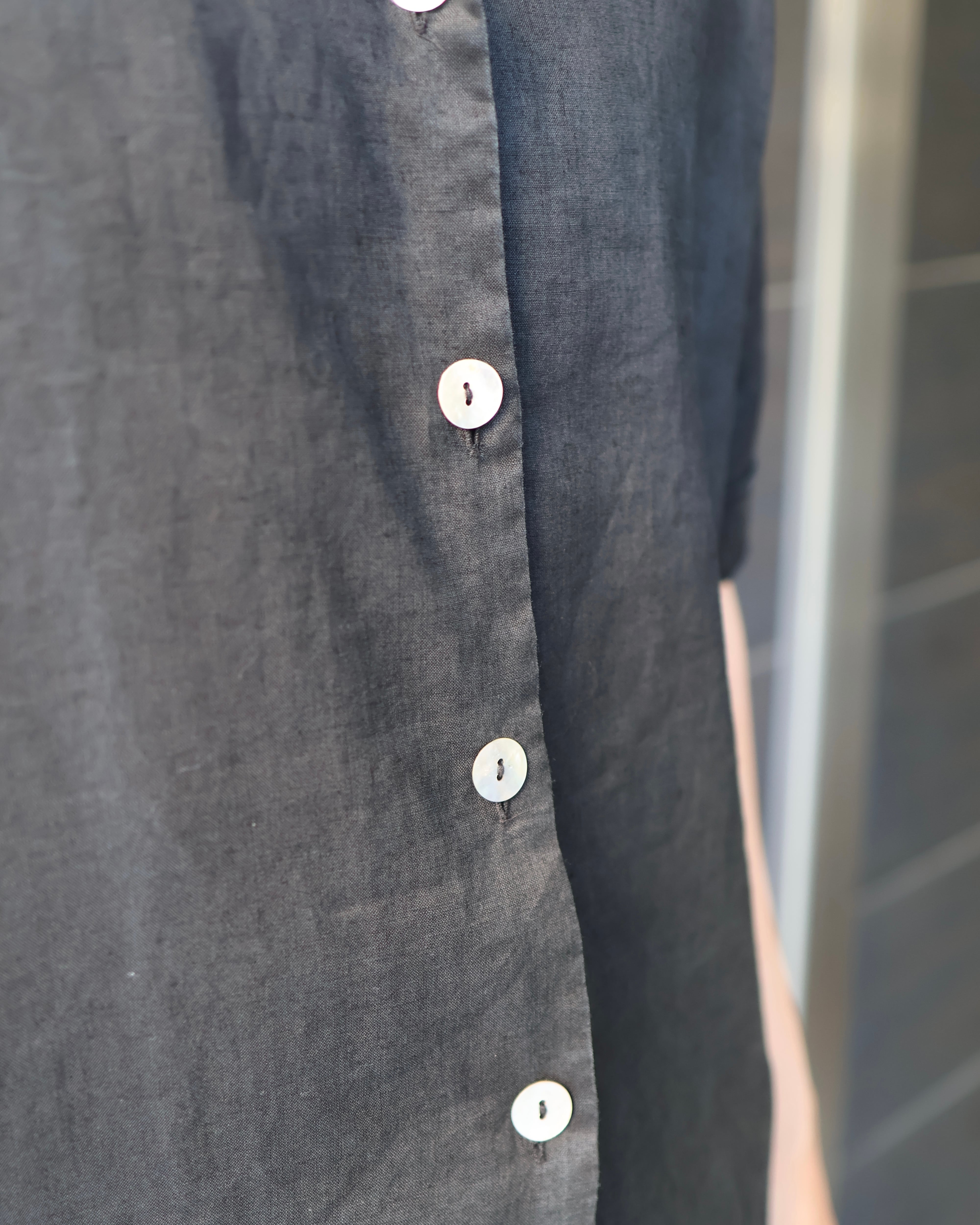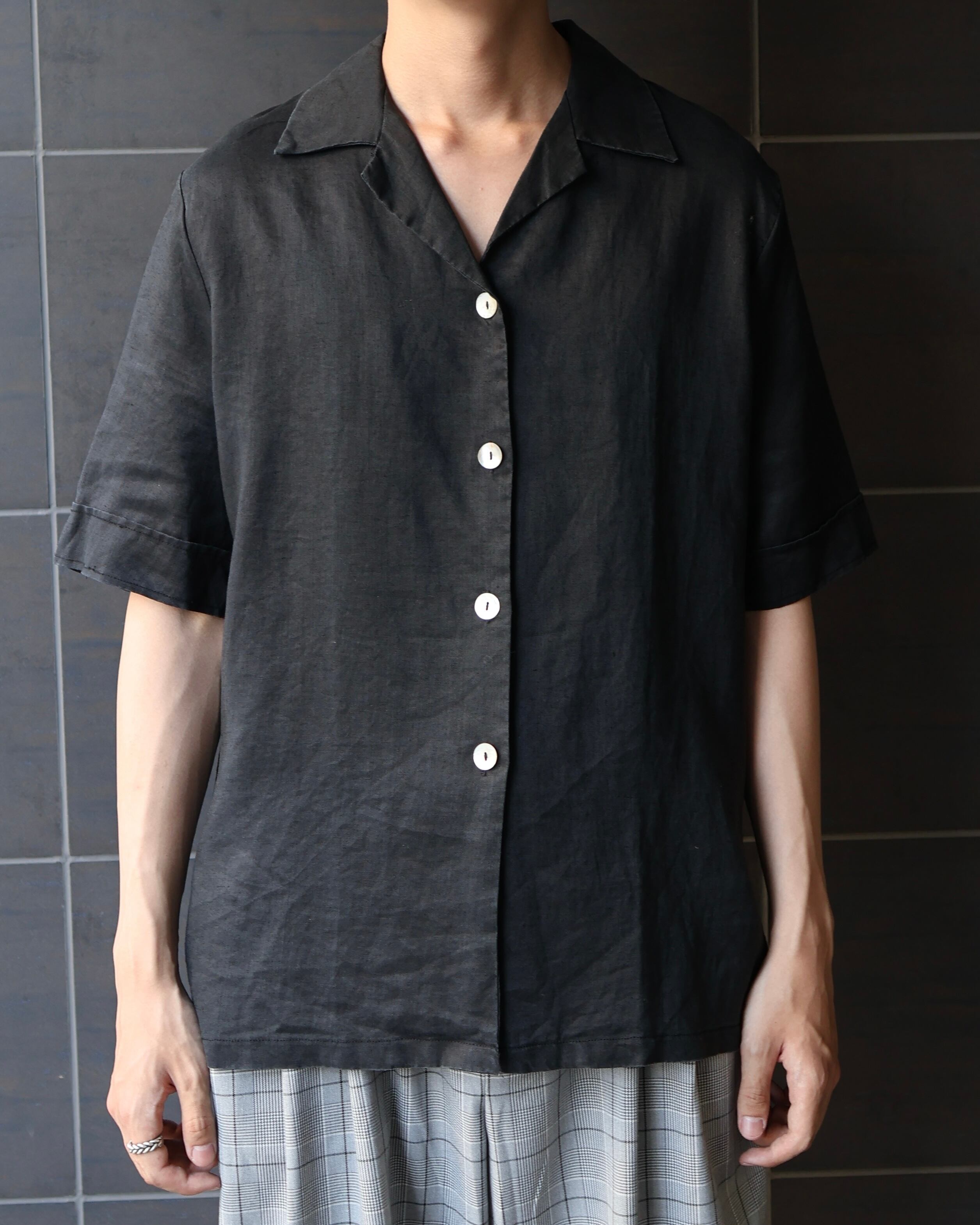 シェルボタンが特徴的な麻素材の半袖シャツ