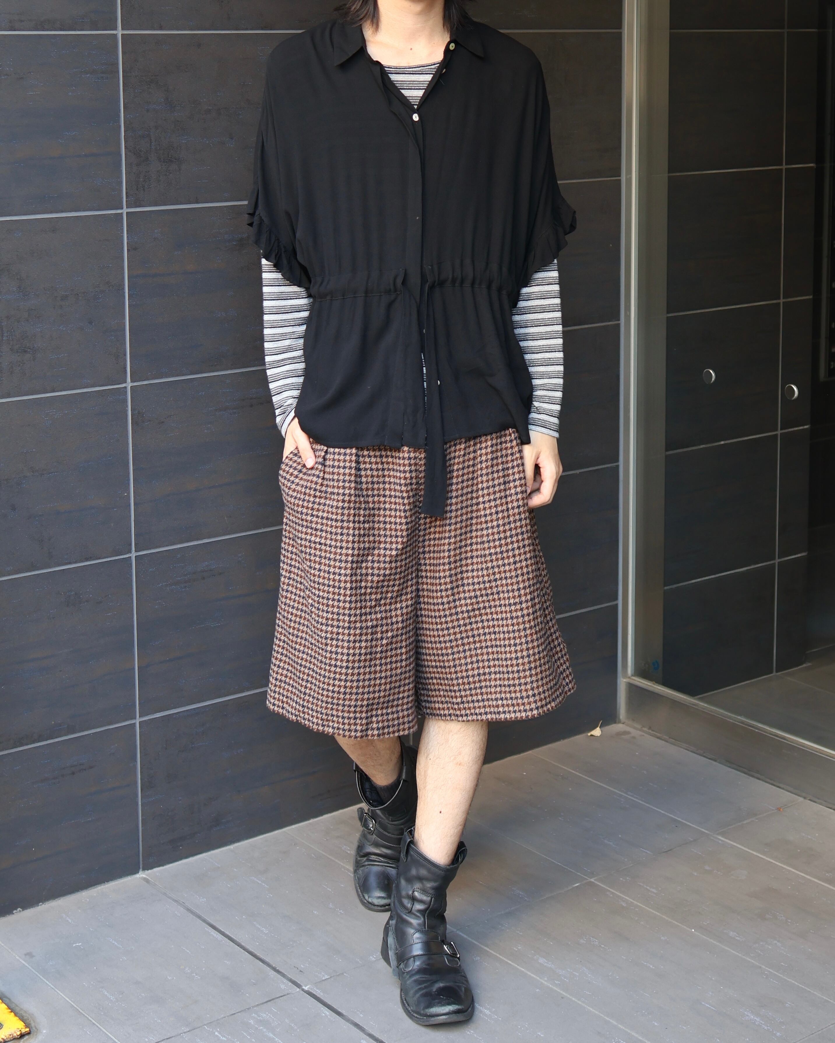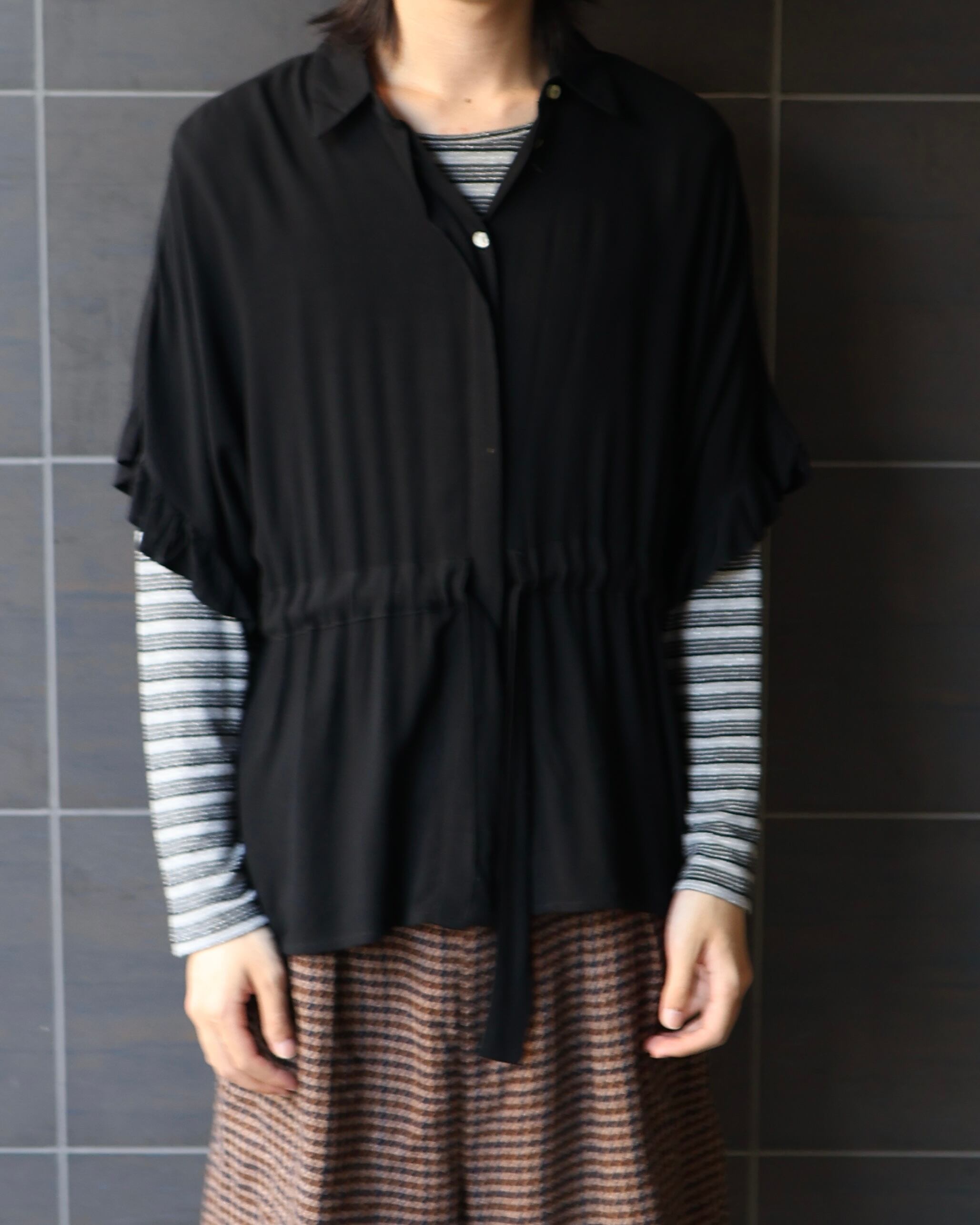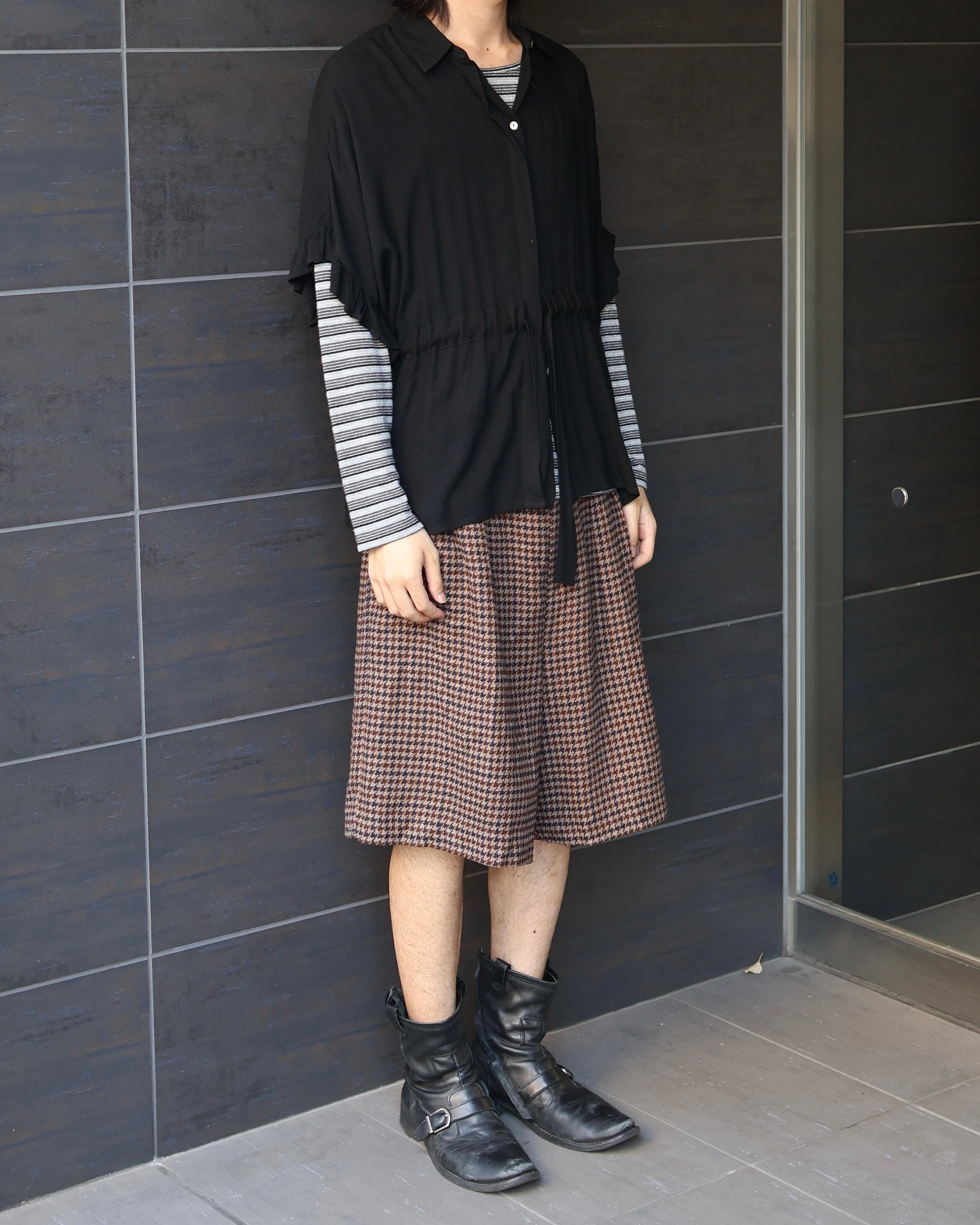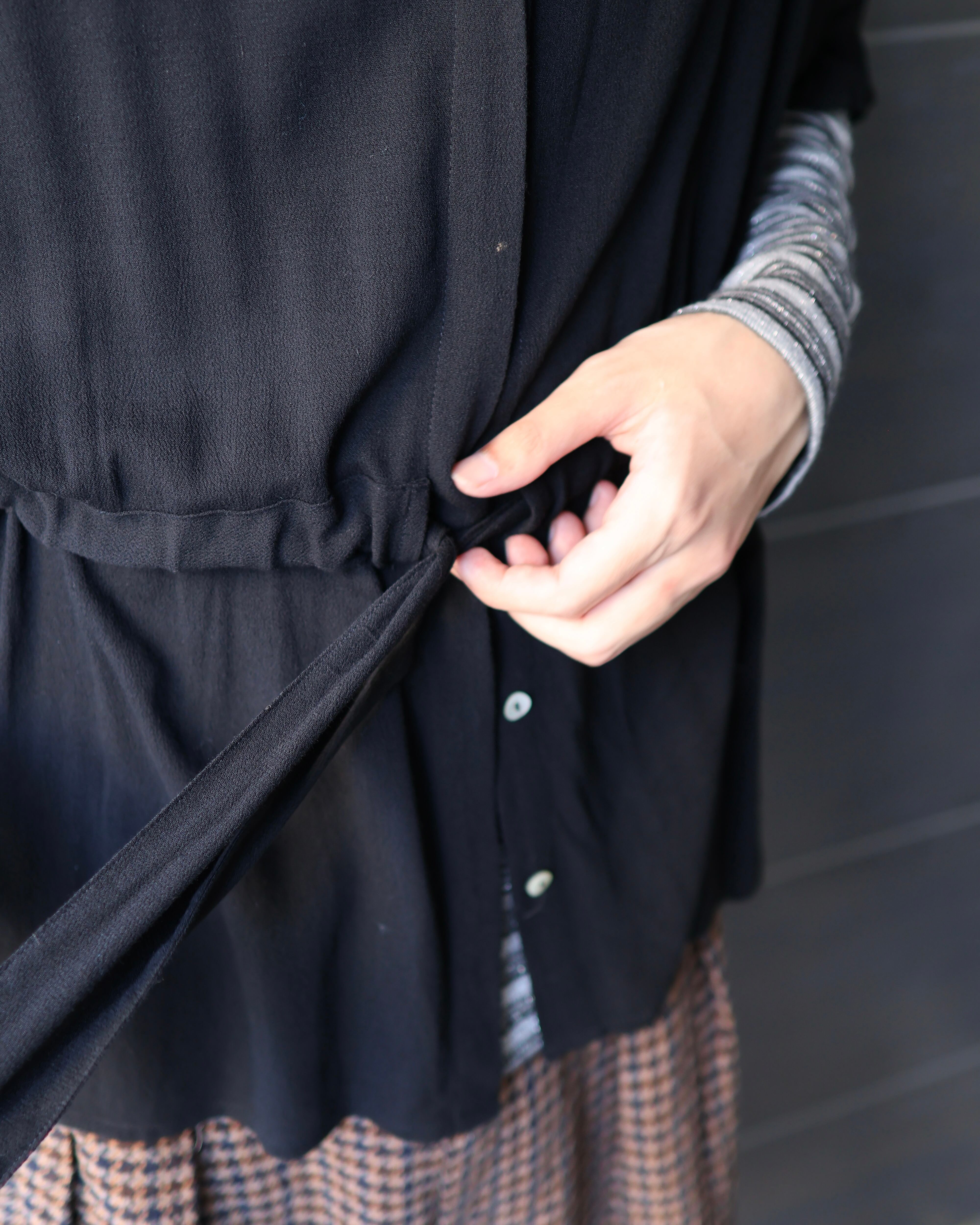 ベーシックなカラーリング、シルエットだがデザイン性やウエストの紐によるシルエット変化によってさまざまな着こなしが可能なアイテム。