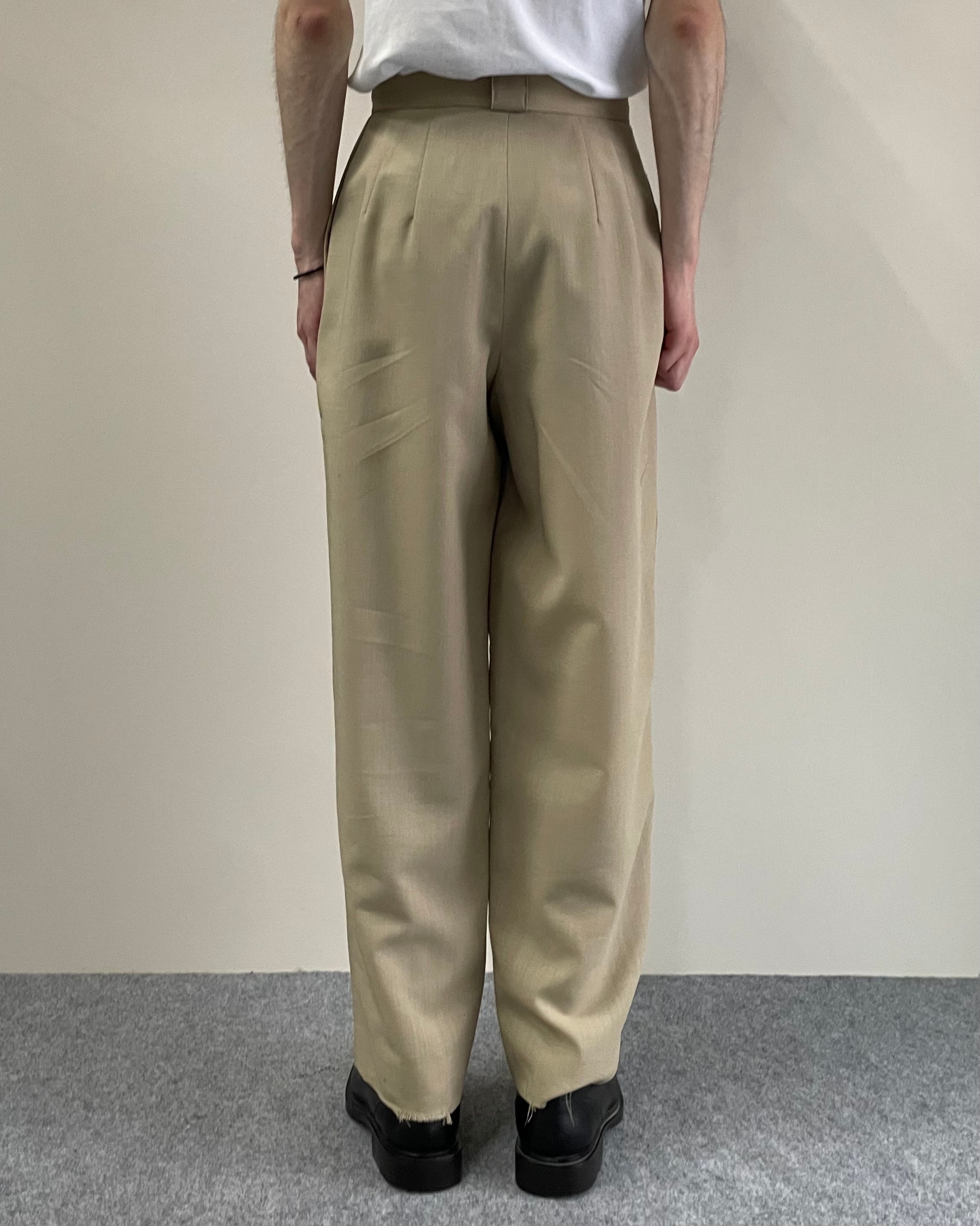 Diorのタック入りパンツで、シンプルながらも上品さが際立つ一本。フロントに施されたタックによって程よい立体感が生まれ、リラックスしたシルエットながらも端正な印象を保っているアイテム。素材はやや光沢感のある上質なウール素材が使用されており、しなやかなドレープと通気性の良さを兼ね備えた仕上がり