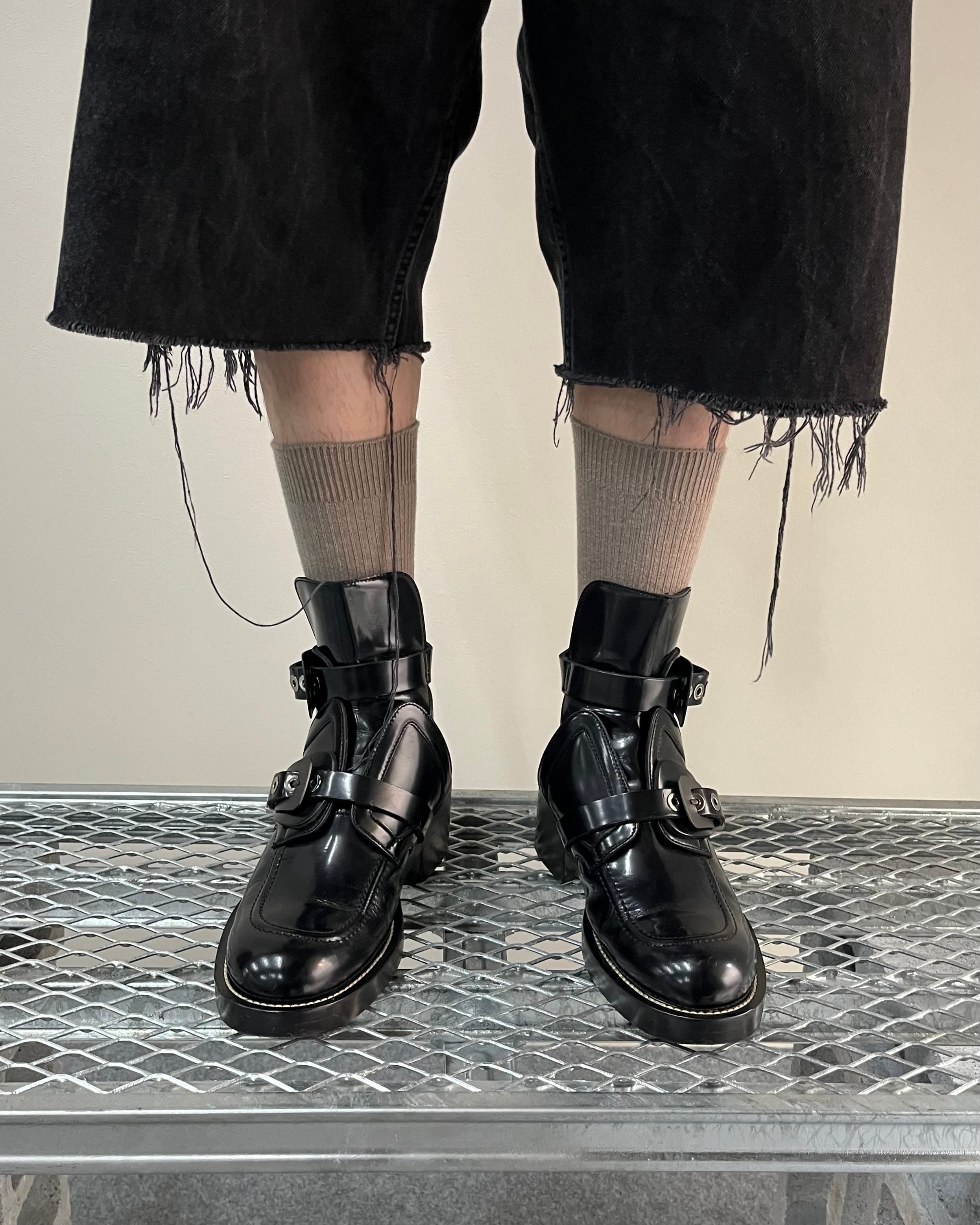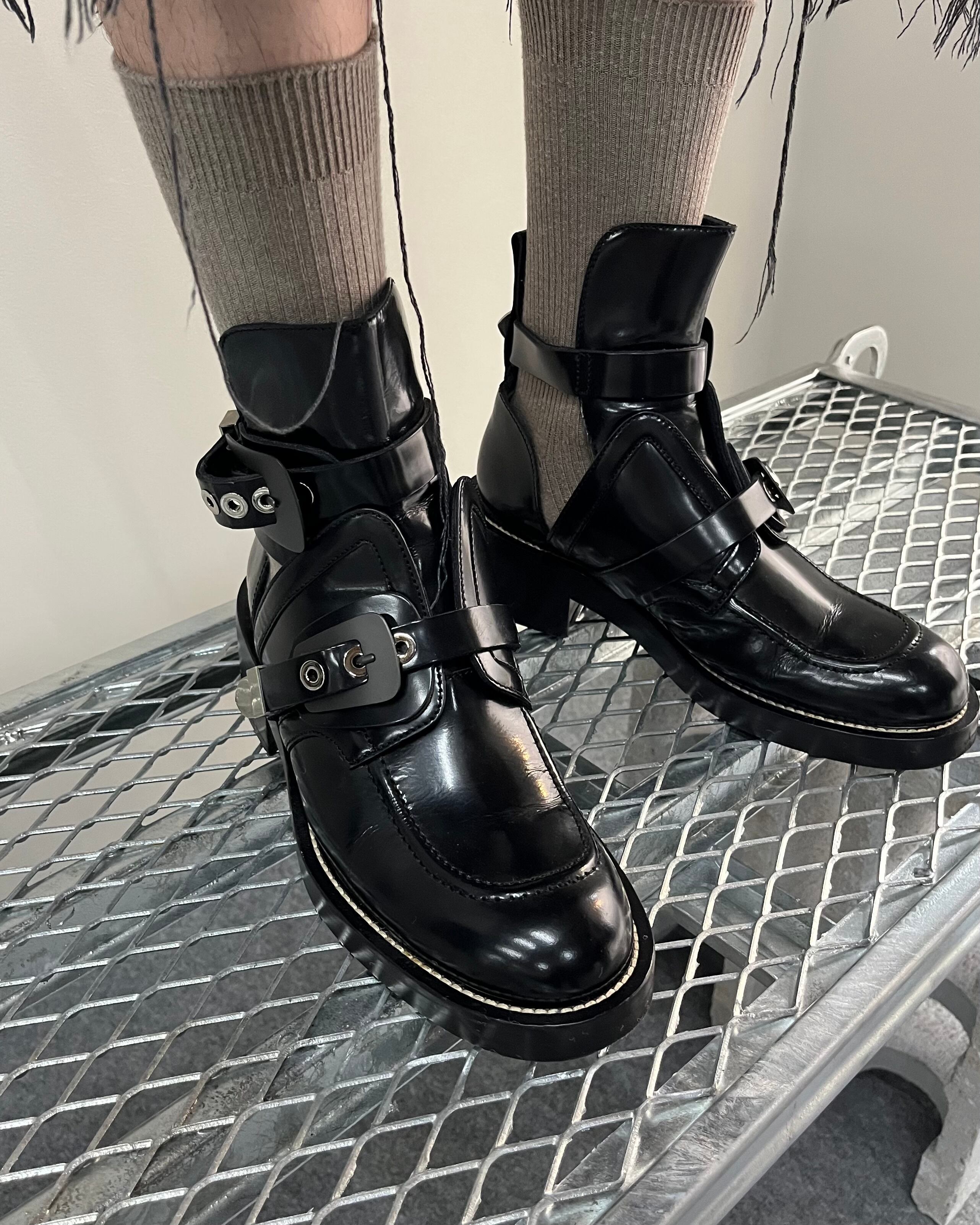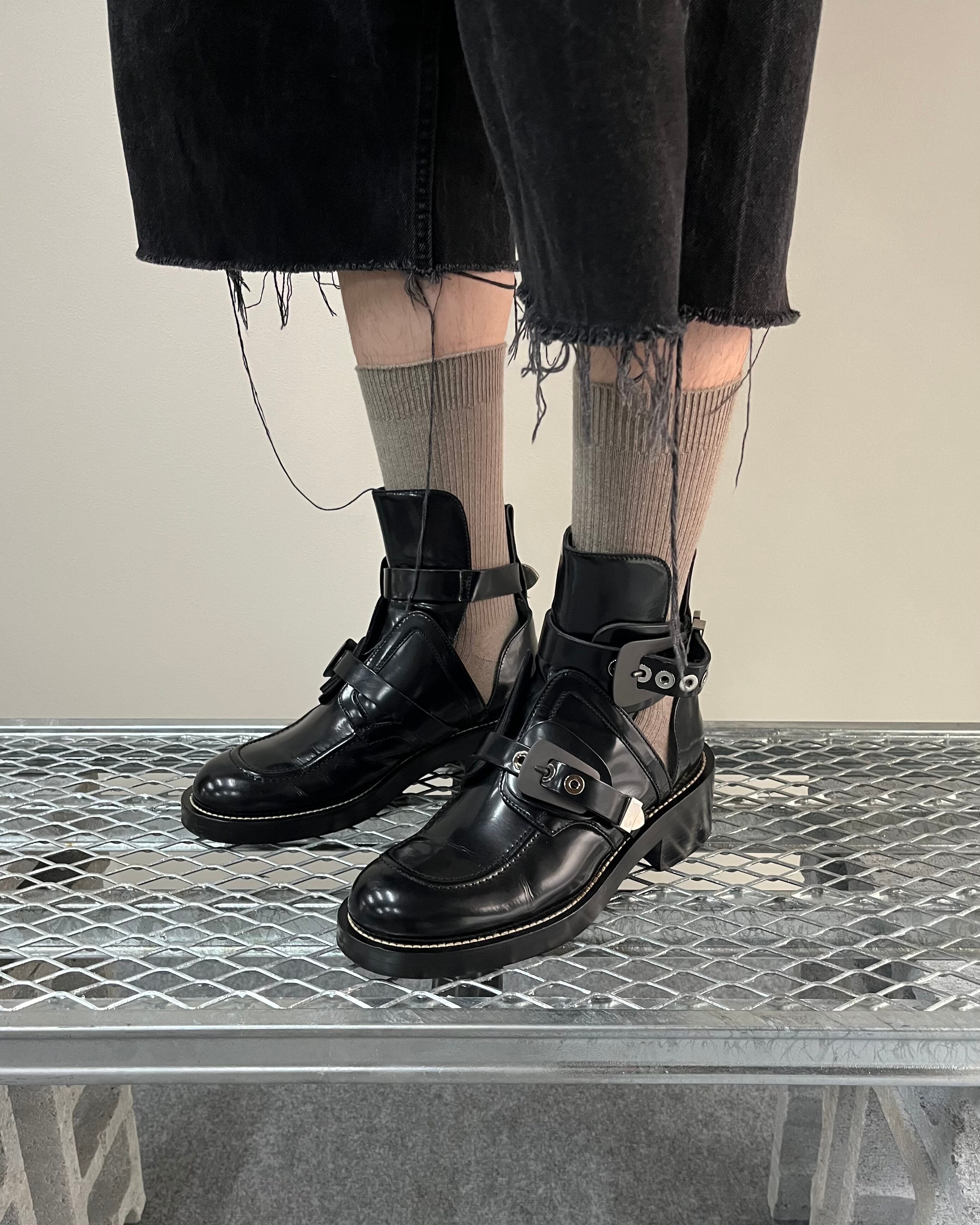 アンクル部分の開口デザインやストラップのディテールが個性的で、ハイファッションとストリート要素を融合させた一足