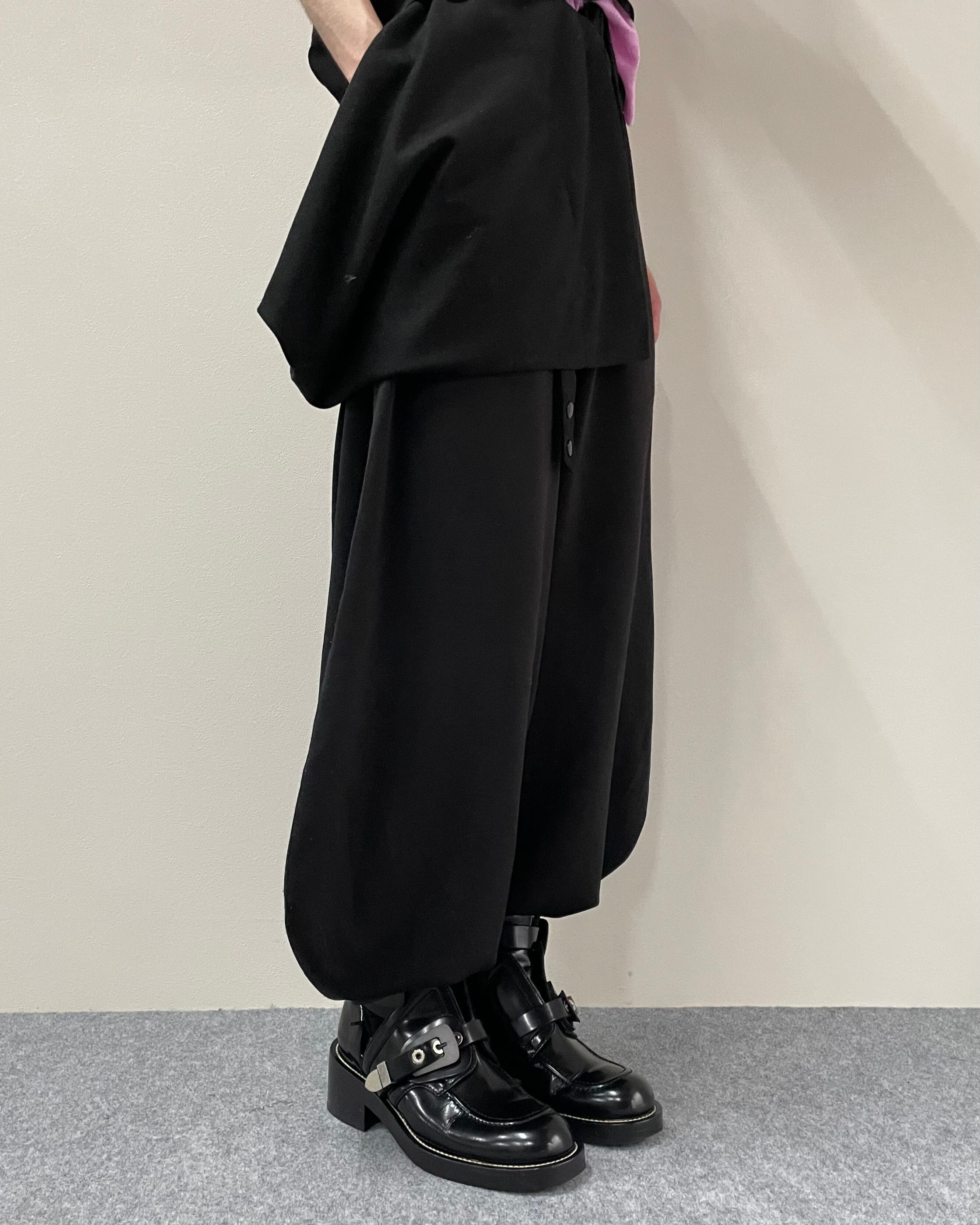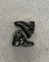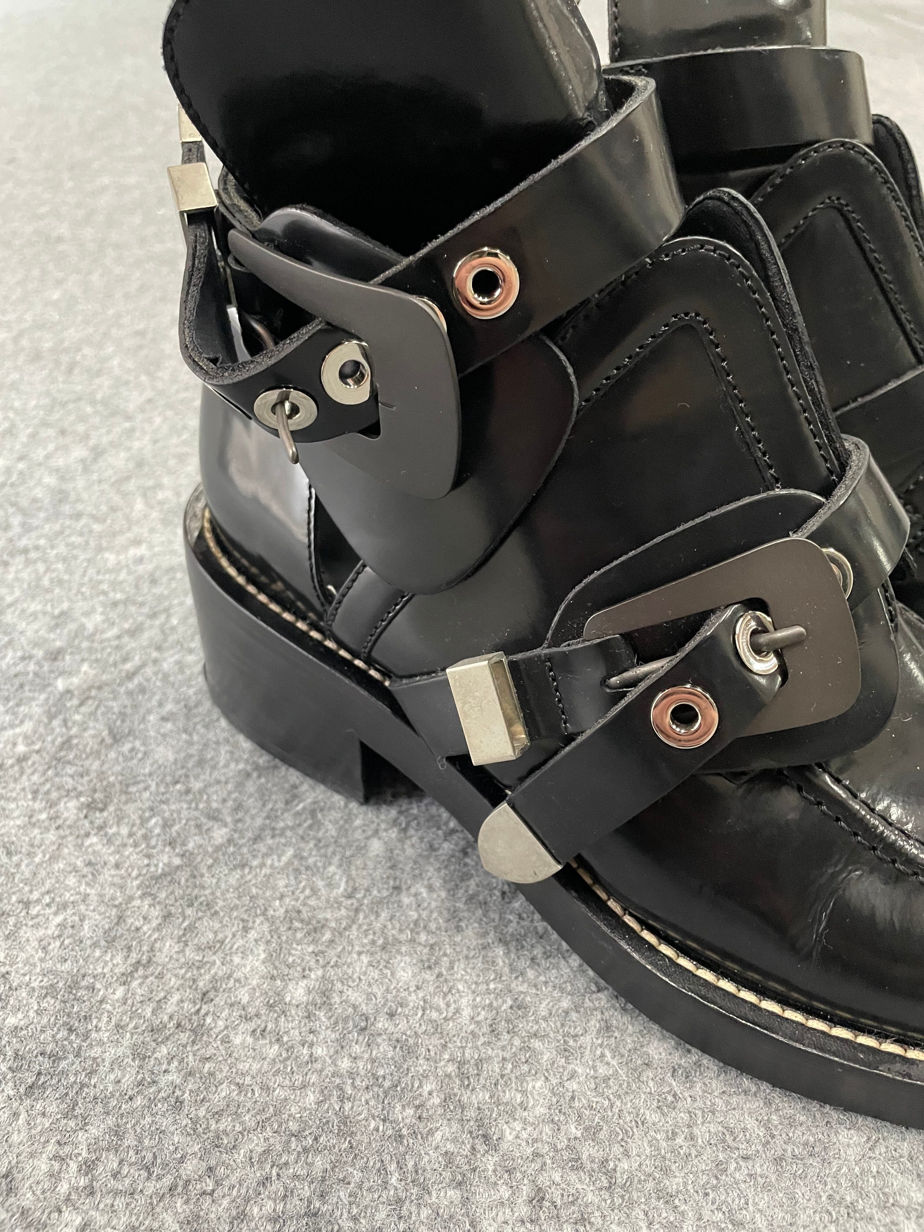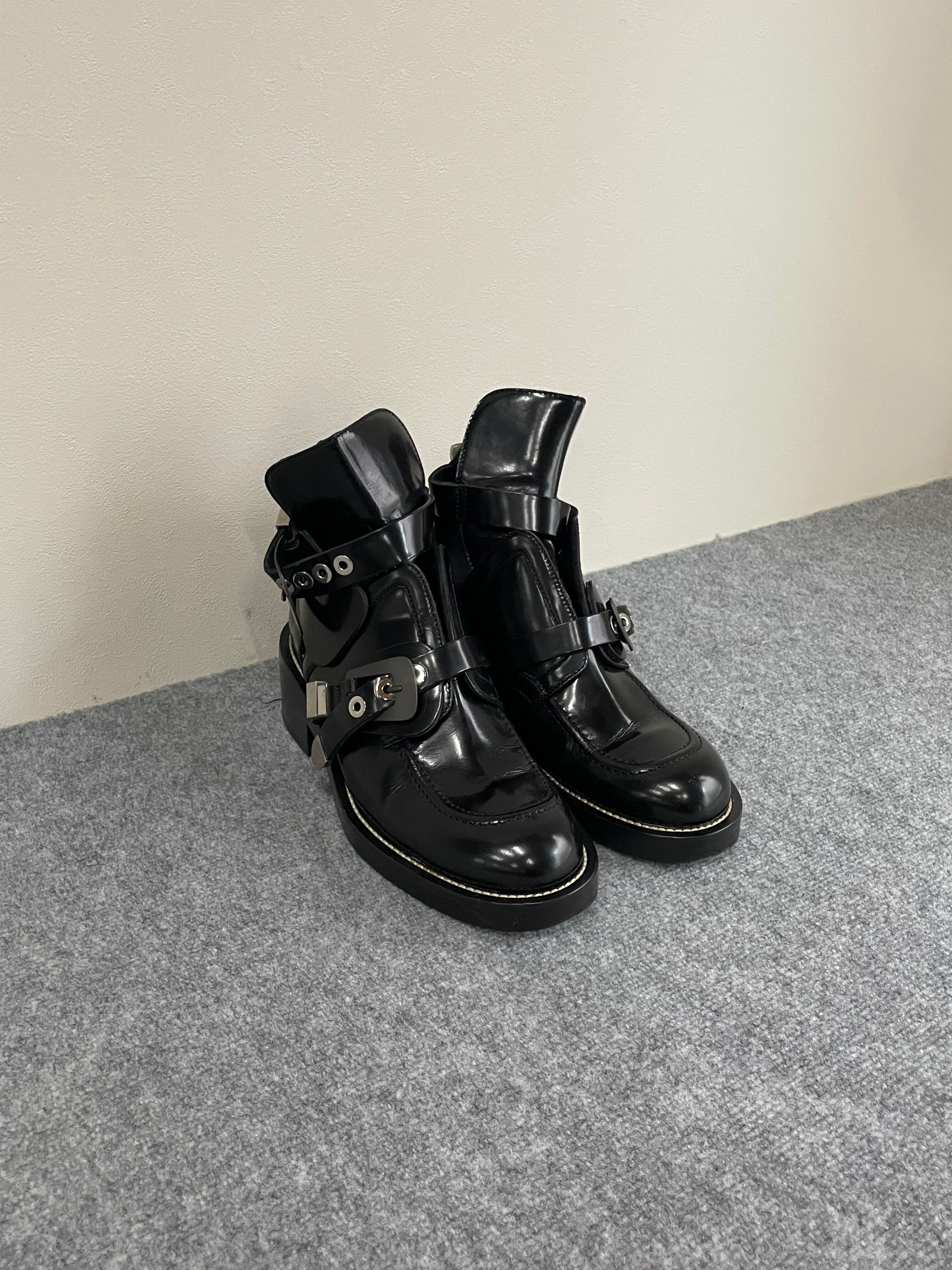 アンクル部分の開口デザインやストラップのディテールが個性的で、ハイファッションとストリート要素を融合させた一足