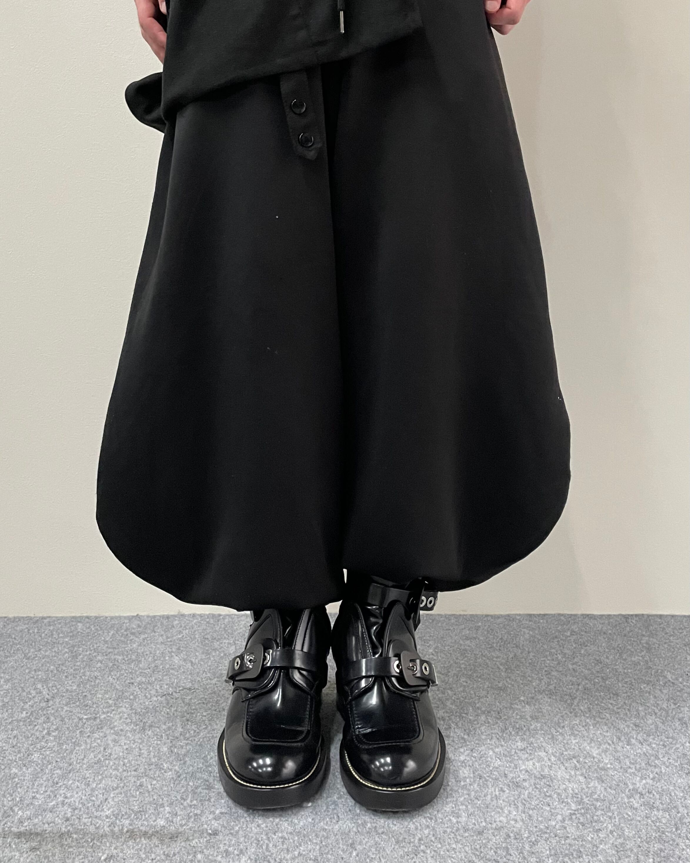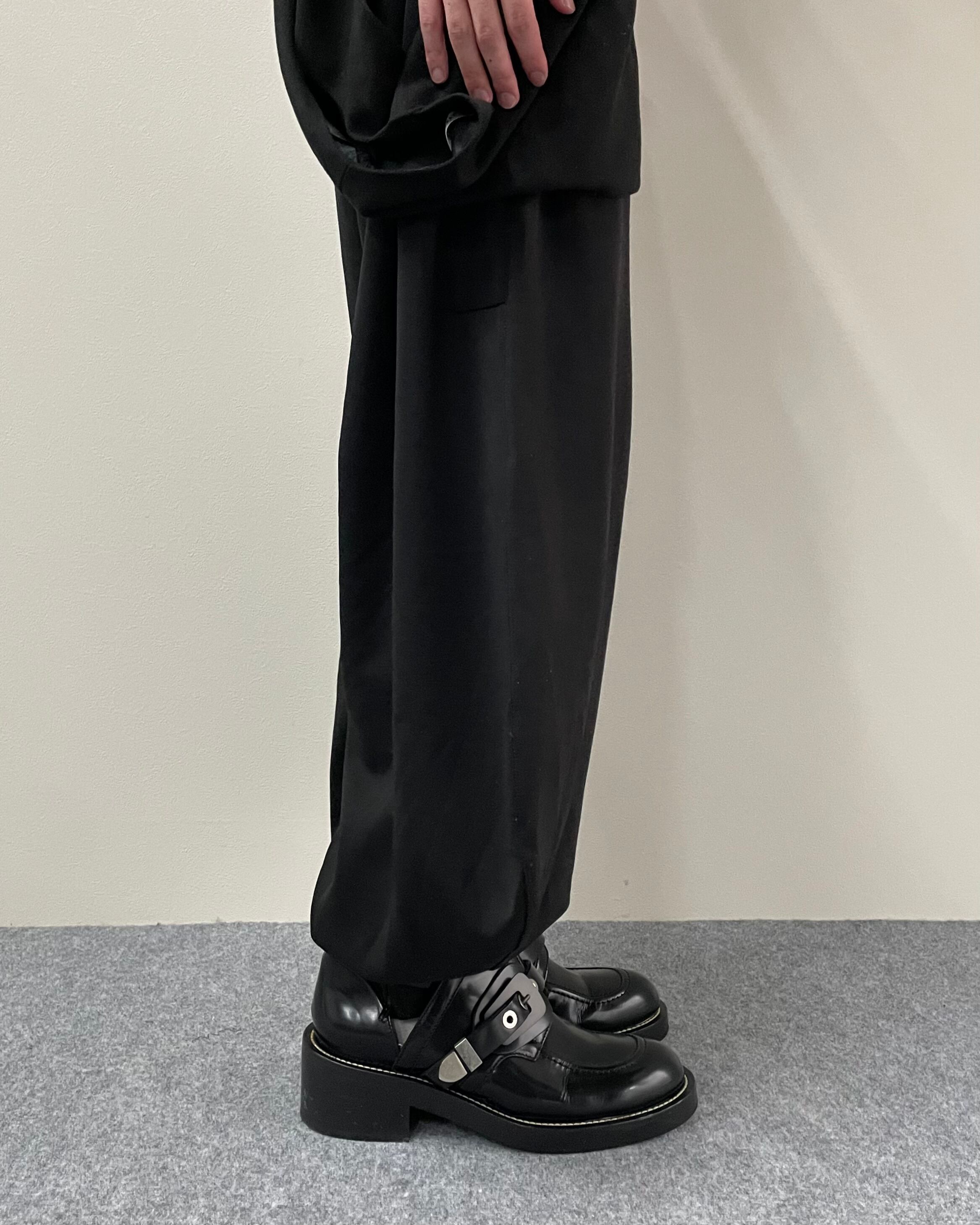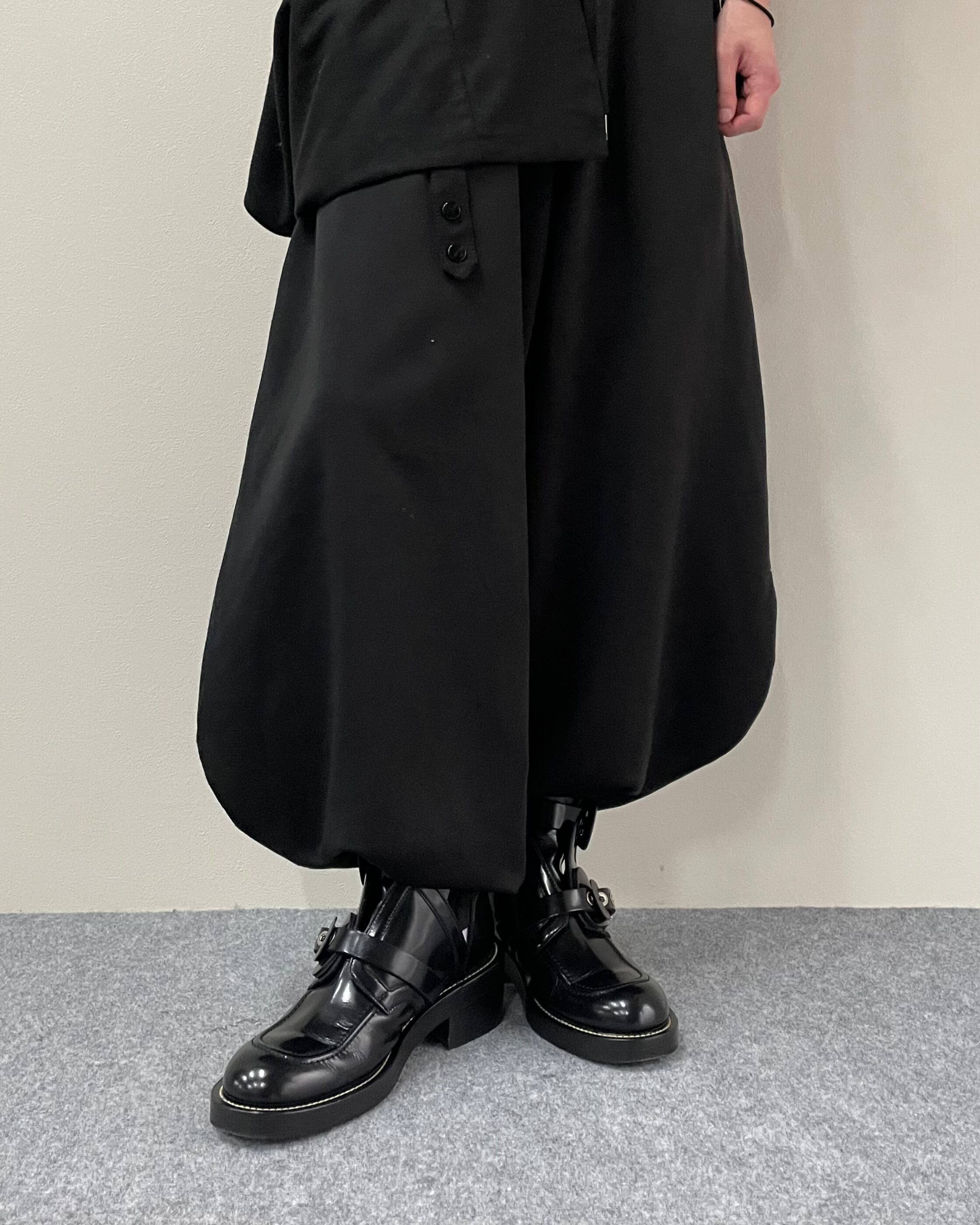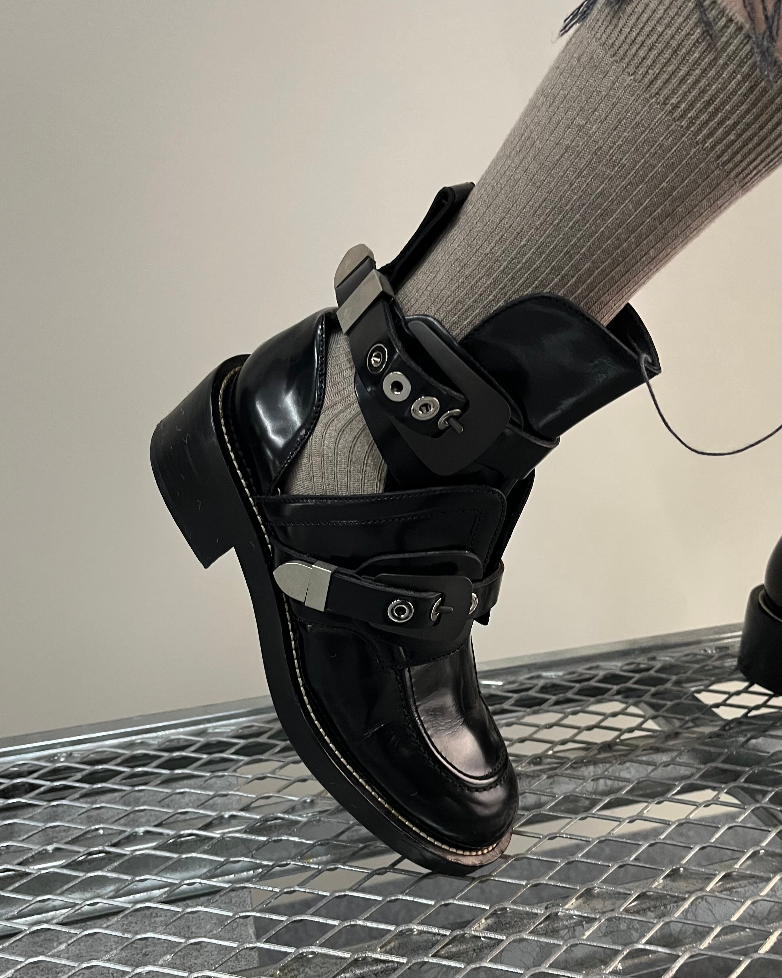 レザー素材にメタルバックルやアイレットが大胆に配置され、重厚感のあるソールと組み合わさることで、エッジの効いた印象を引き出せます。