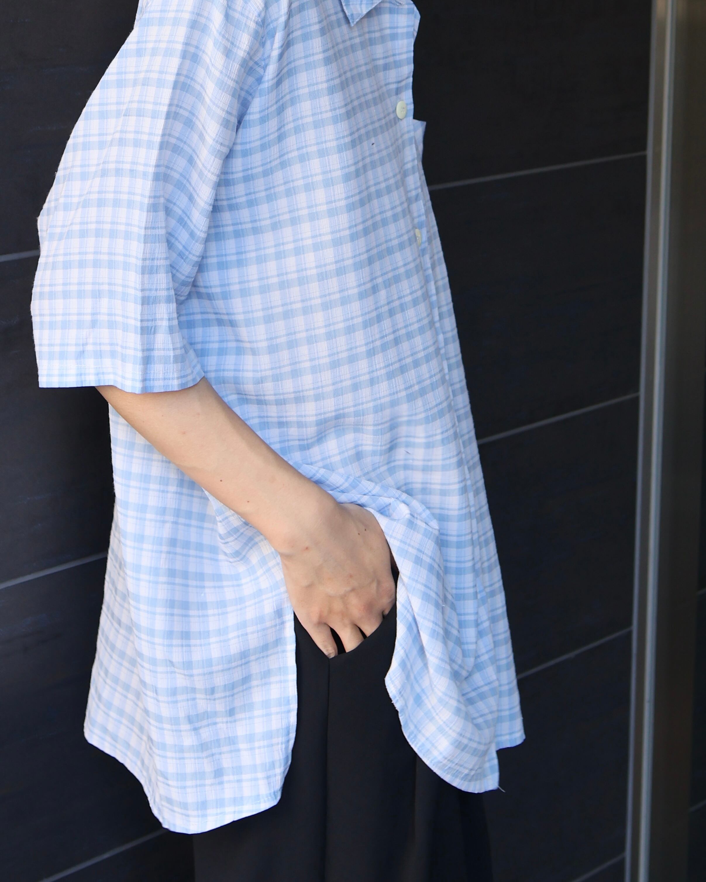 サイドスリットが入ったオーバーサイズシルエットのチェックシャツ