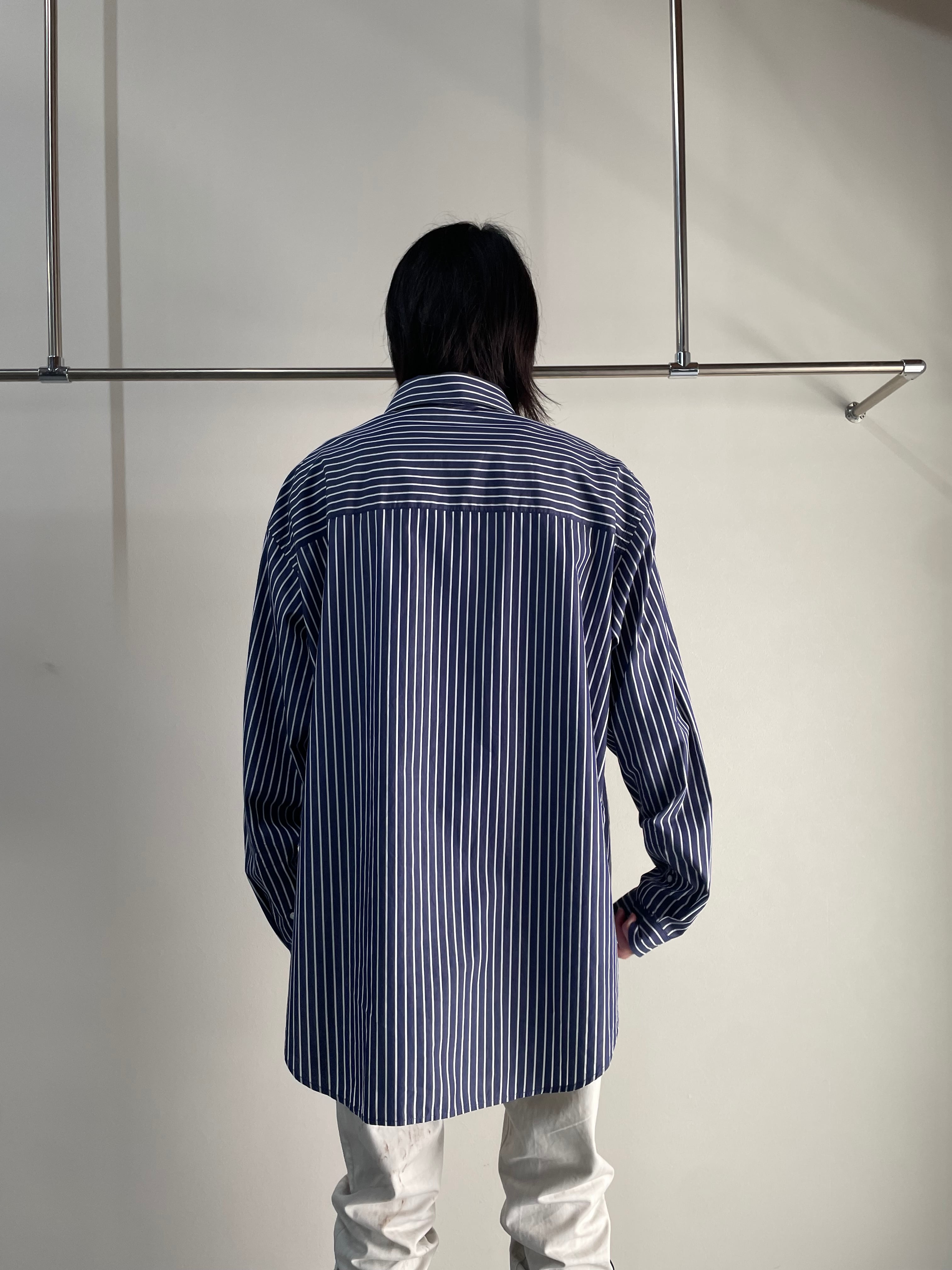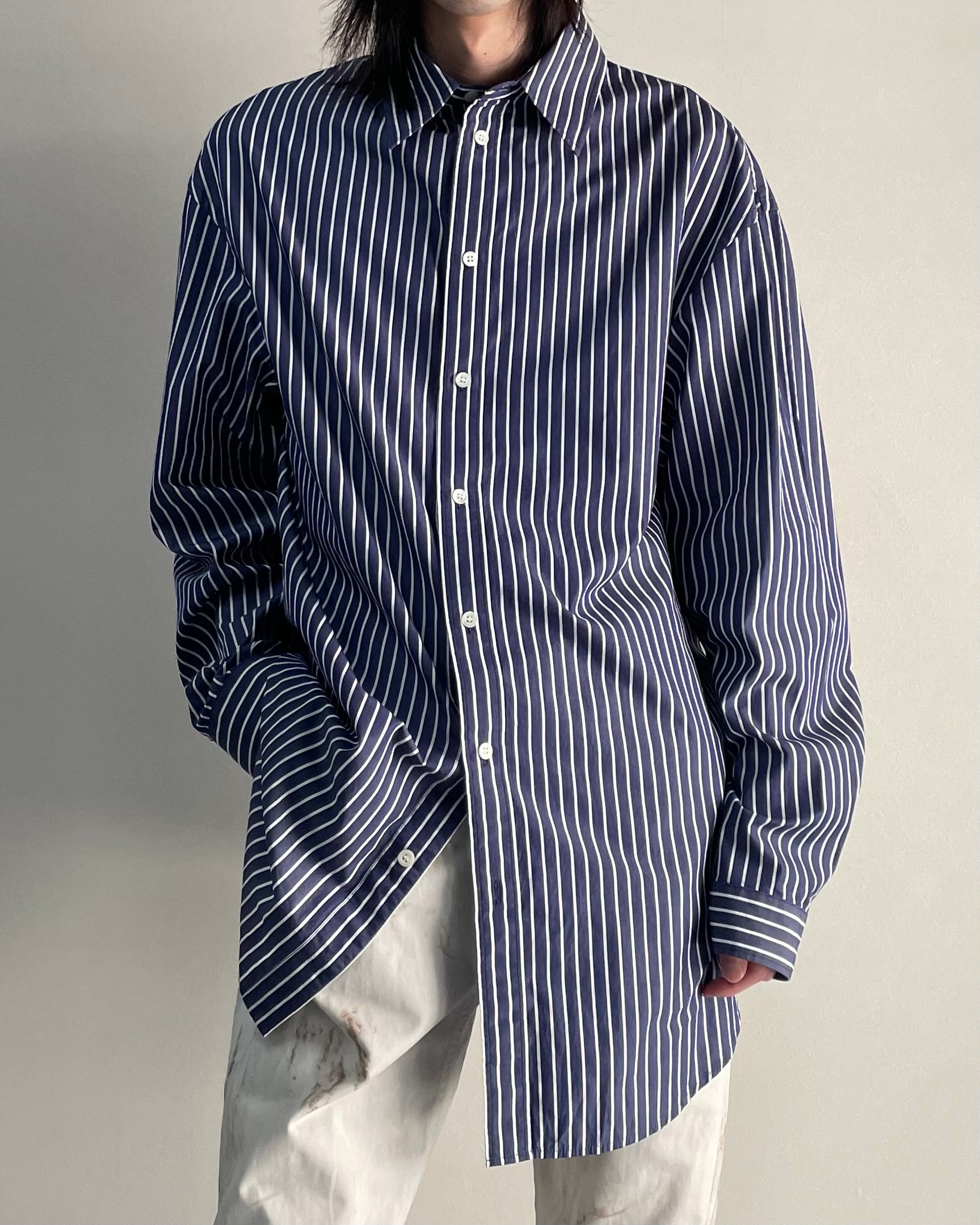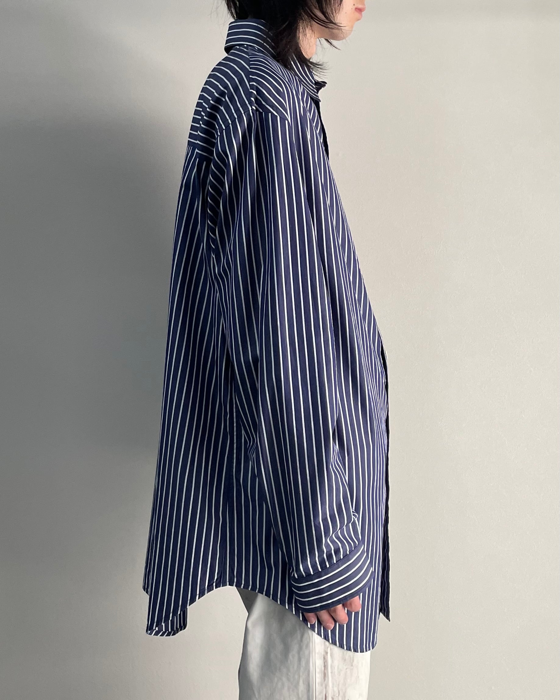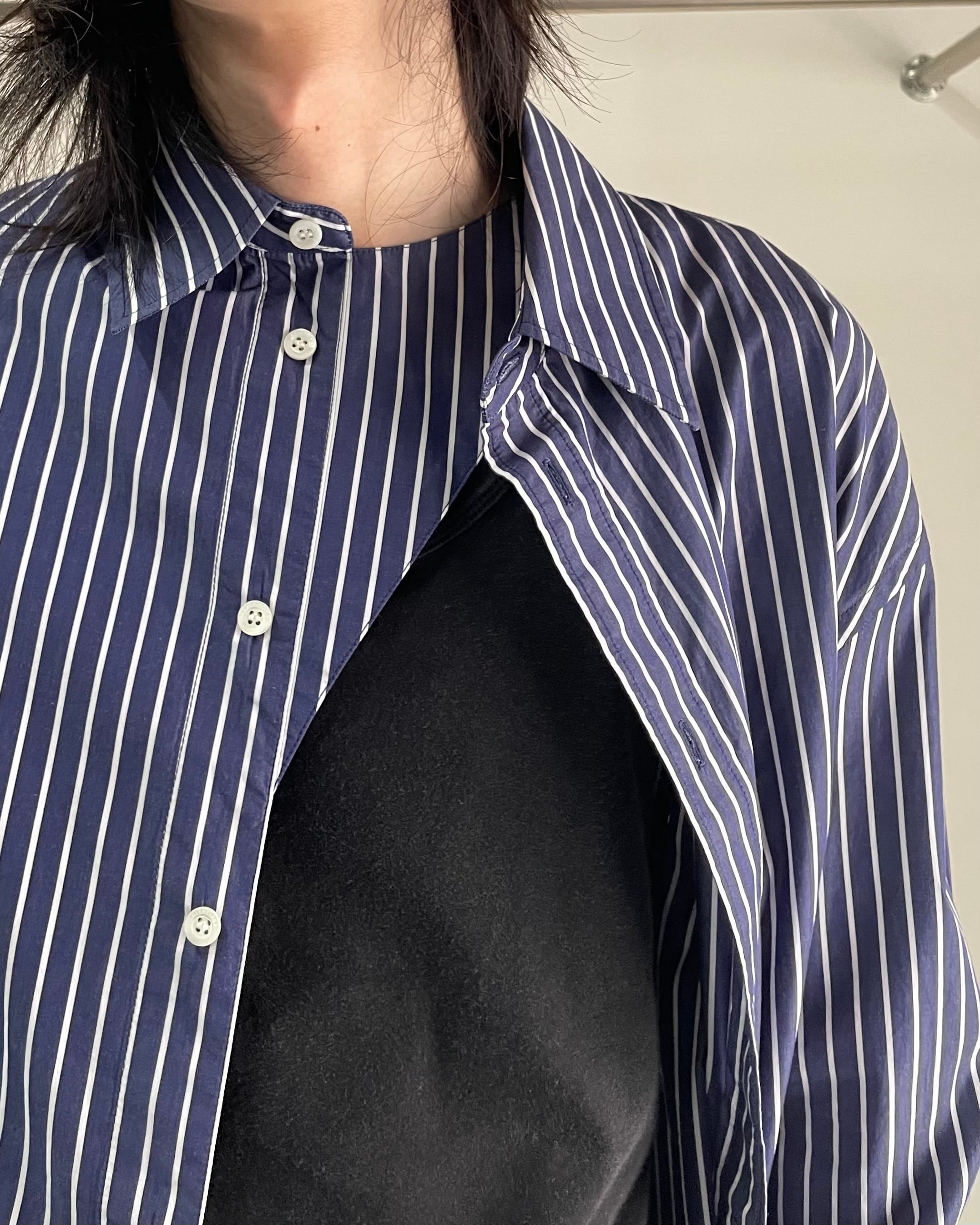 洗練されたネイビーにホワイトのストライプが特徴的で、ゆったりとしたオーバーサイズシルエットがモードな印象を与え、レイヤードにも最適。