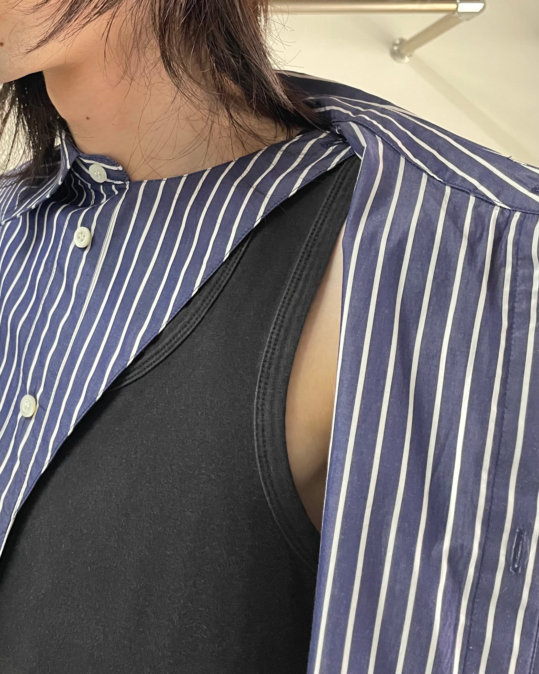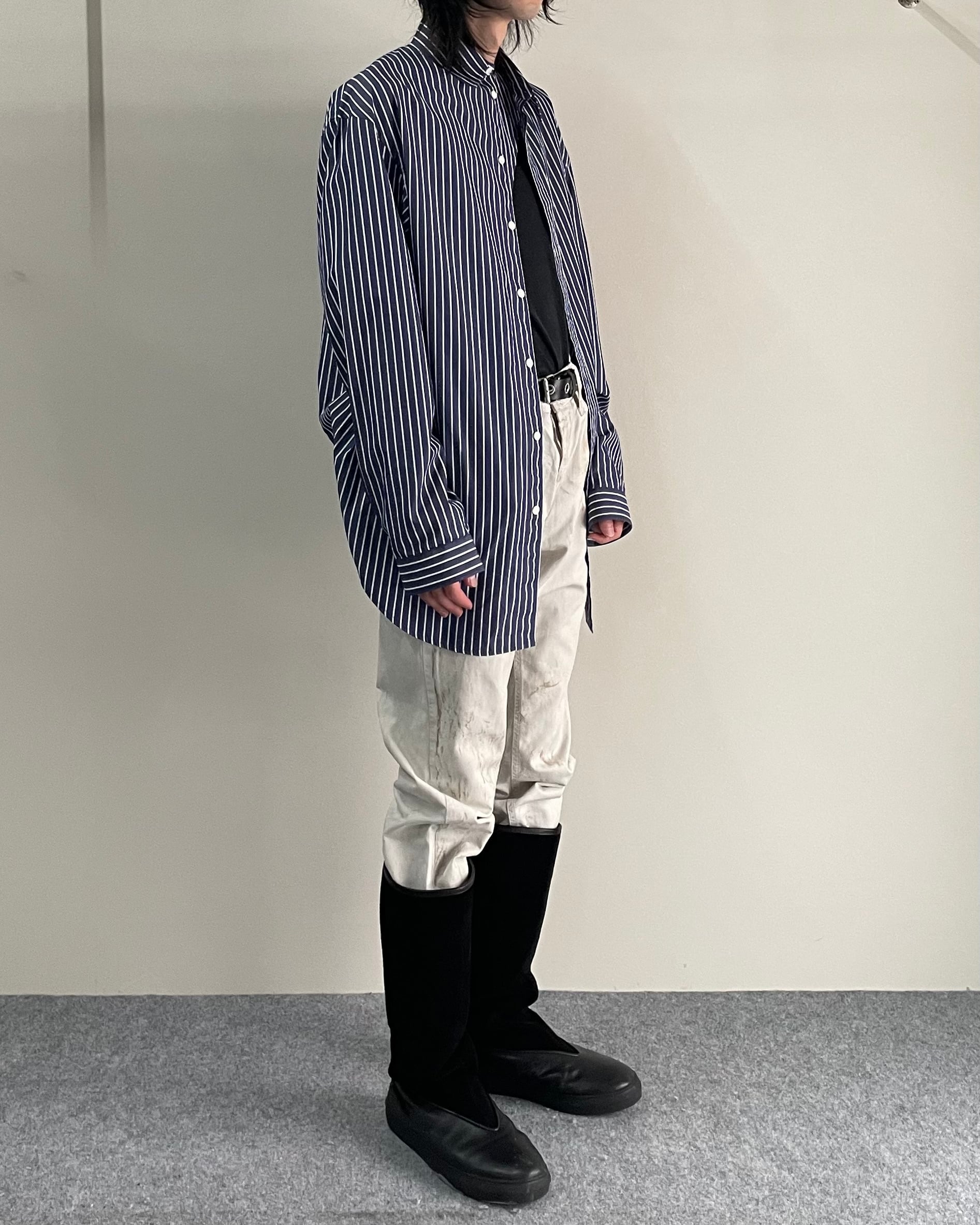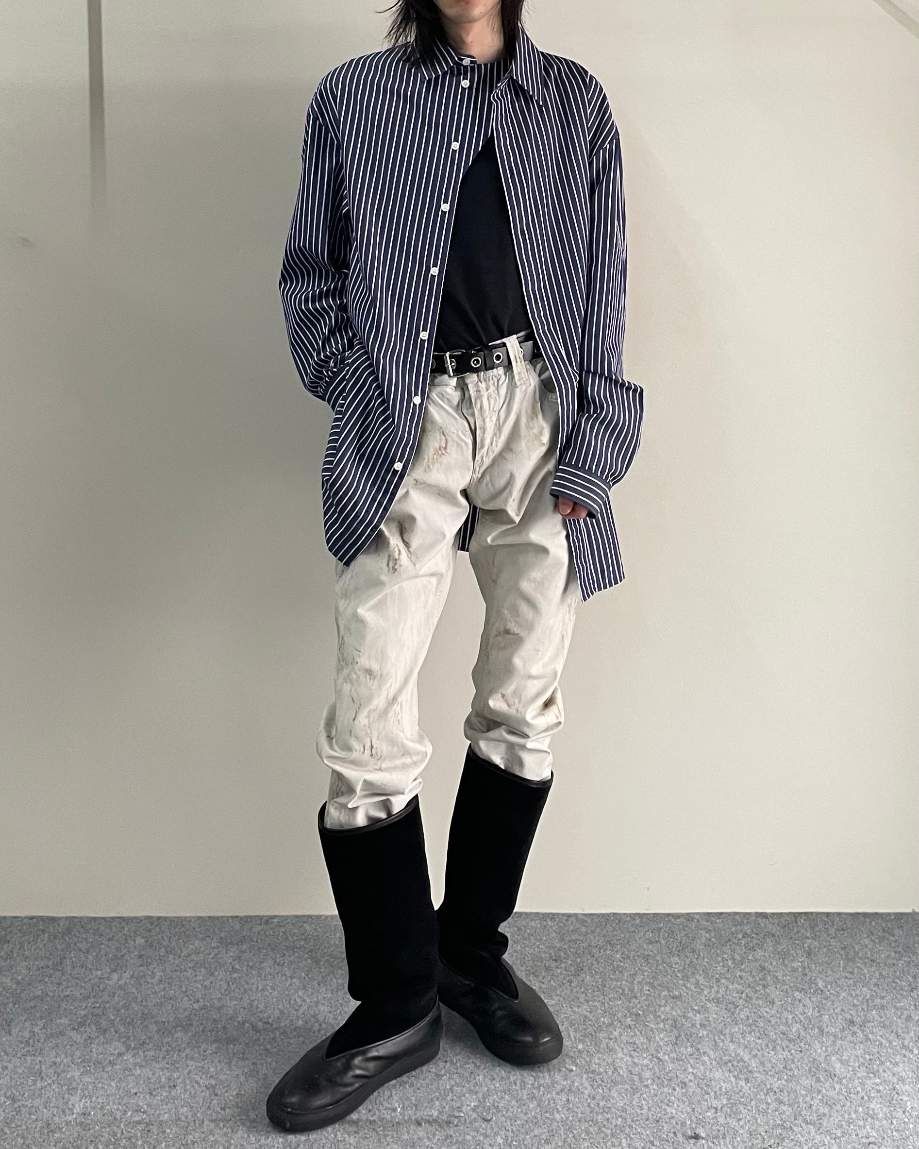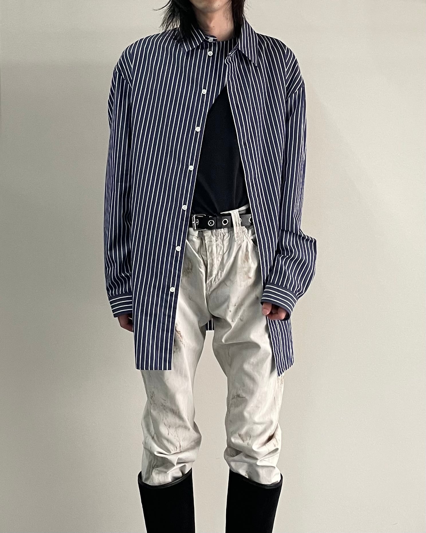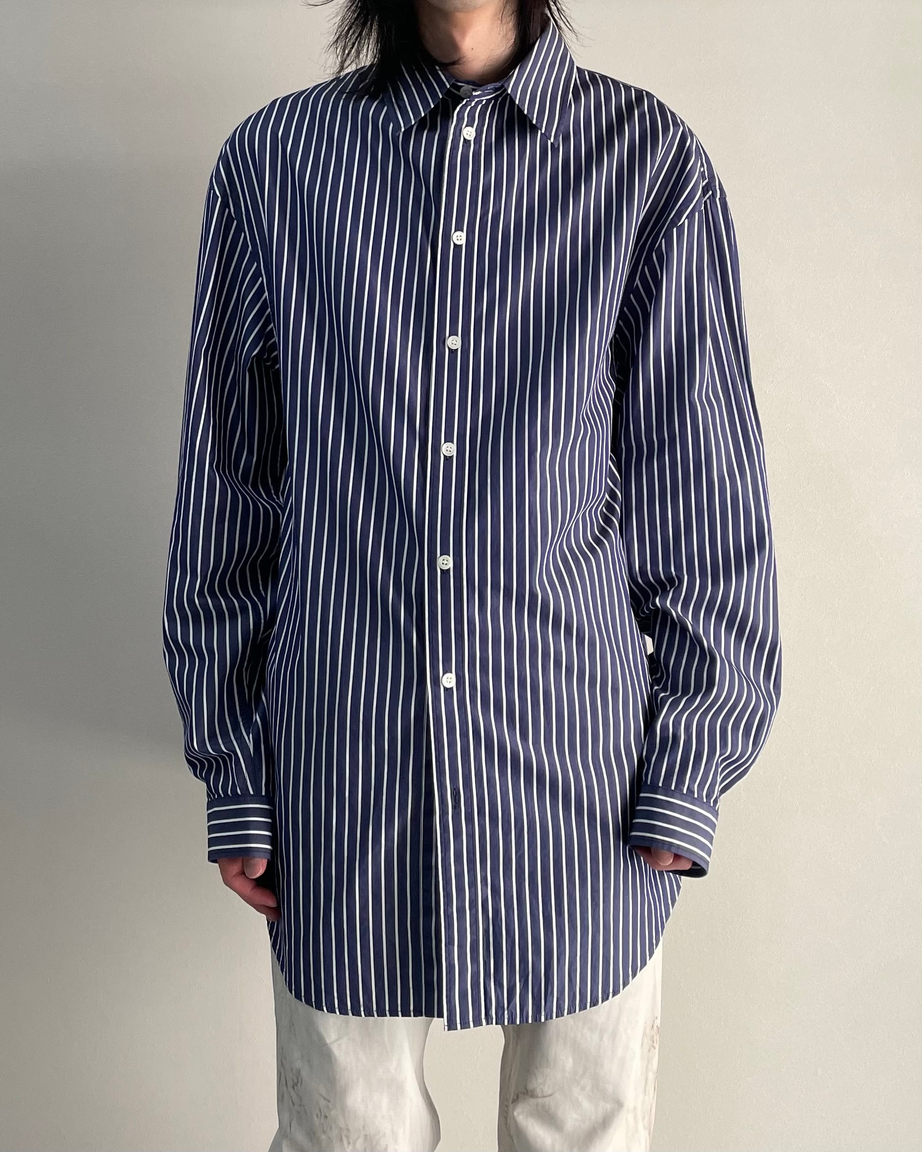 洗練されたネイビーにホワイトのストライプが特徴的で、ゆったりとしたオーバーサイズシルエットがモードな印象を与え、レイヤードにも最適。
