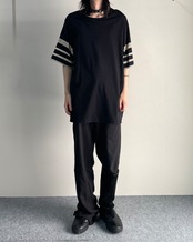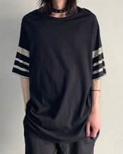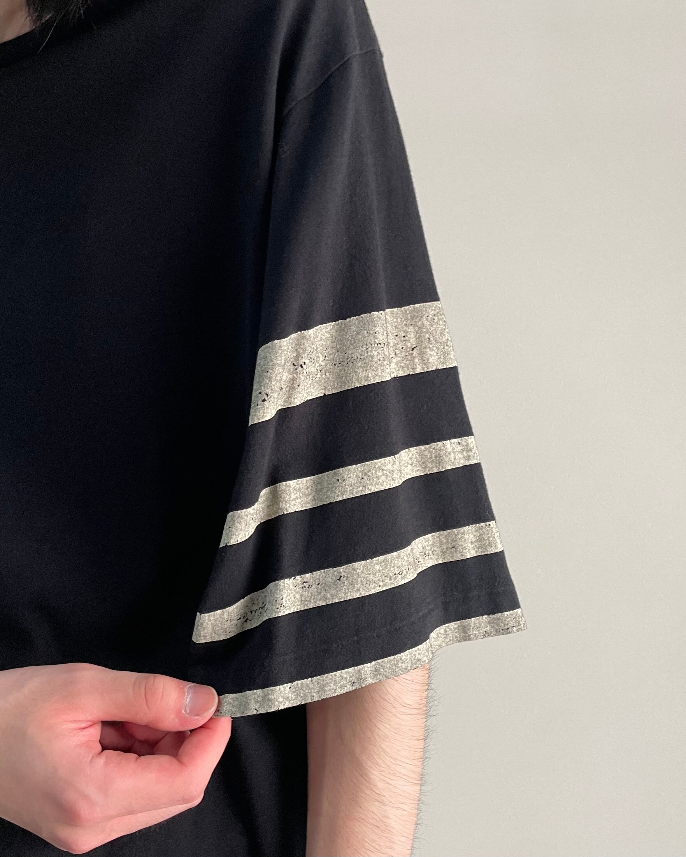 袖部分のプリントされたラインデザインが特徴的で、モードな印象にラフさを兼ね備えた汎用性の高いカットソー