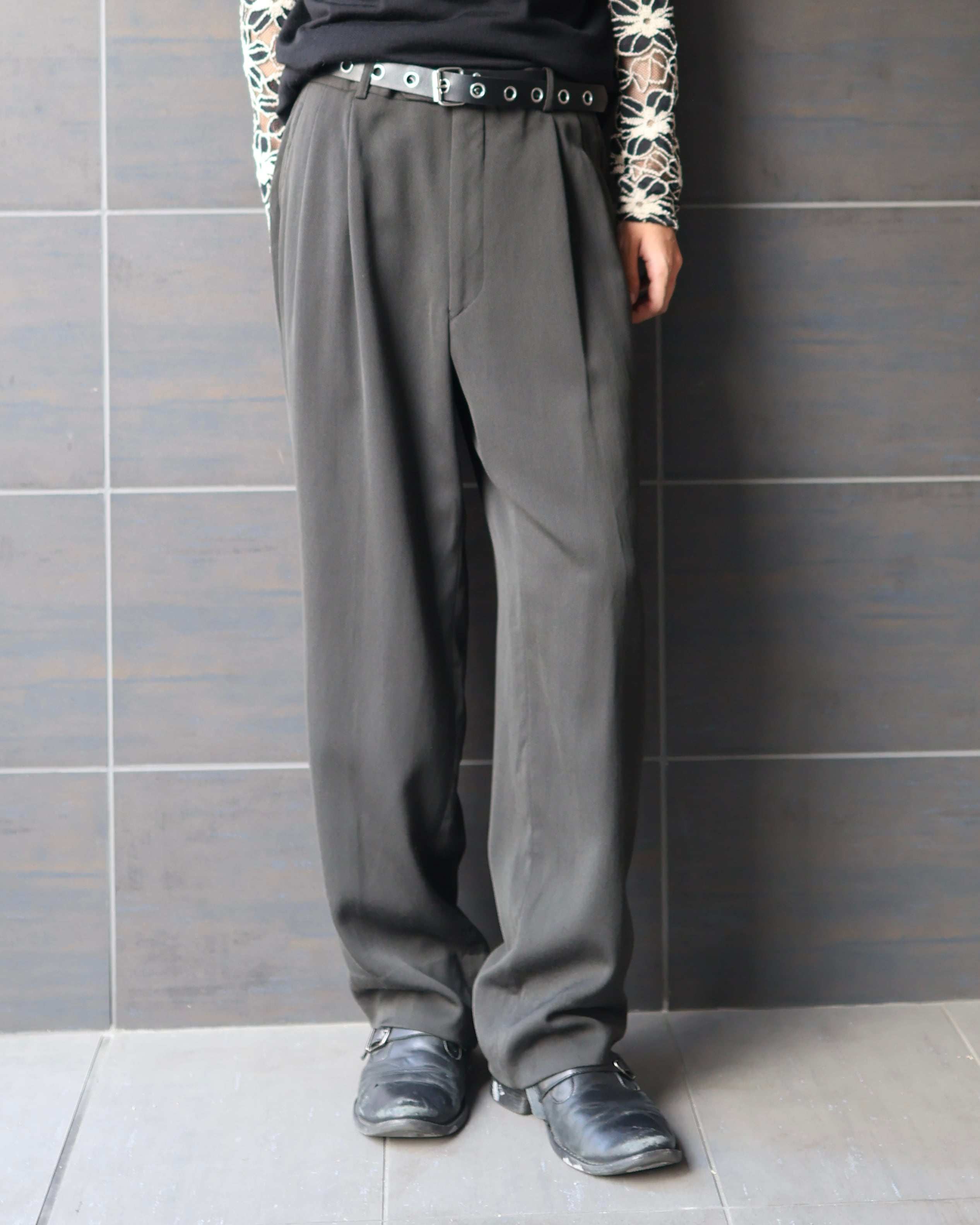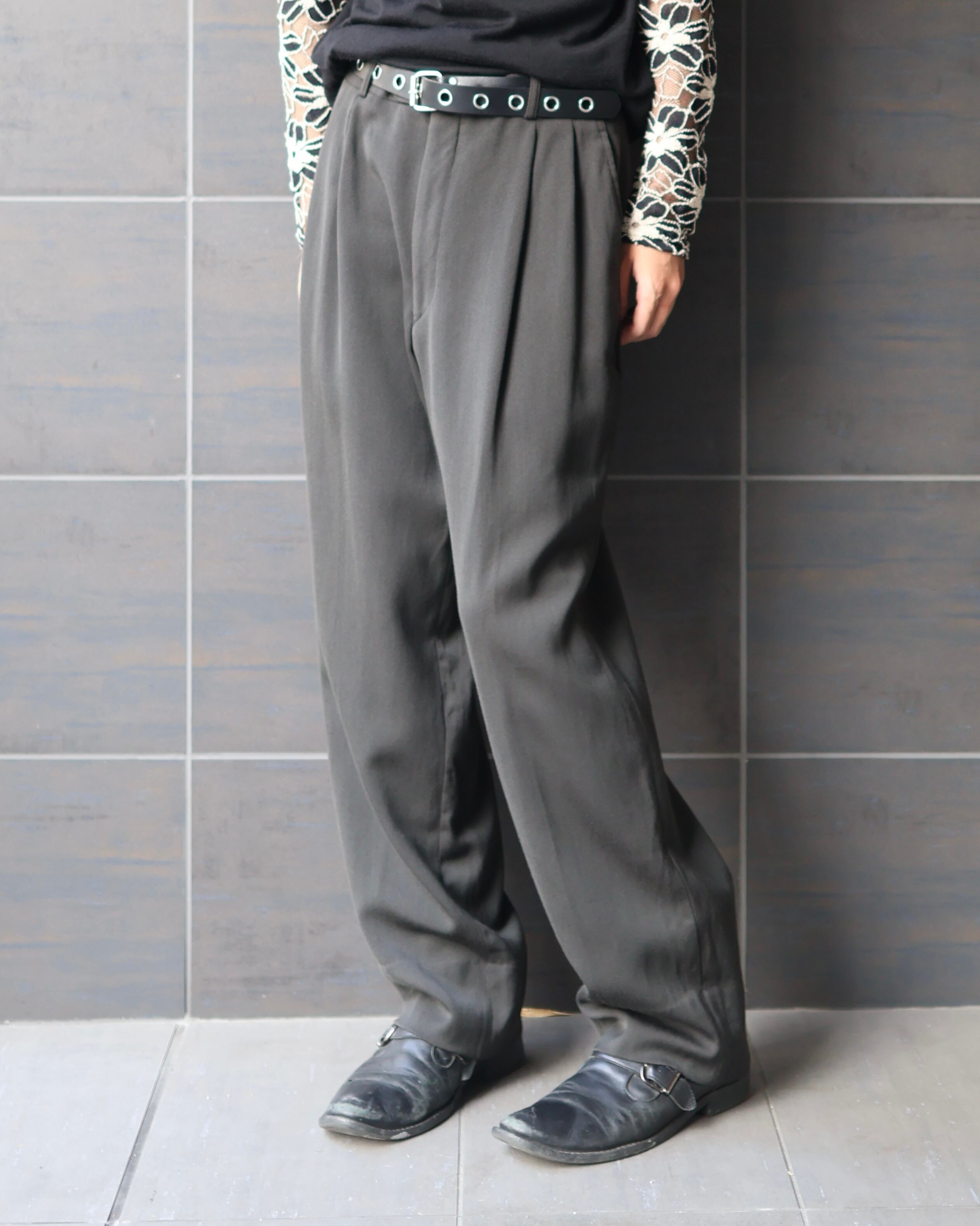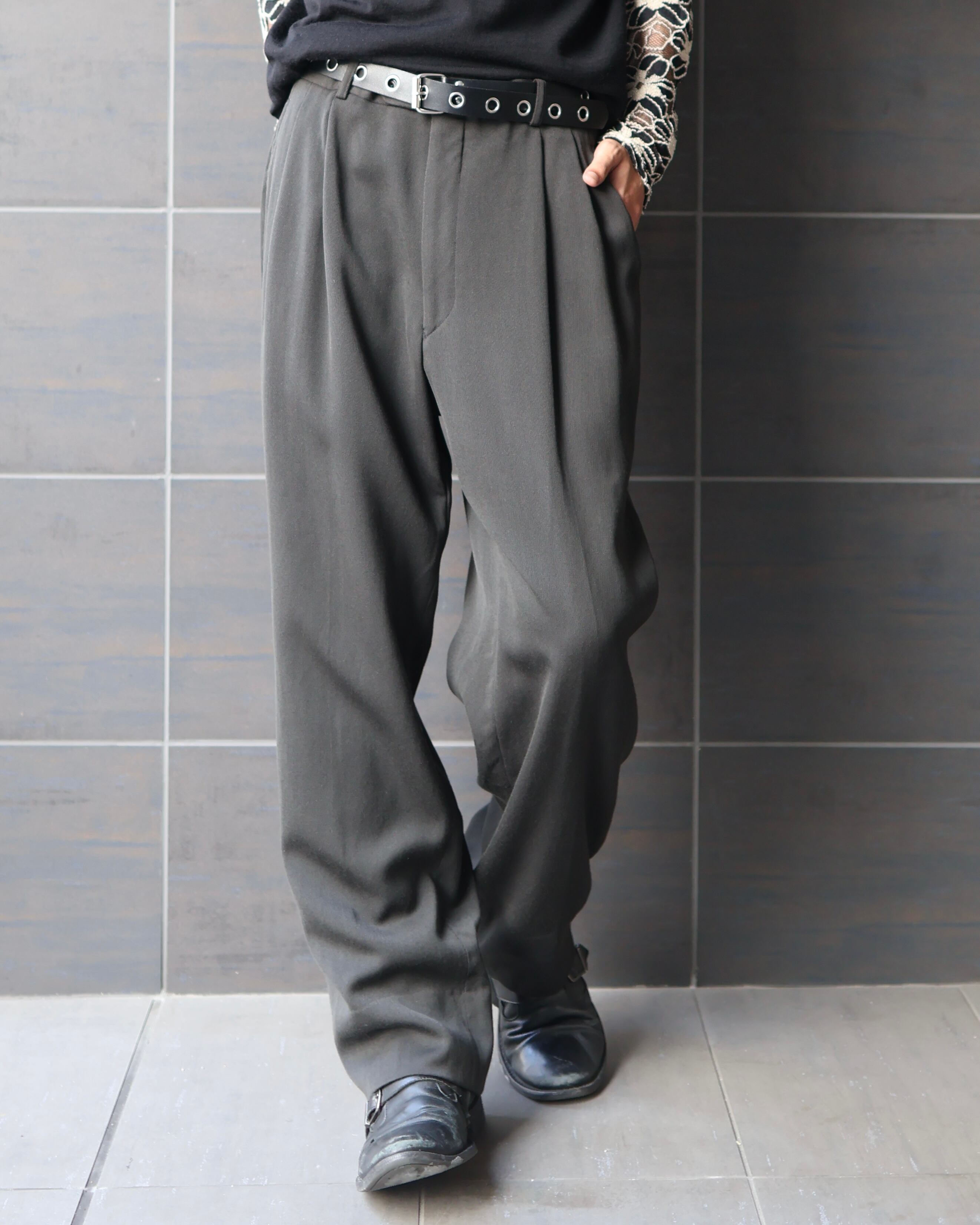 Christian Diorの2タックグレーウールスラックス。上質なウール素材を使用し、しなやかな肌触りと美しい落ち感が特徴で深めに入った2タックが腰まわりに適度なゆとりをもたらしつつ、裾にかけてすっきりとテーパードされたシルエットが上品な印象を演出する1着