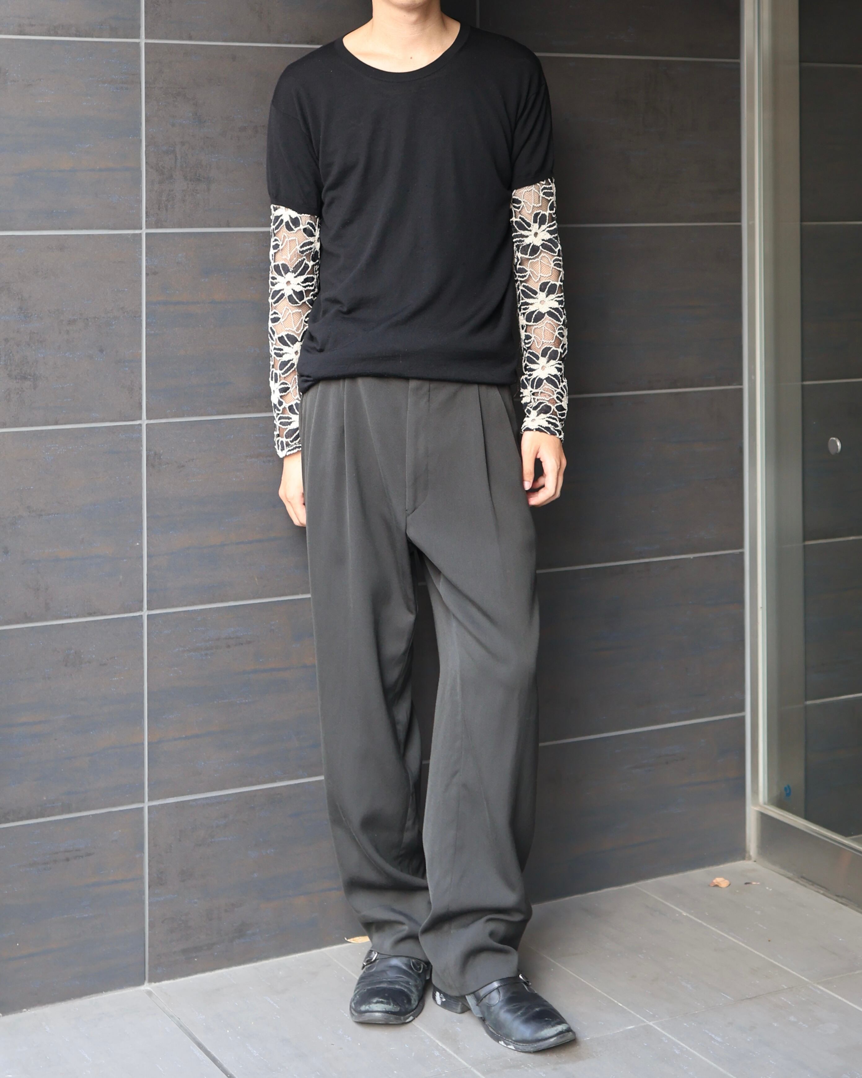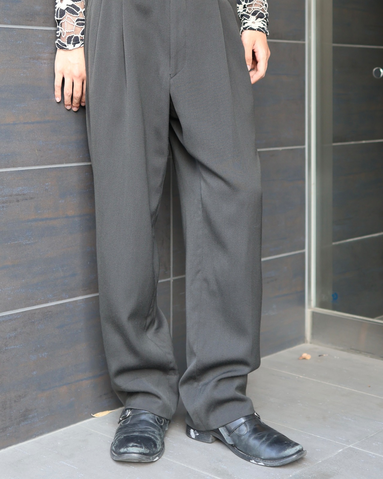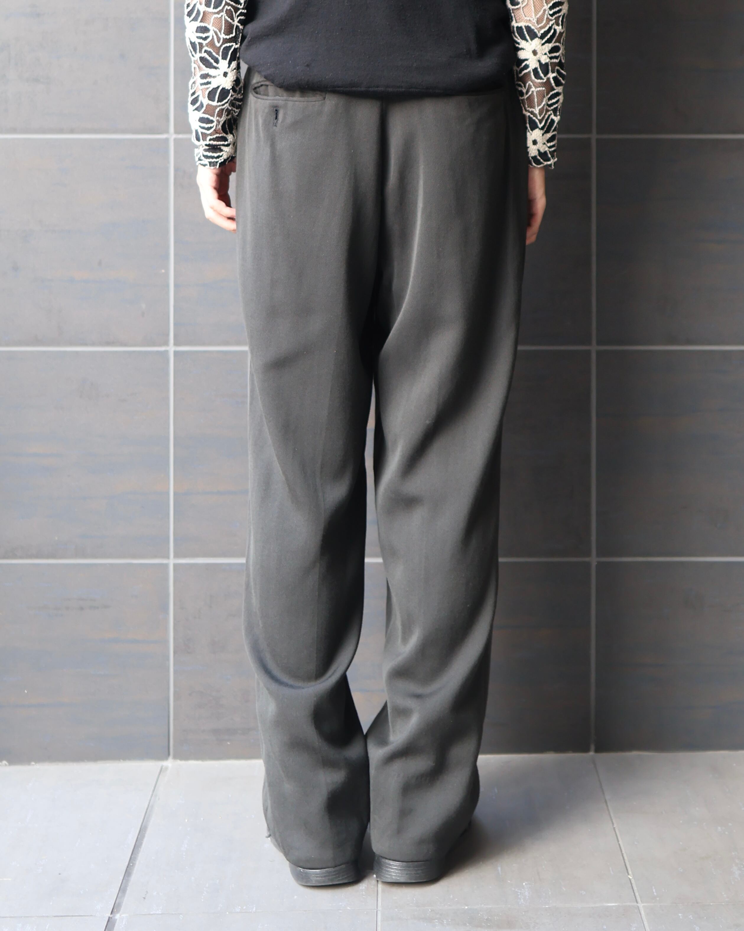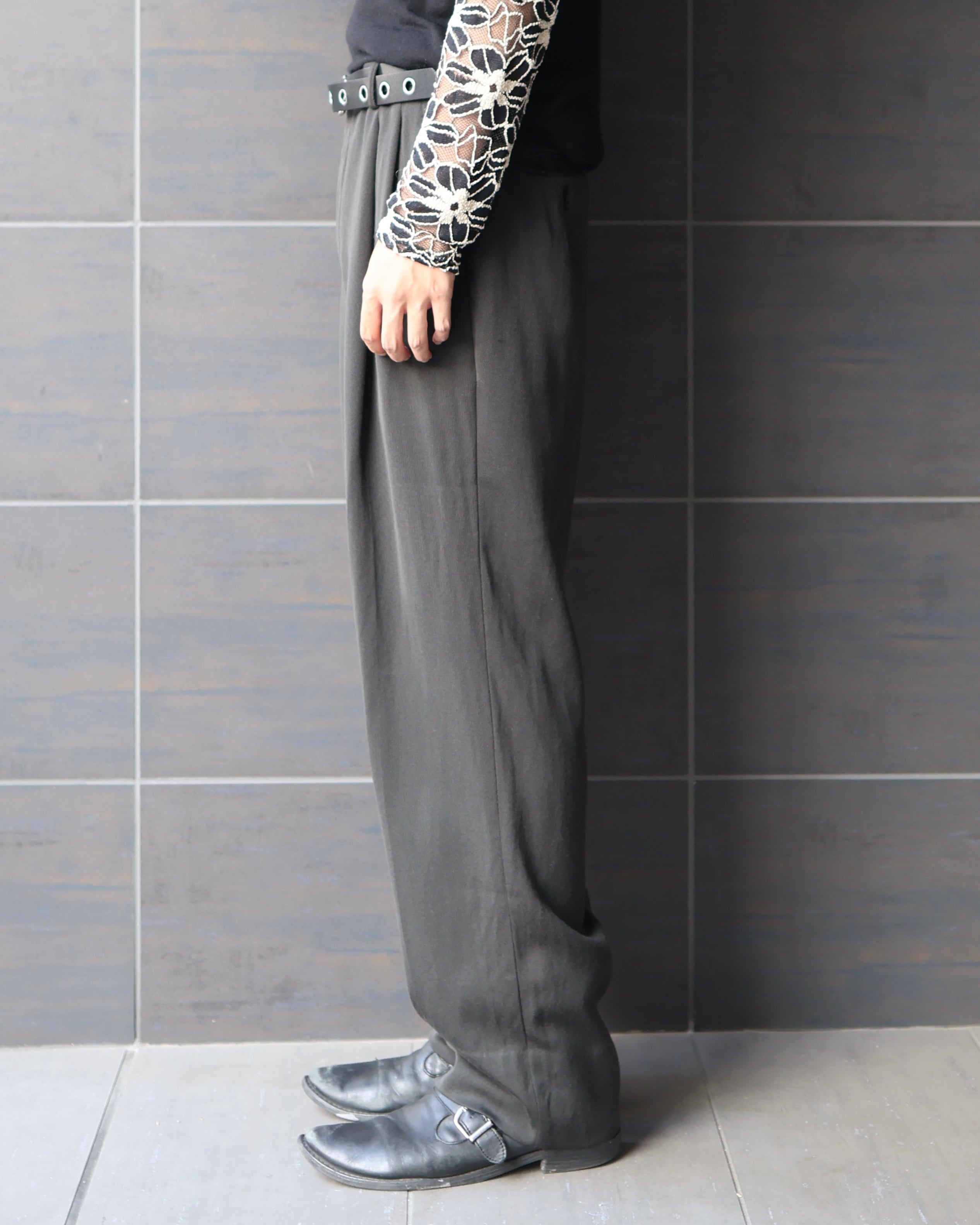 Christian Diorの2タックグレーウールスラックス。上質なウール素材を使用し、しなやかな肌触りと美しい落ち感が特徴で深めに入った2タックが腰まわりに適度なゆとりをもたらしつつ、裾にかけてすっきりとテーパードされたシルエットが上品な印象を演出する1着