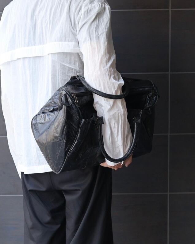 独特のシワ感がこなれた雰囲気を演出し無骨さと上品さを兼ね備えた存在感のあるアイテム。フロントにはプレートロゴがアクセントとなっており、さりげないブランド感がプラスされる