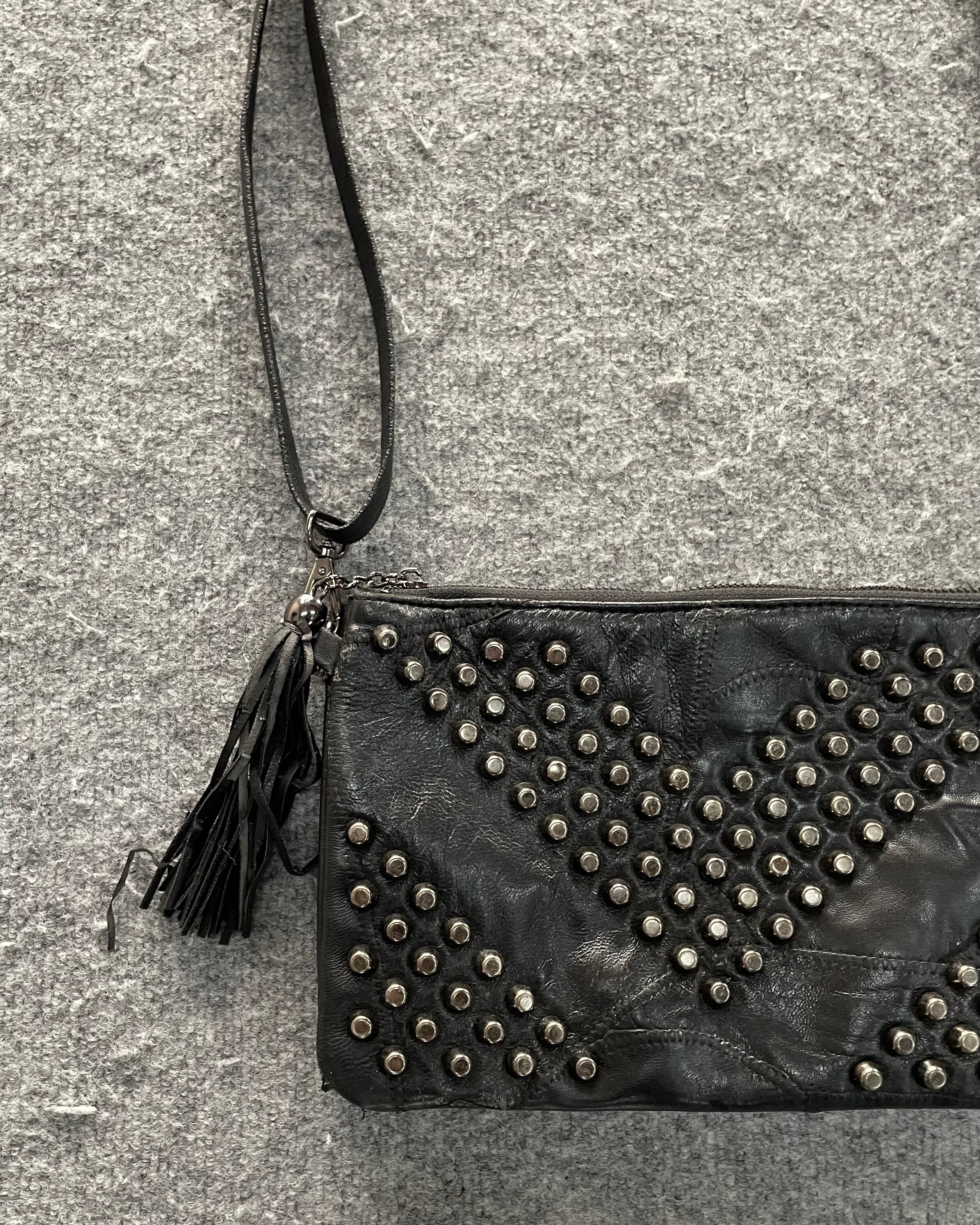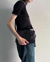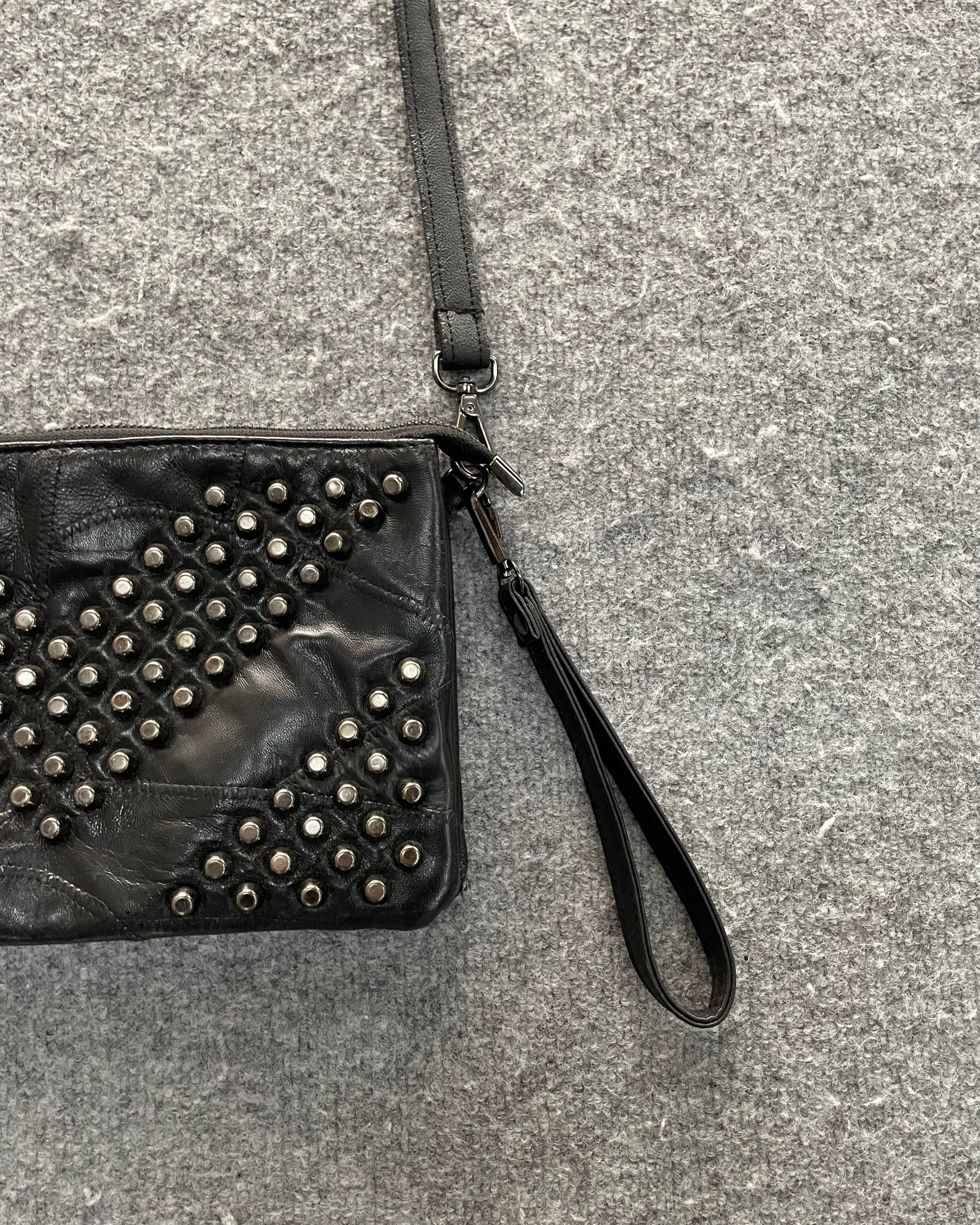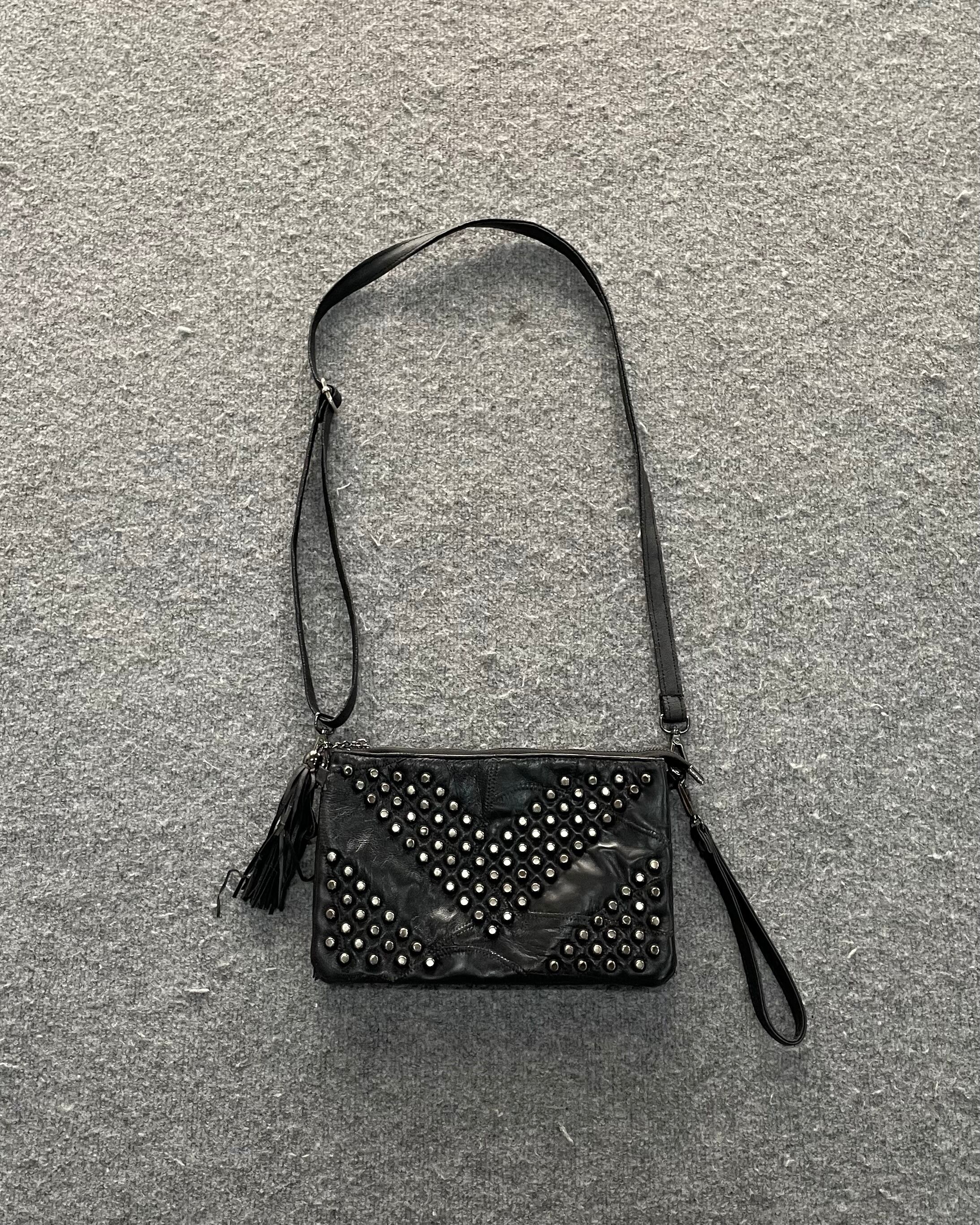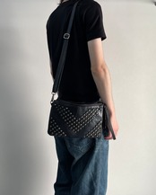 スタッズを全面にあしらったデザインのレザー調ショルダーバッグ。