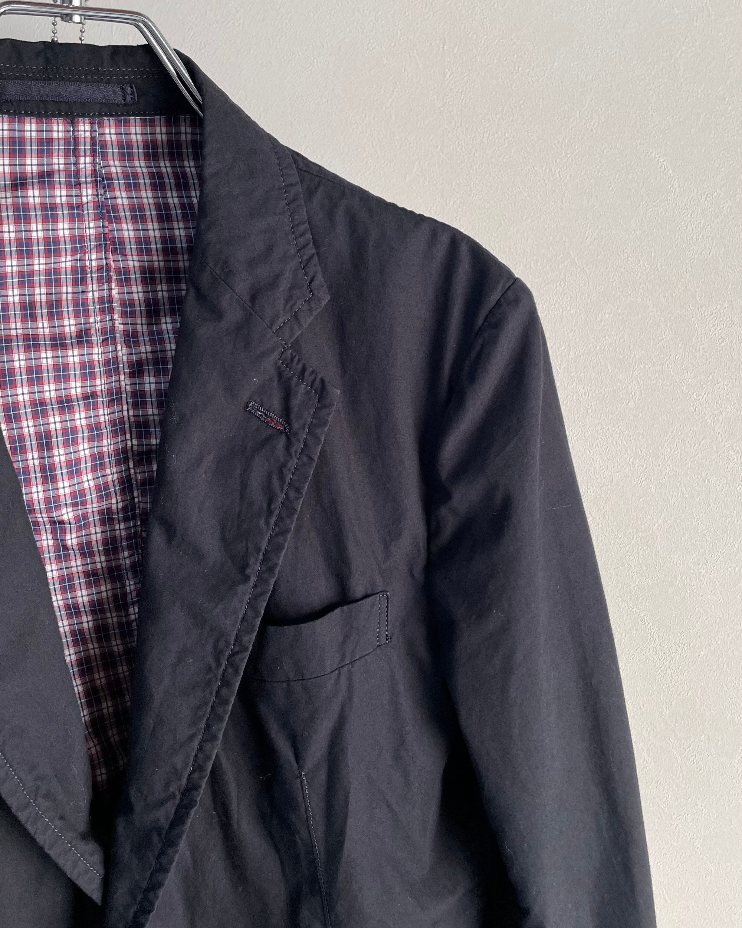 一見ブラックのシンプルなテーラードだが、素材や縫い代のディテール、チェックの裏地、若干のネイビー色などがギャルソンらしさを引き出しています。シンプルながら周りとの差別化が可能な1着。