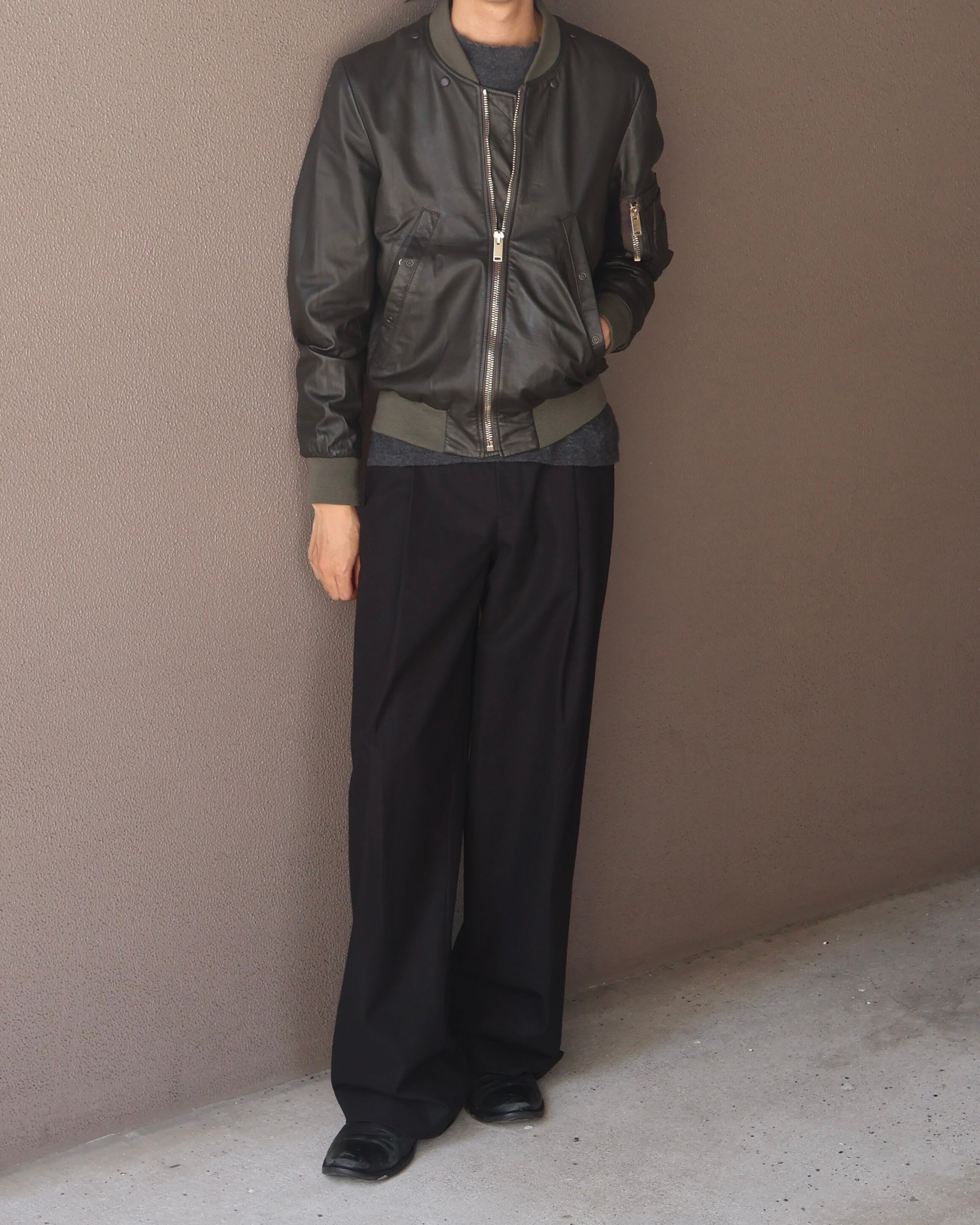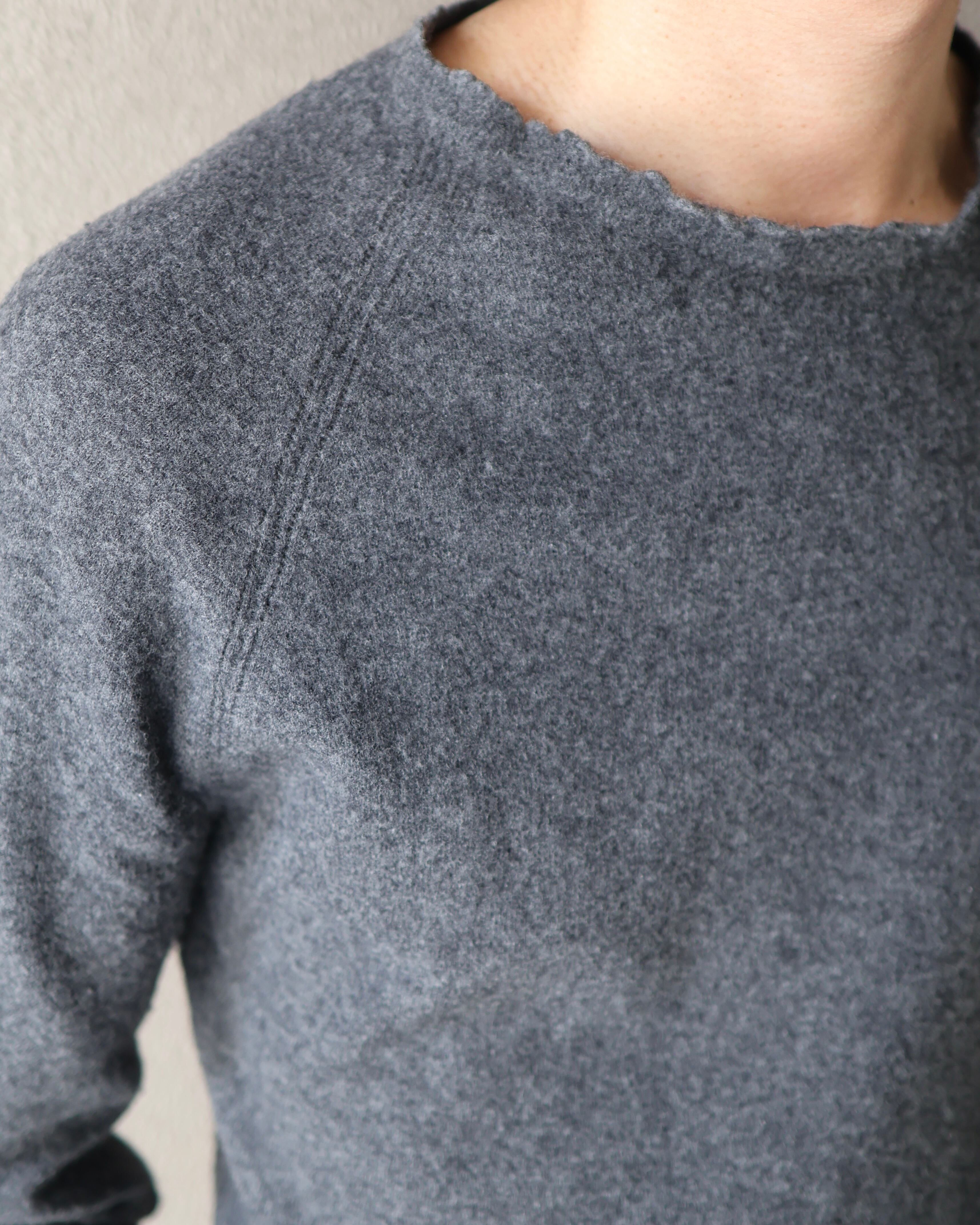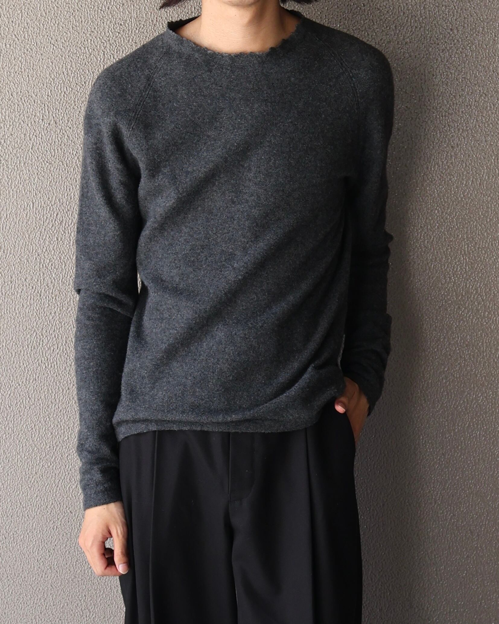 上質なウール素材を用いた柔らかな着心地が特徴で、シンプルながらも洗練された佇まいを演出するアイテム。ネックや袖口、裾に施されたラフなカットオフ仕上げがデザインのアクセントとなる1着