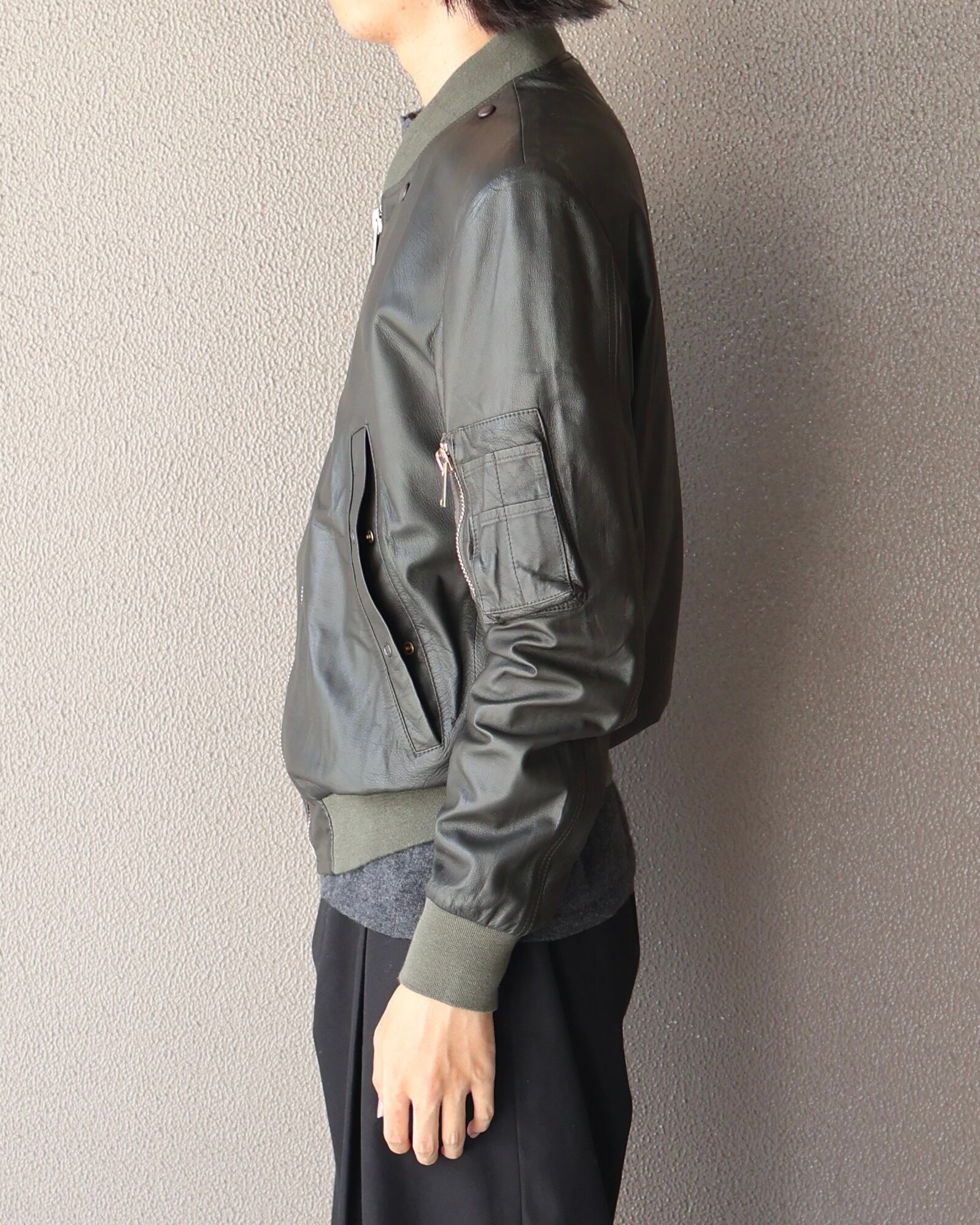 柔らかく上質なラムレザーを使用し、程よい艶感としなやかな着心地を兼ね備えている。フロントはジップクロージャー仕様で、フラップ付きのハンドポケットやアームポケットを備えた実用的なデザインの1着