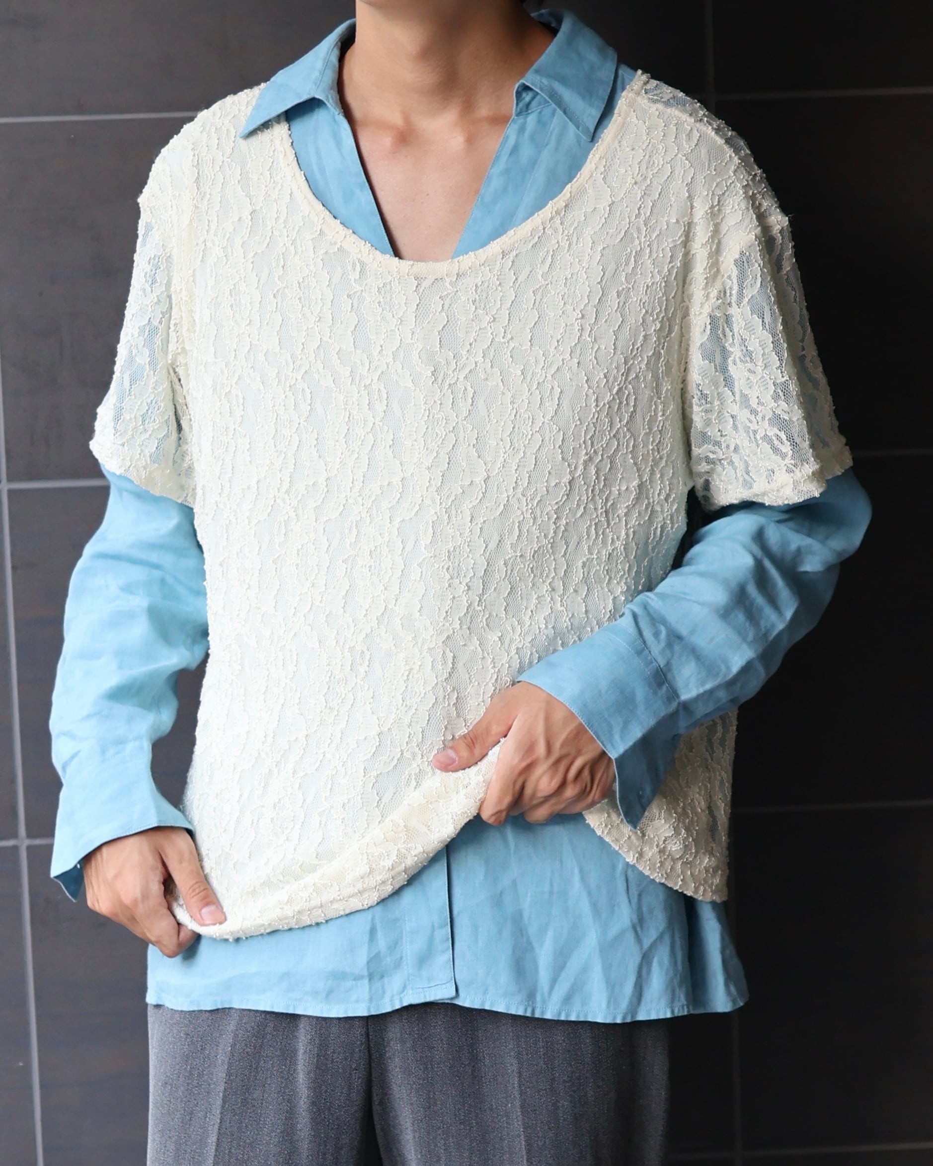 レイヤードとして活用することで他とは異なる差別化を図ることが可能でフロント部分は生地が二重のためデザインが透けて見え感が悪くなることもないアイテム。