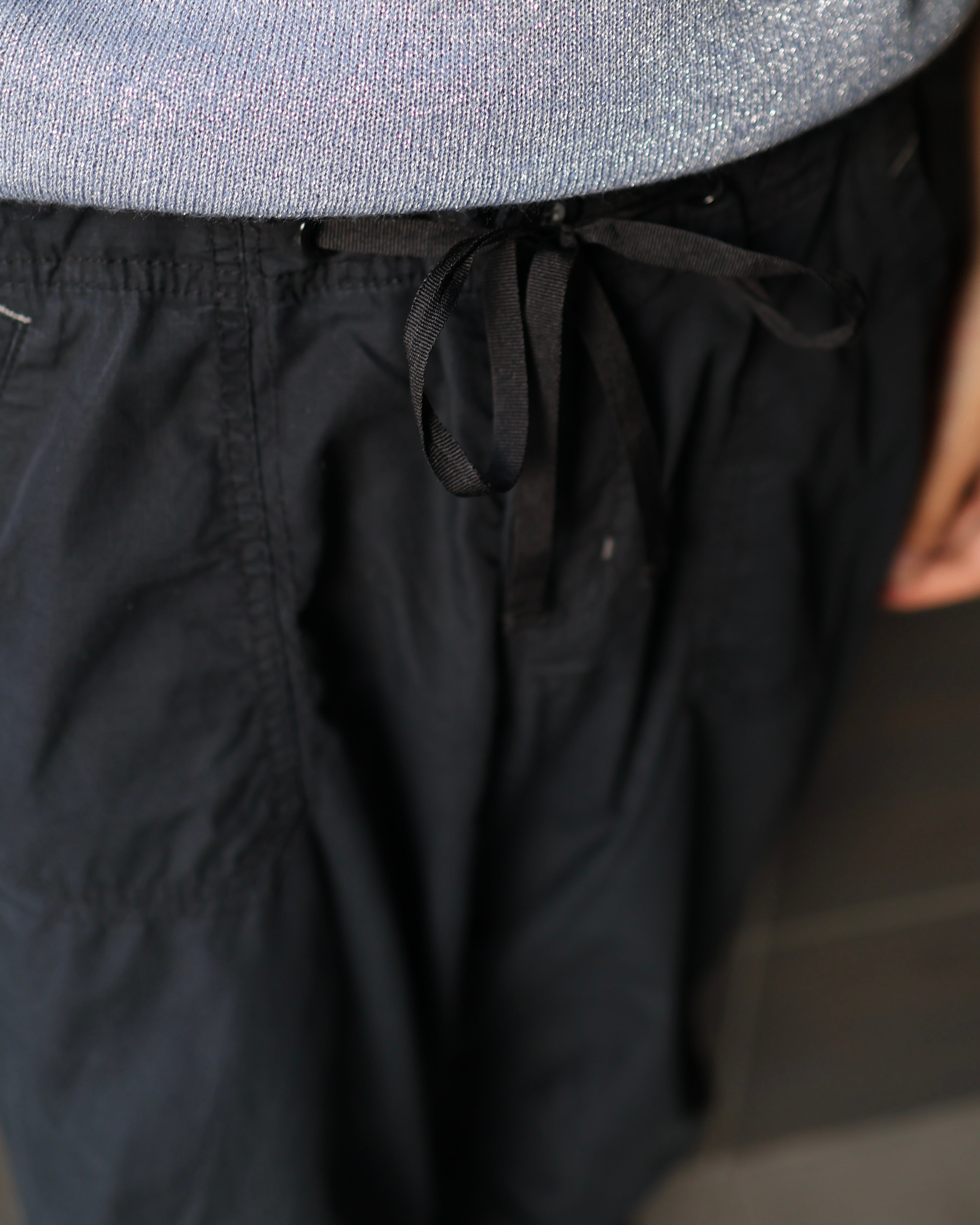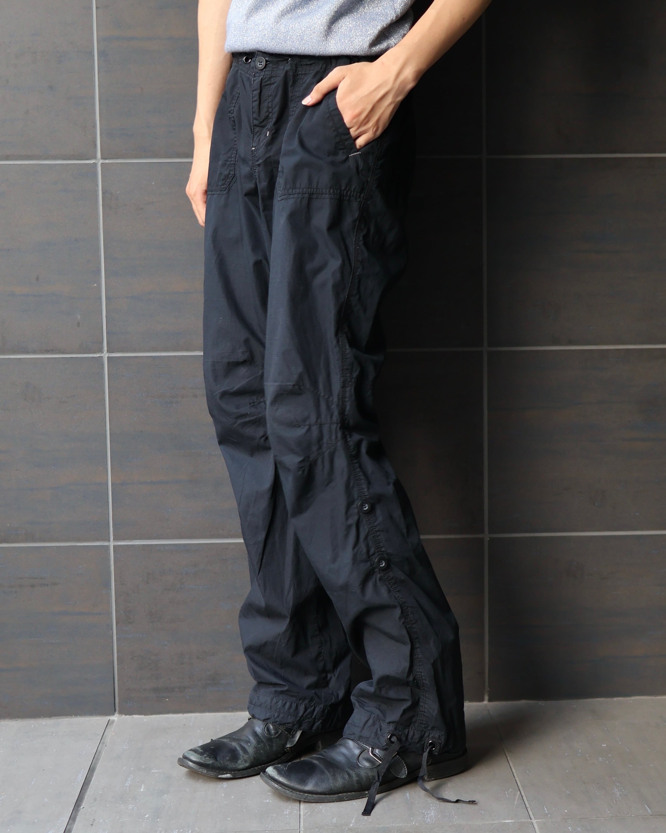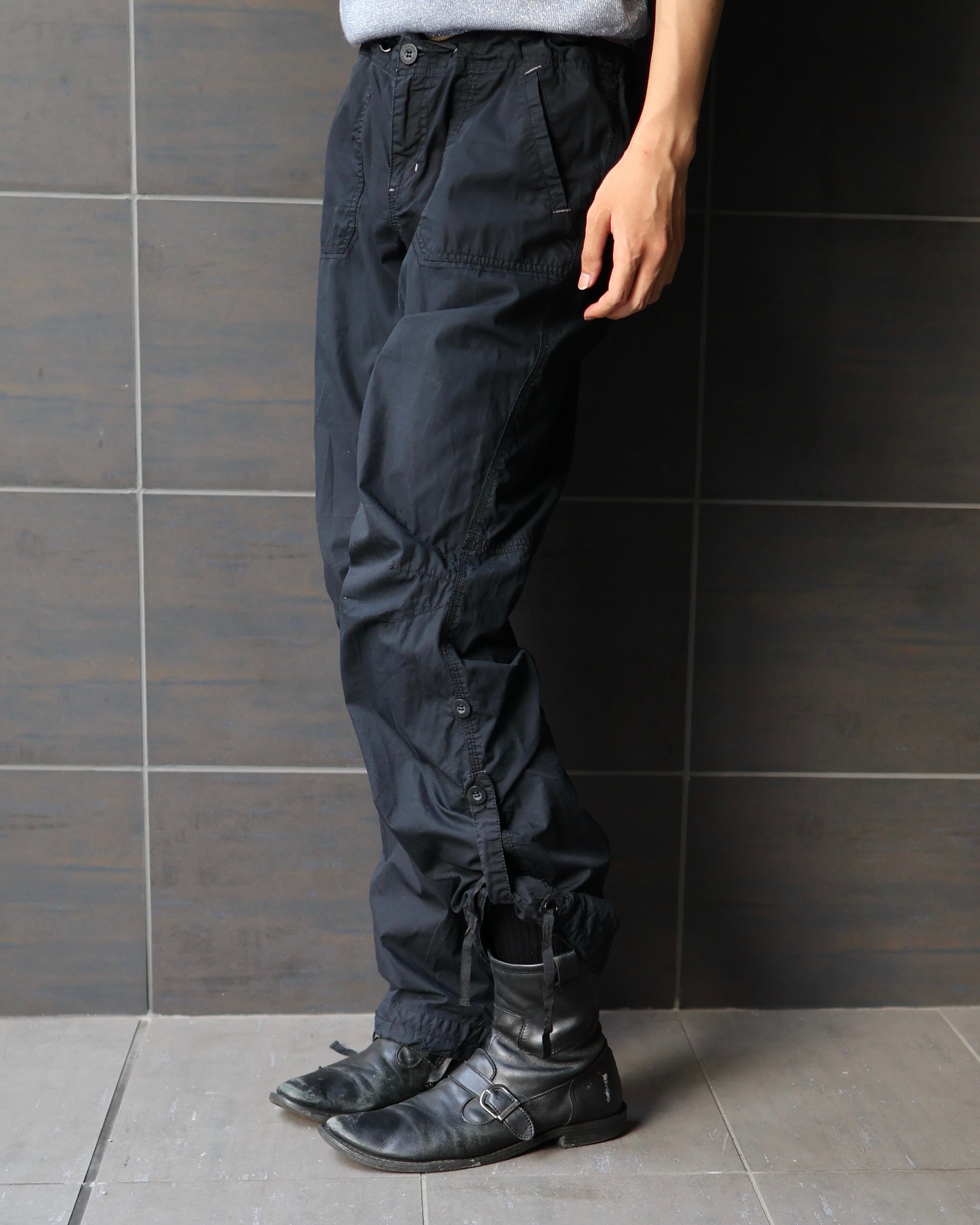 コットン素材のサイドボタンによる裾上げやドローコードによるシルエット変化が可能なカーゴパンツ