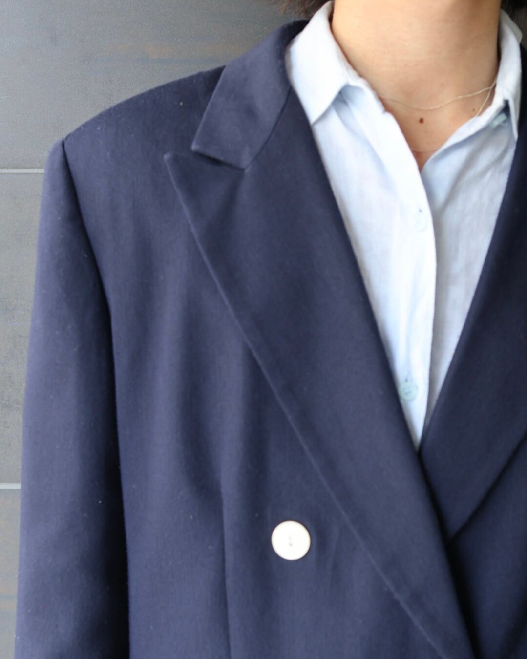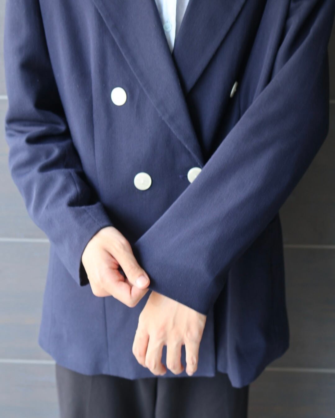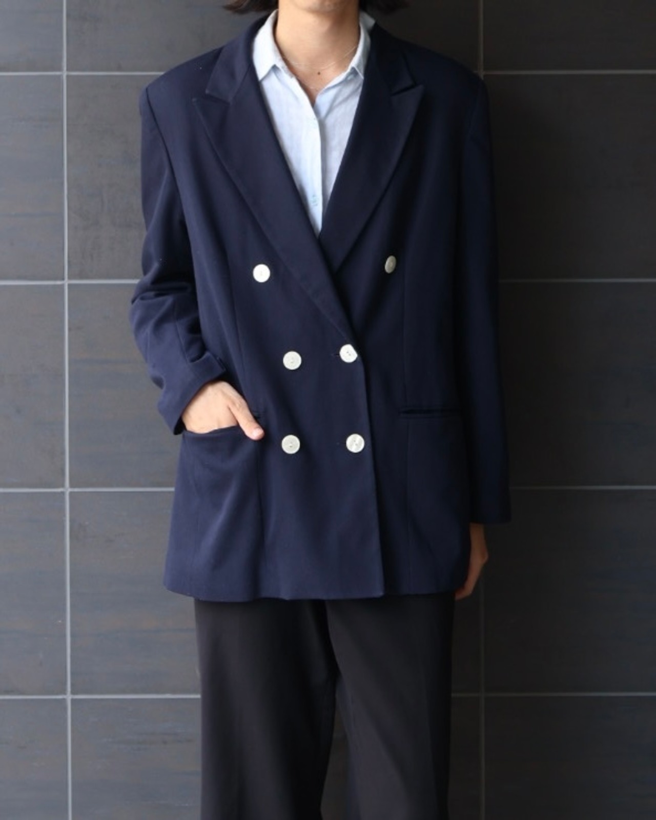 ダブルブレステッドのネイビーテーラードジャケット