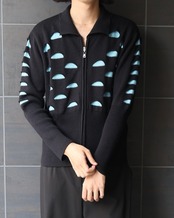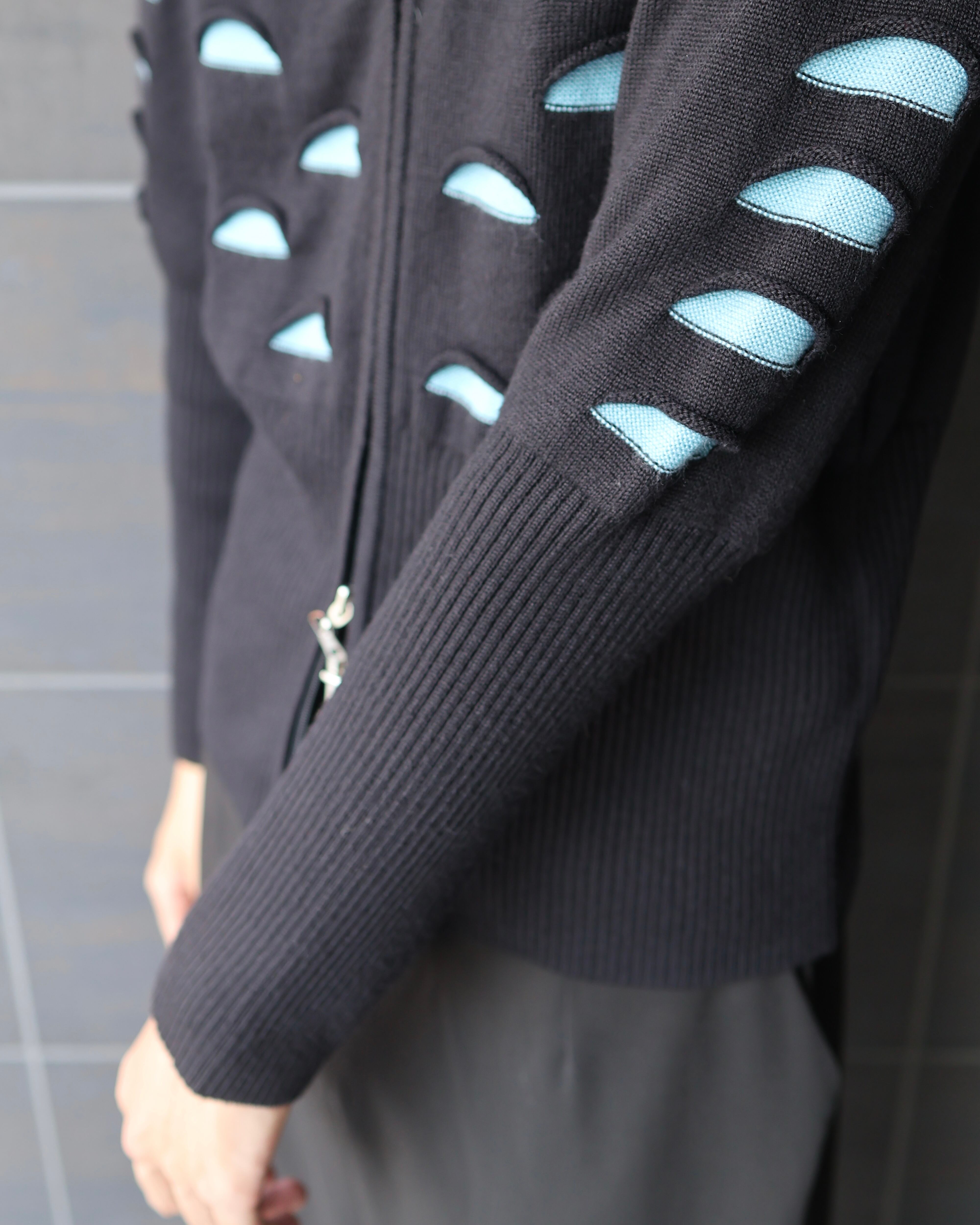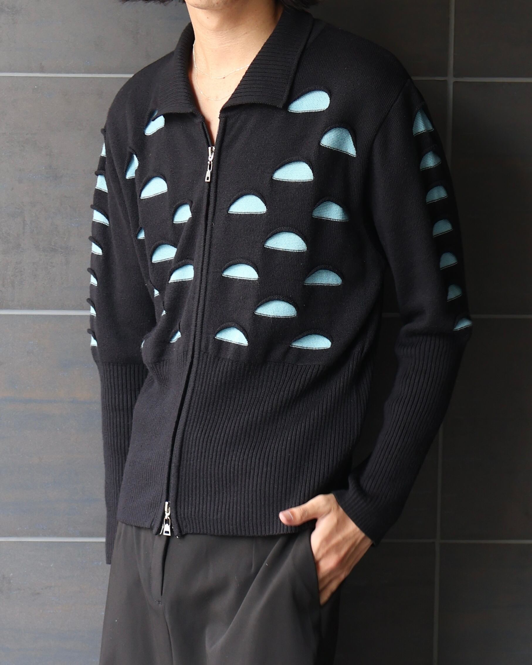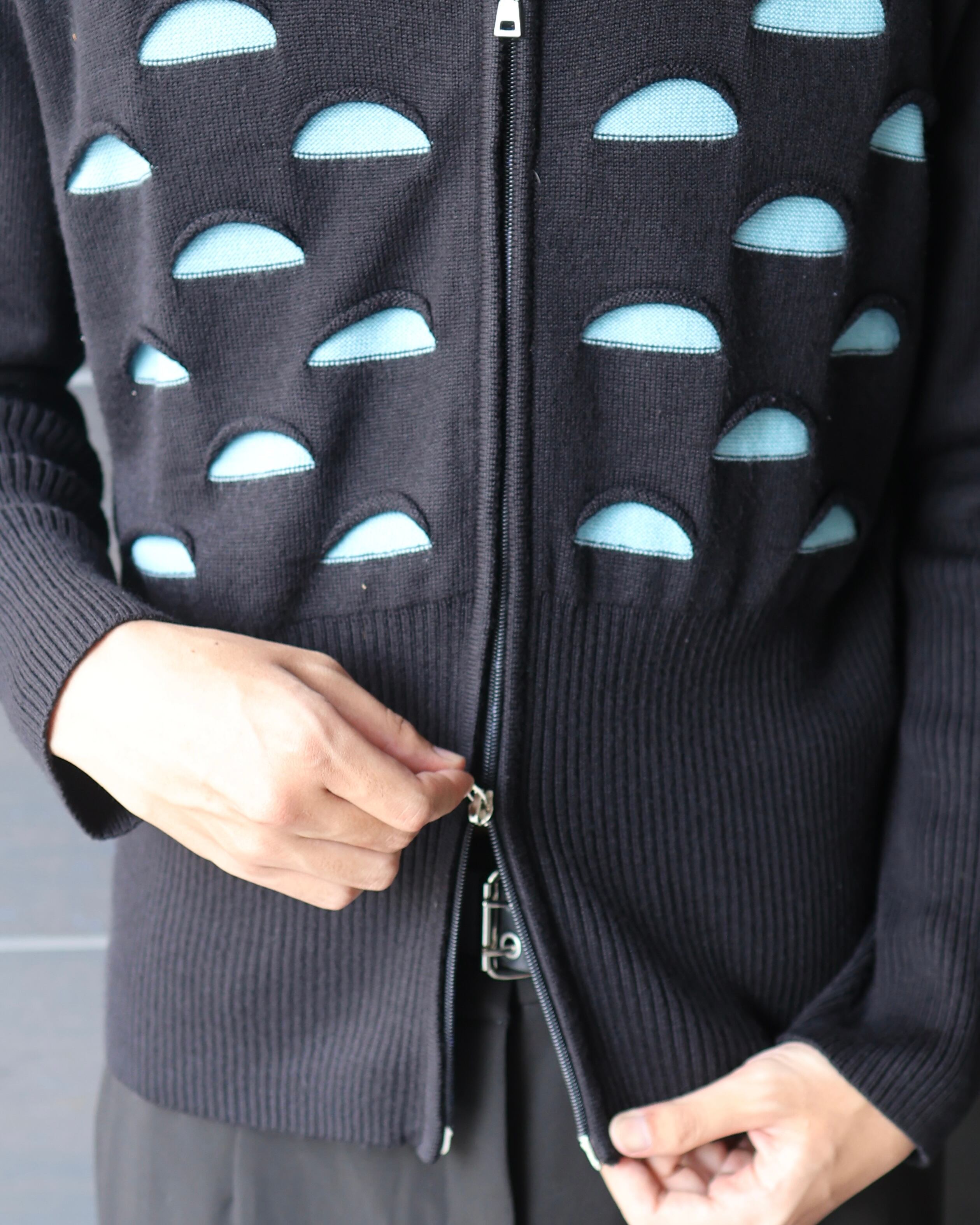 カットアウトディティールと良いカラーリングのレイヤードデザインが特徴的なジップアップニット