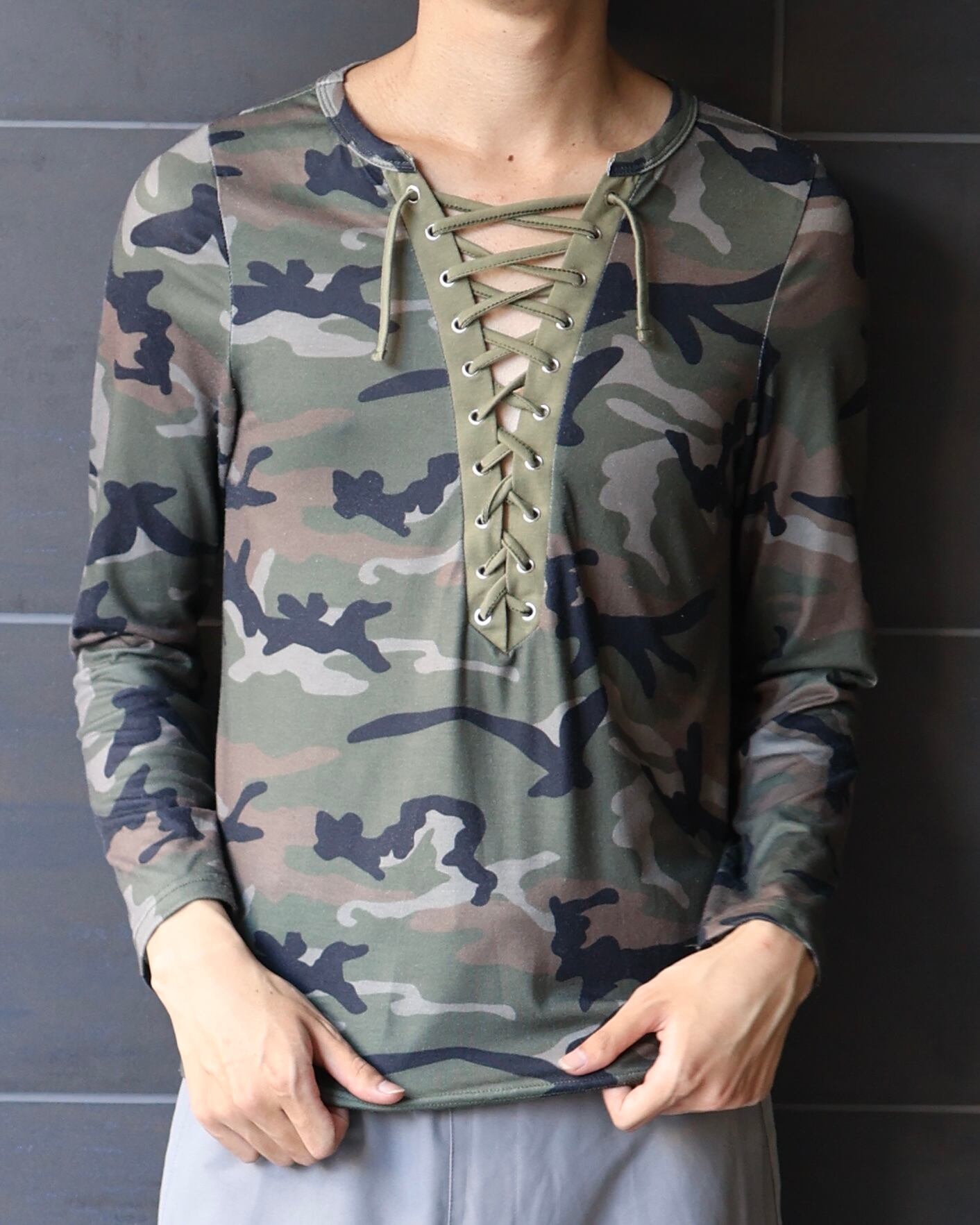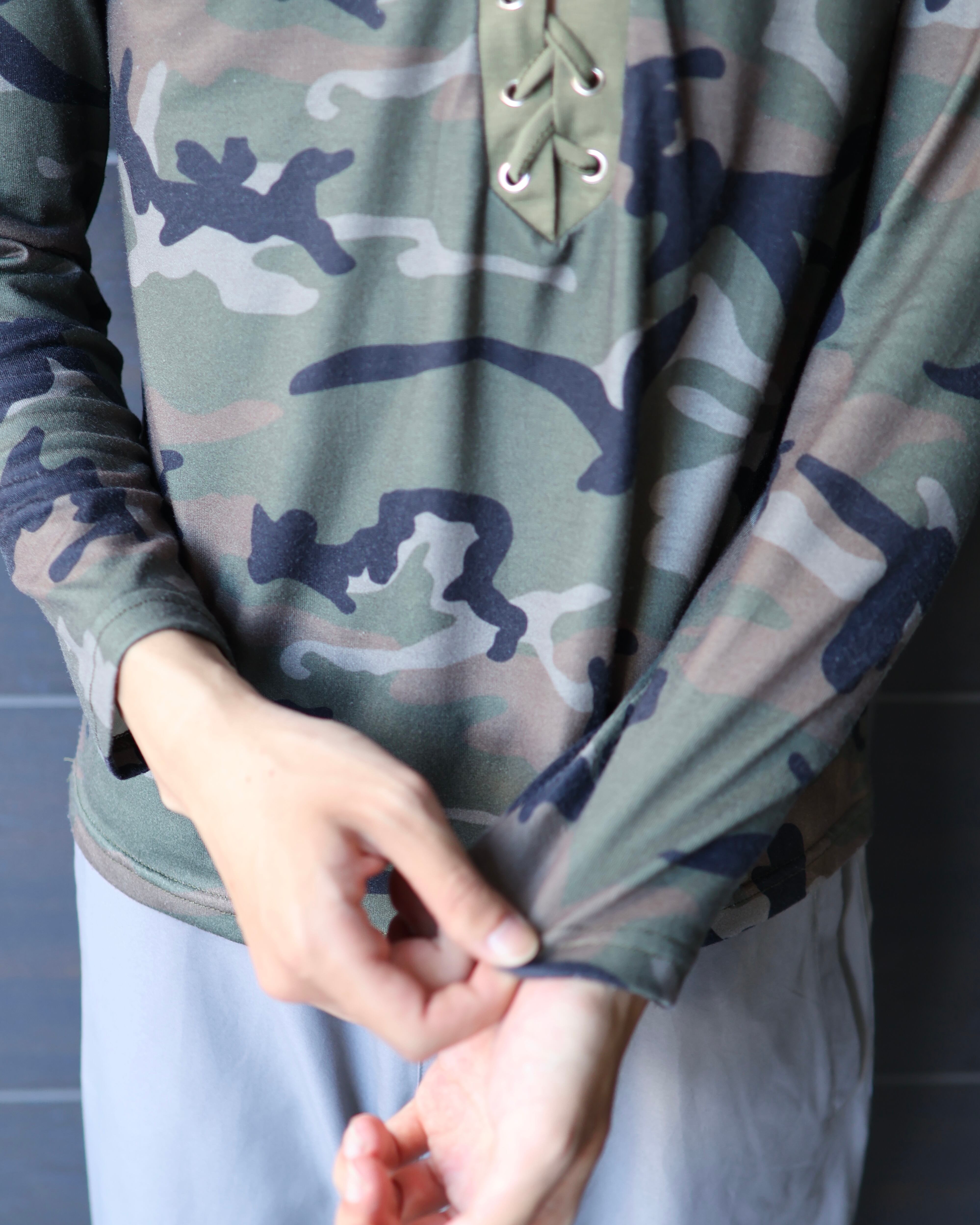 フロントのレースアップデザインが特徴のカモ柄トップ