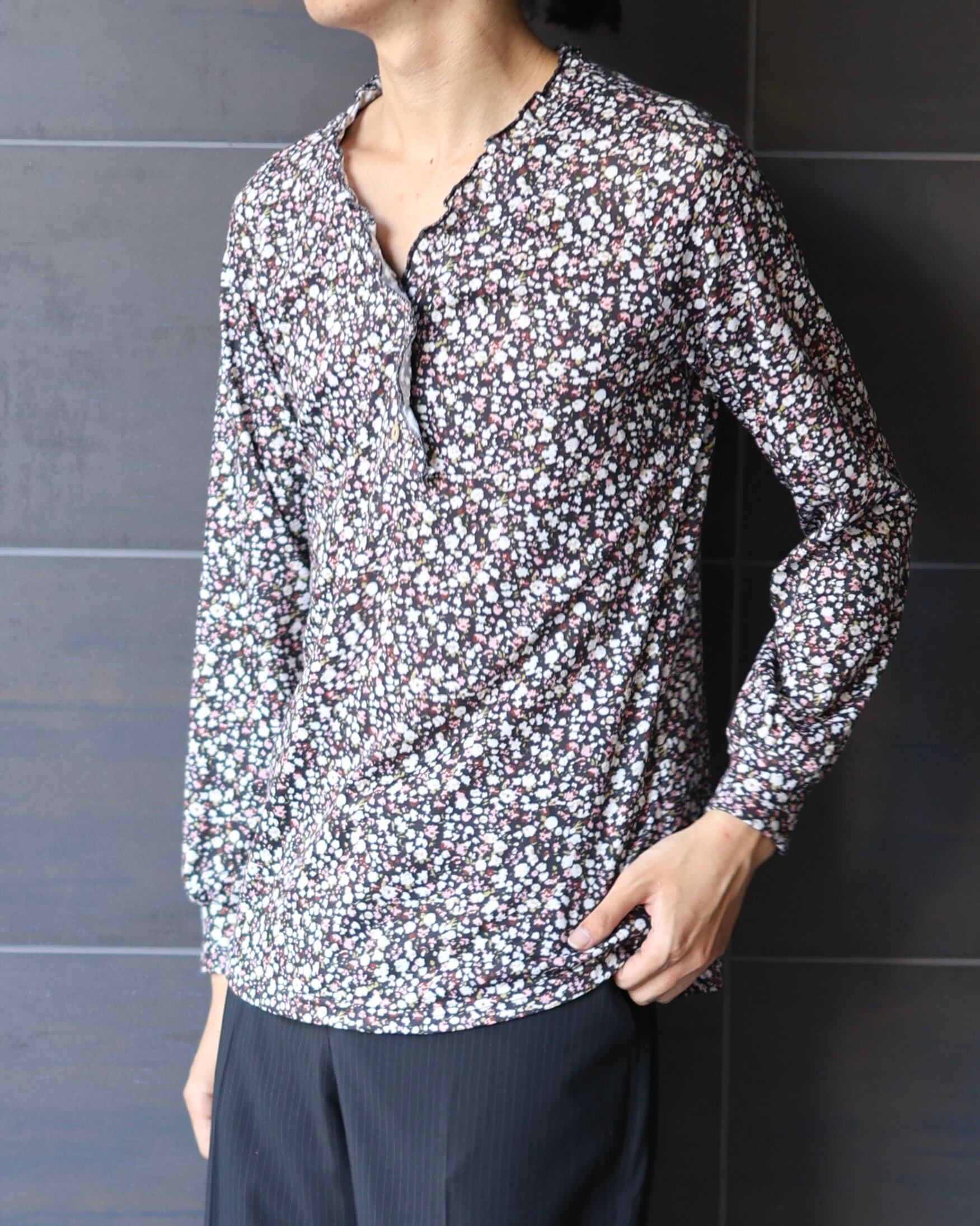 首回りの若干なフリルが特徴的でインナーとしても活用しやすい生地感のため花柄をレイヤードとして活用することができるアイテム