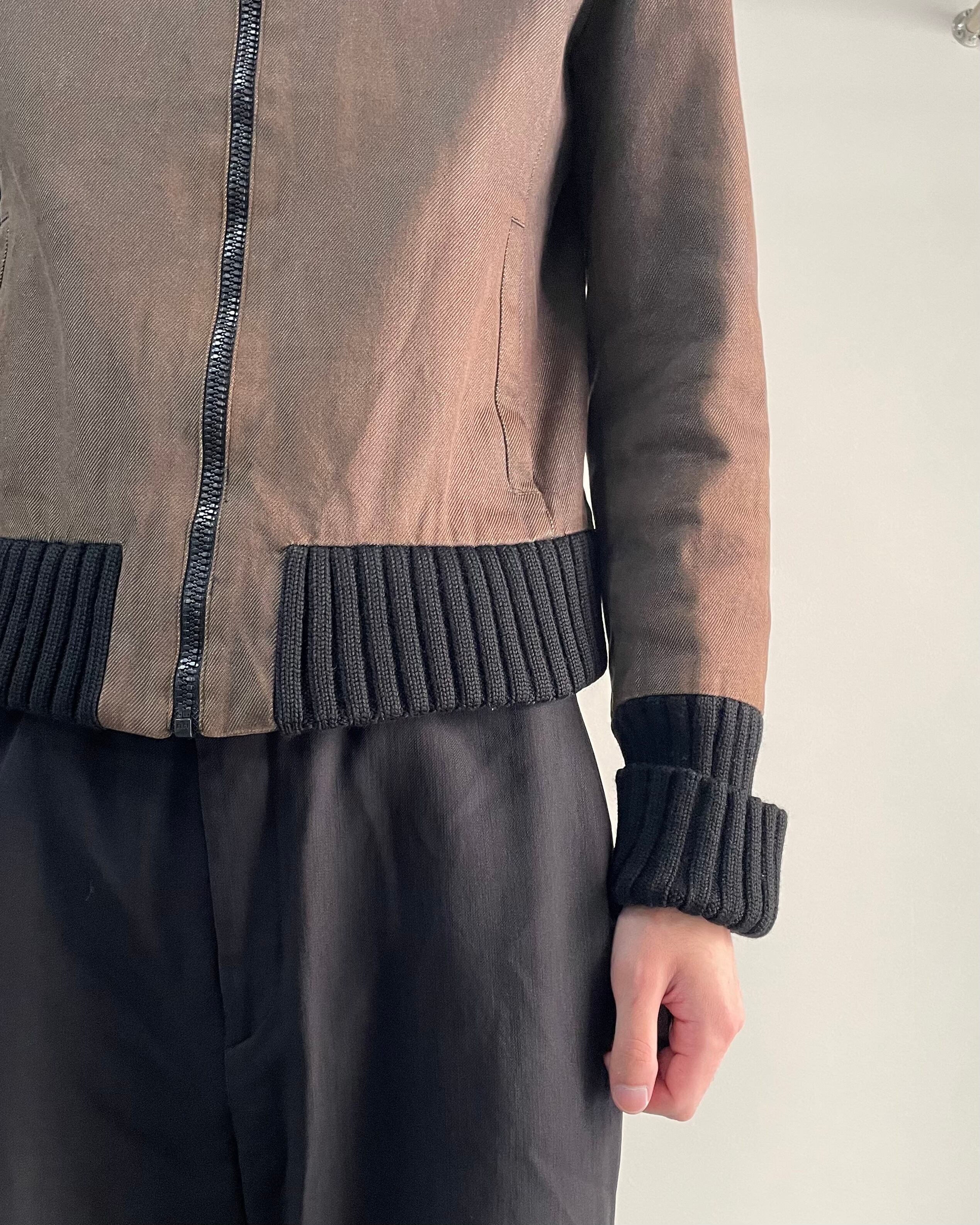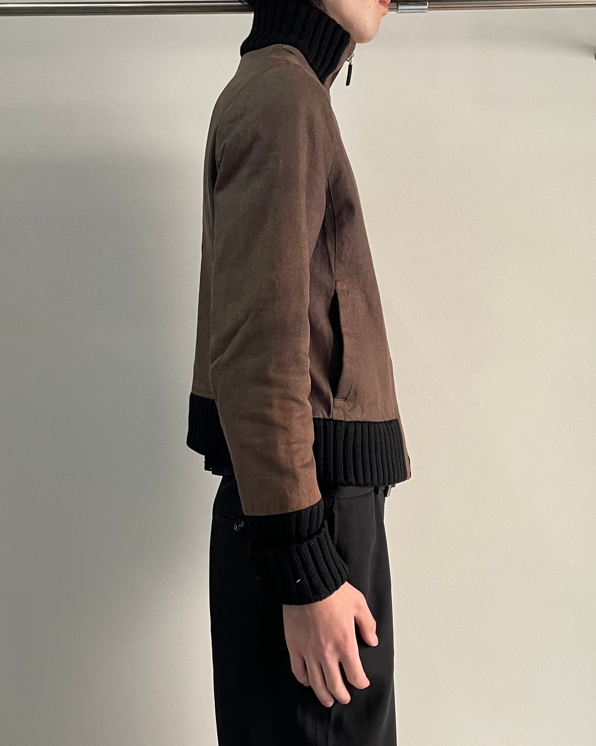 ブラウンのボディに対し、襟・裾・袖口に配された黒のリブが力強いコントラストを生み、コンパクトで洗練されたシルエットを演出。