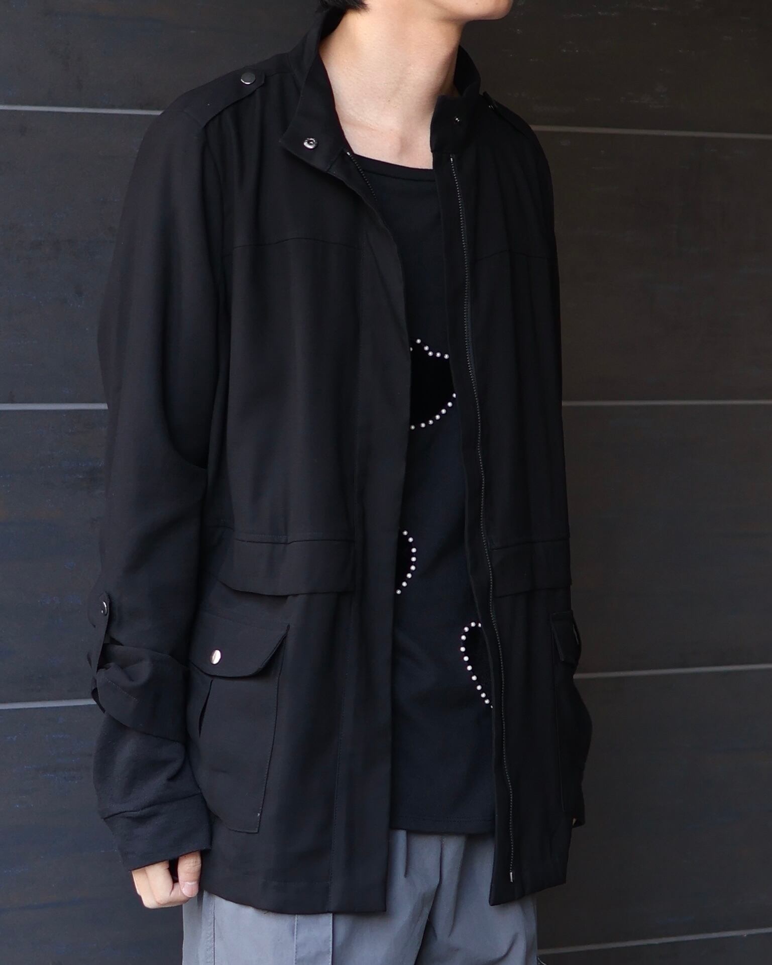 フラップポケットやエポレット、袖のアジャスターでミリタリー要素もありながらモードな雰囲気もあるアイテム。