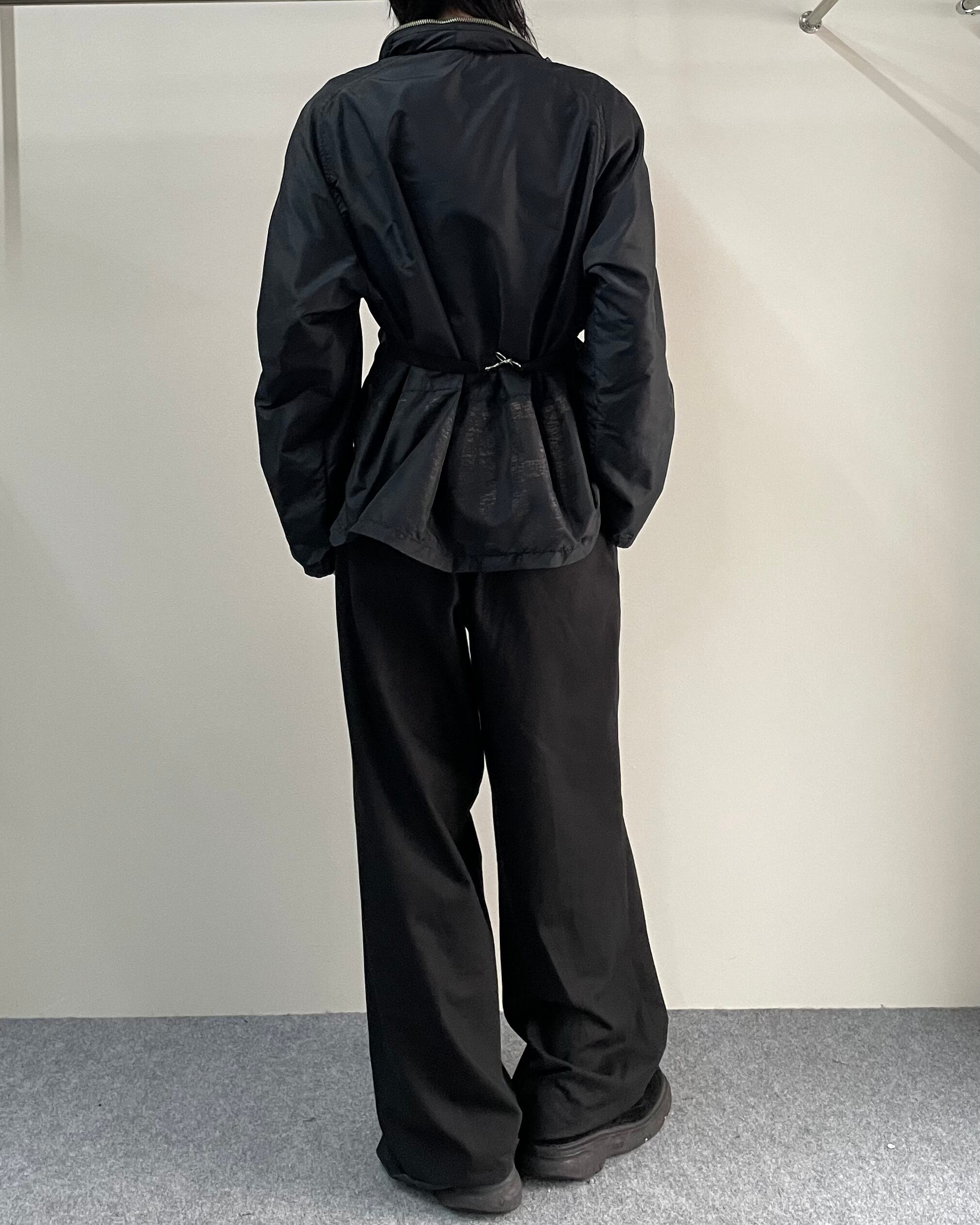 フロントポケットにあるゴム紐をウエストベルトとして使用でき、シルエットの変化も楽しめます。