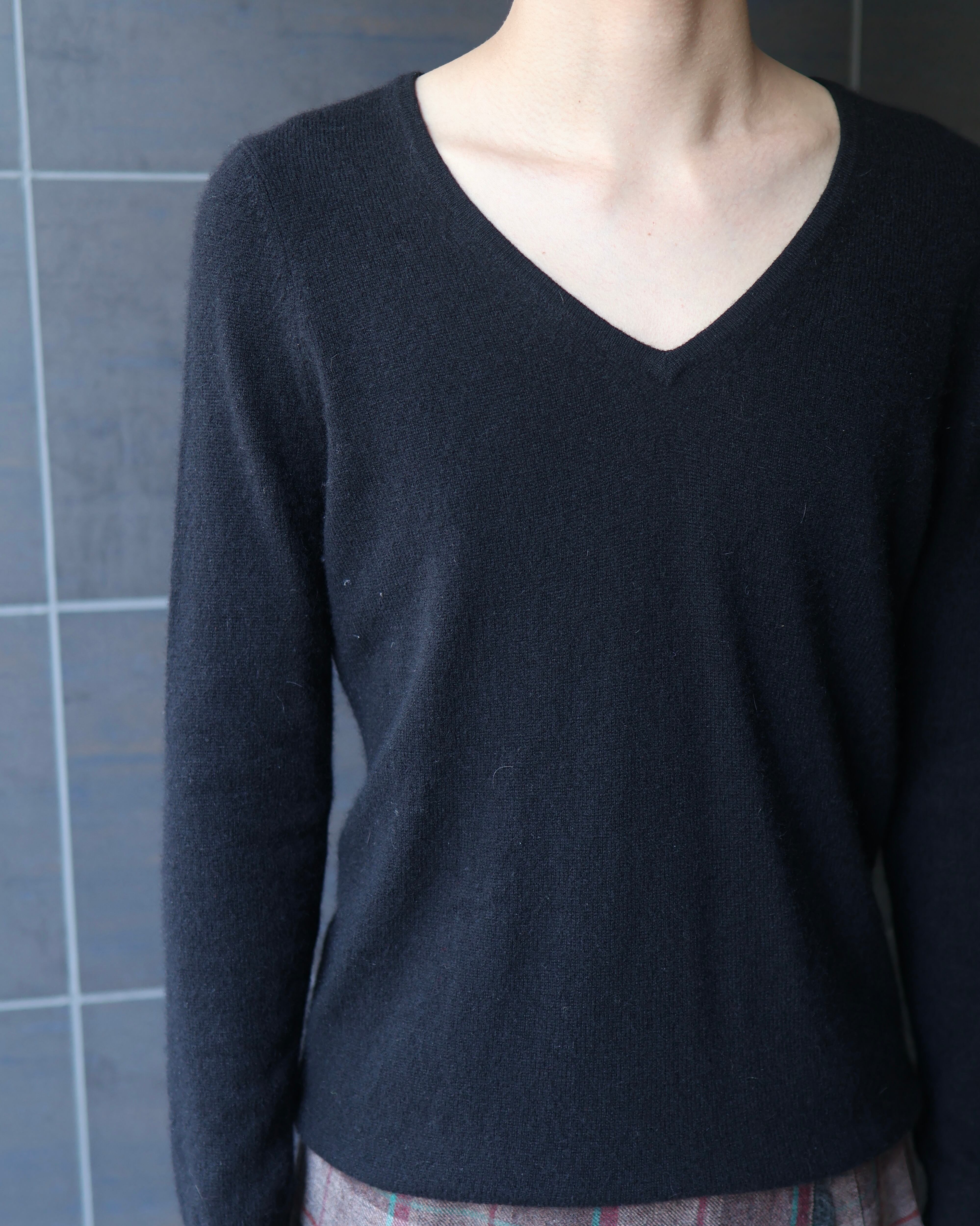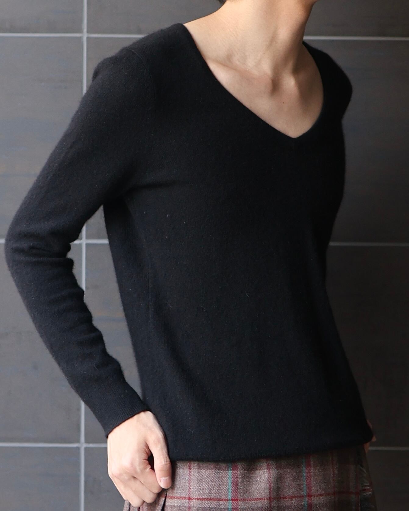 カシミヤ特有のしなやかなドレープが美しく、肌触りと着心地に優れた一着。シンプルなデザインながら、深すぎないVネックラインが抜け感を演出し、単品使いはもちろん、シャツとのレイヤードにも最適。