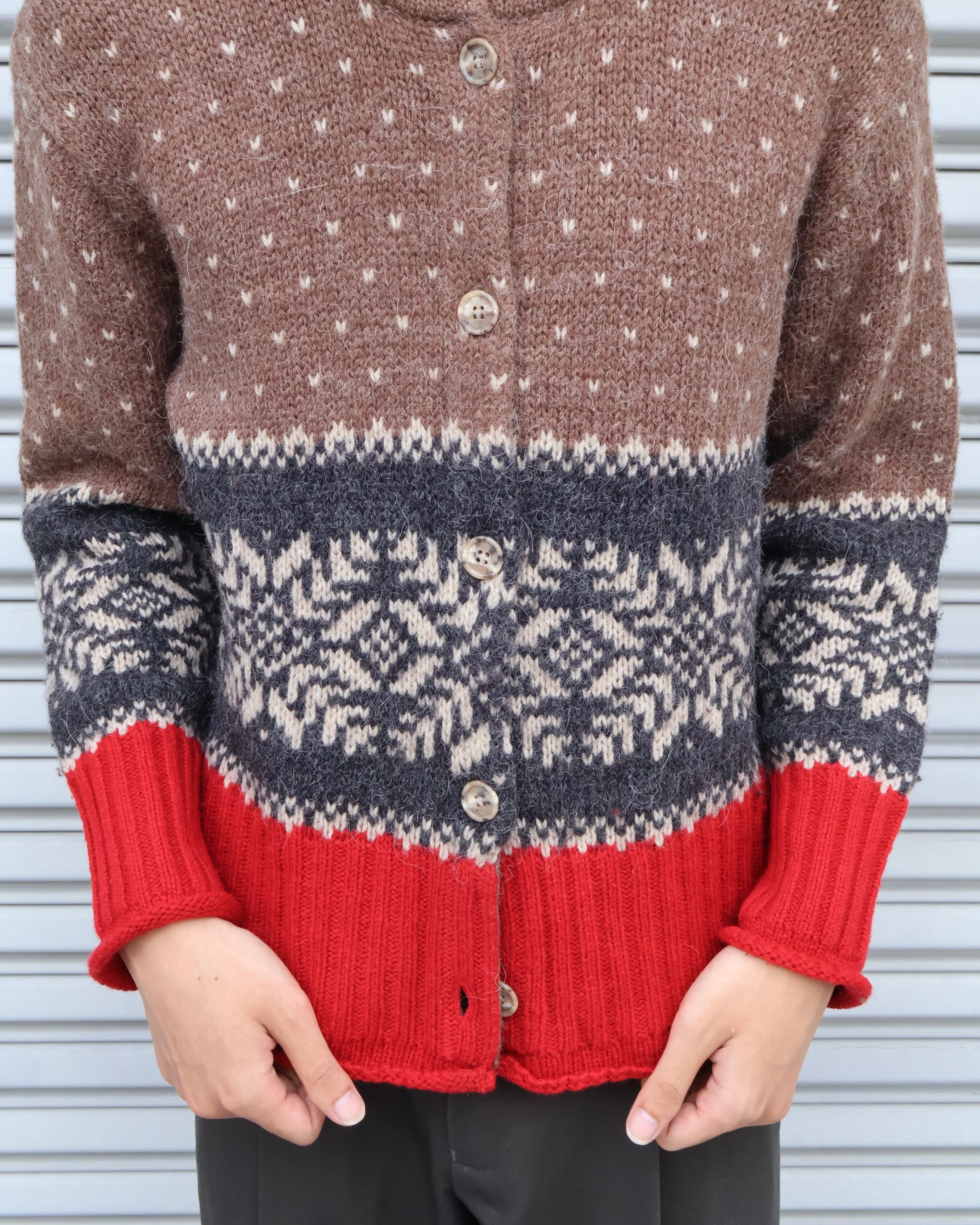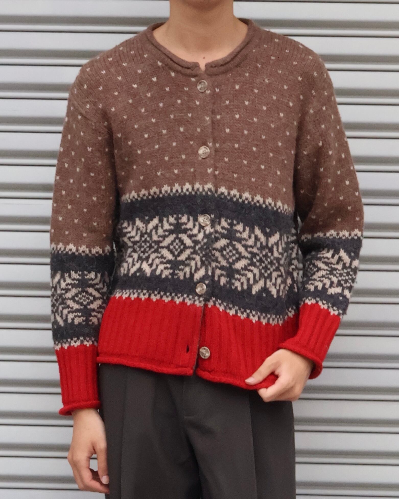 ノルディック調のパターンをあしらったクラシカルなデザインに裾や袖口のレッドカラーがアクセントとなっている。しっかりとした生地感で一枚で秋冬のスタイリングに映える1着。
