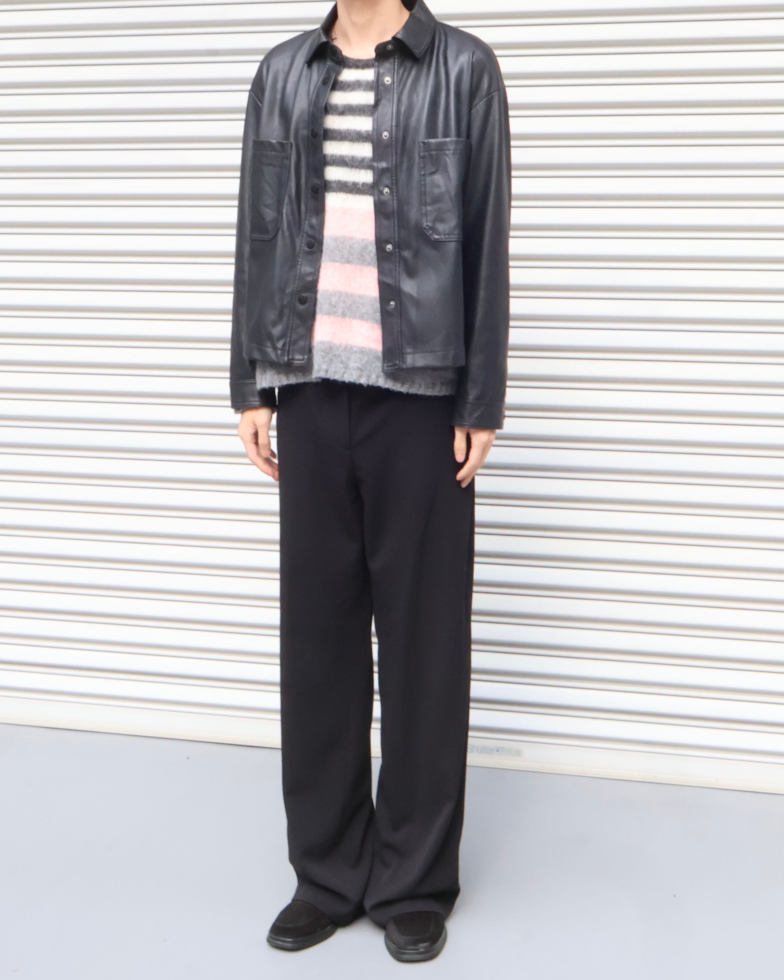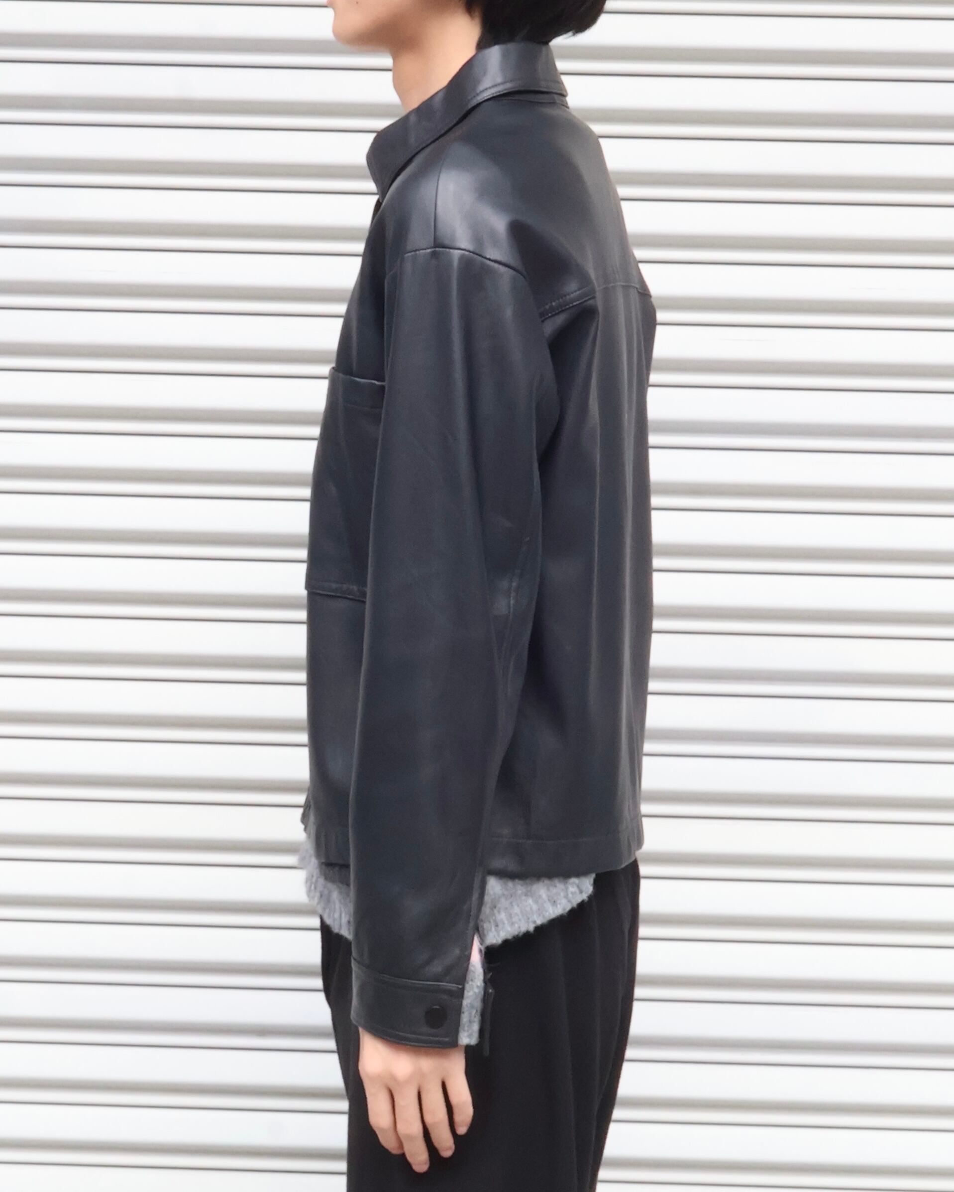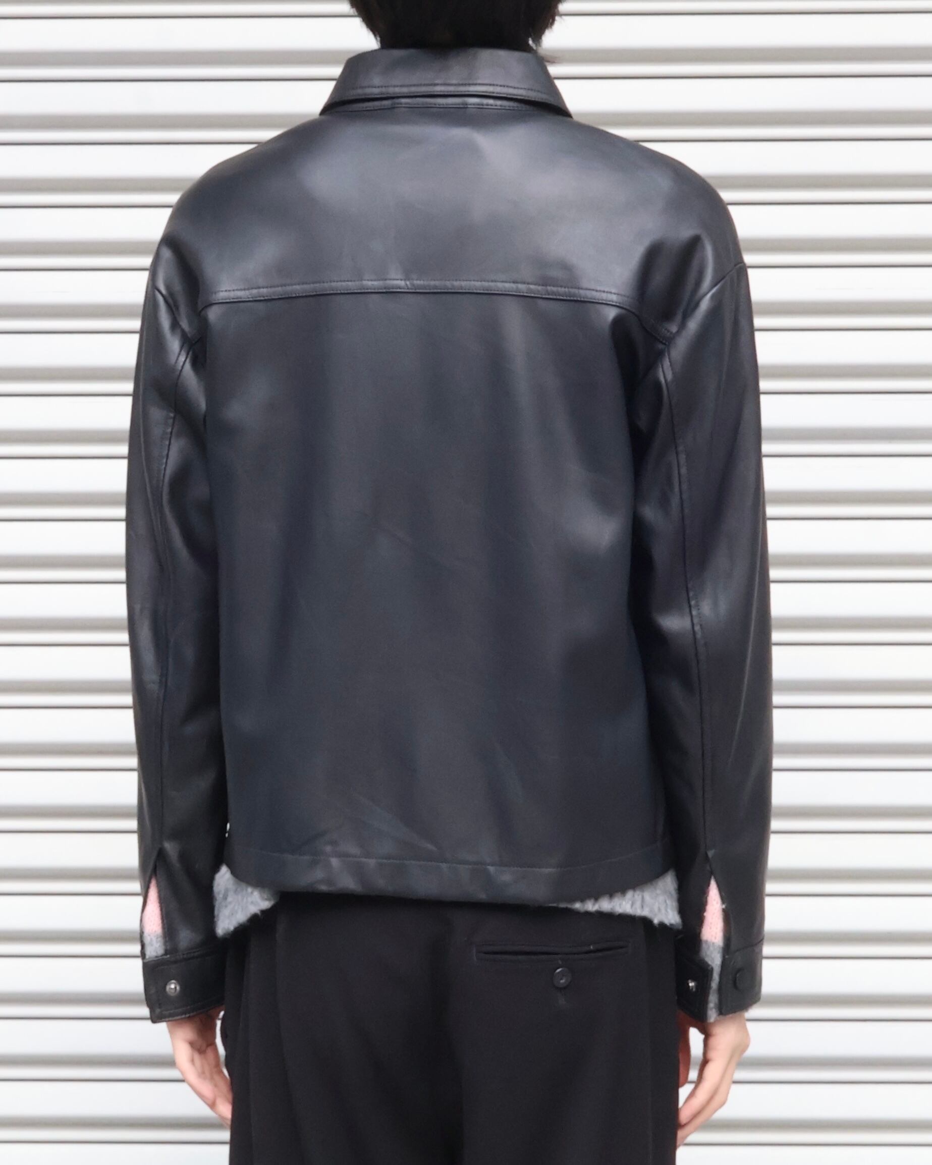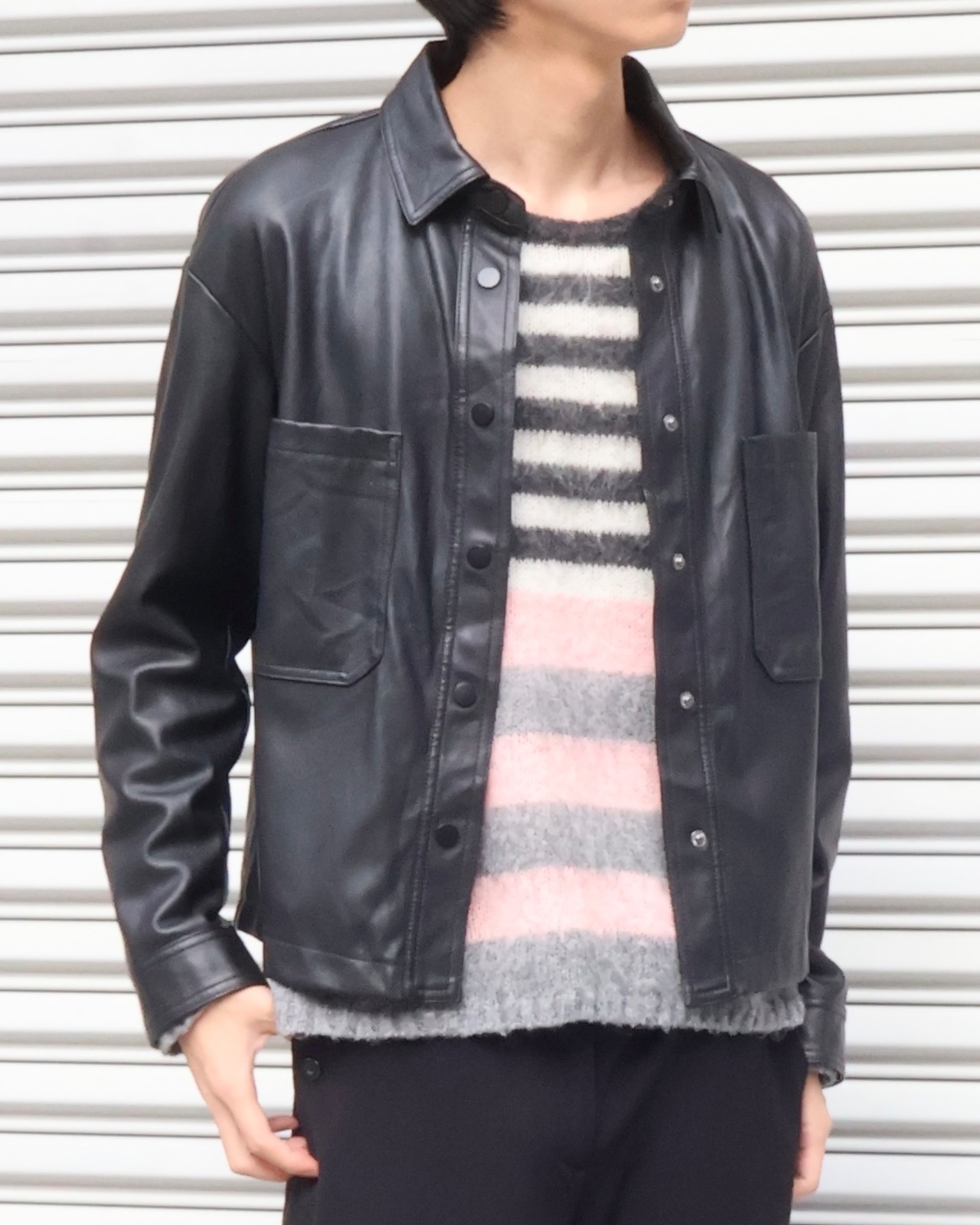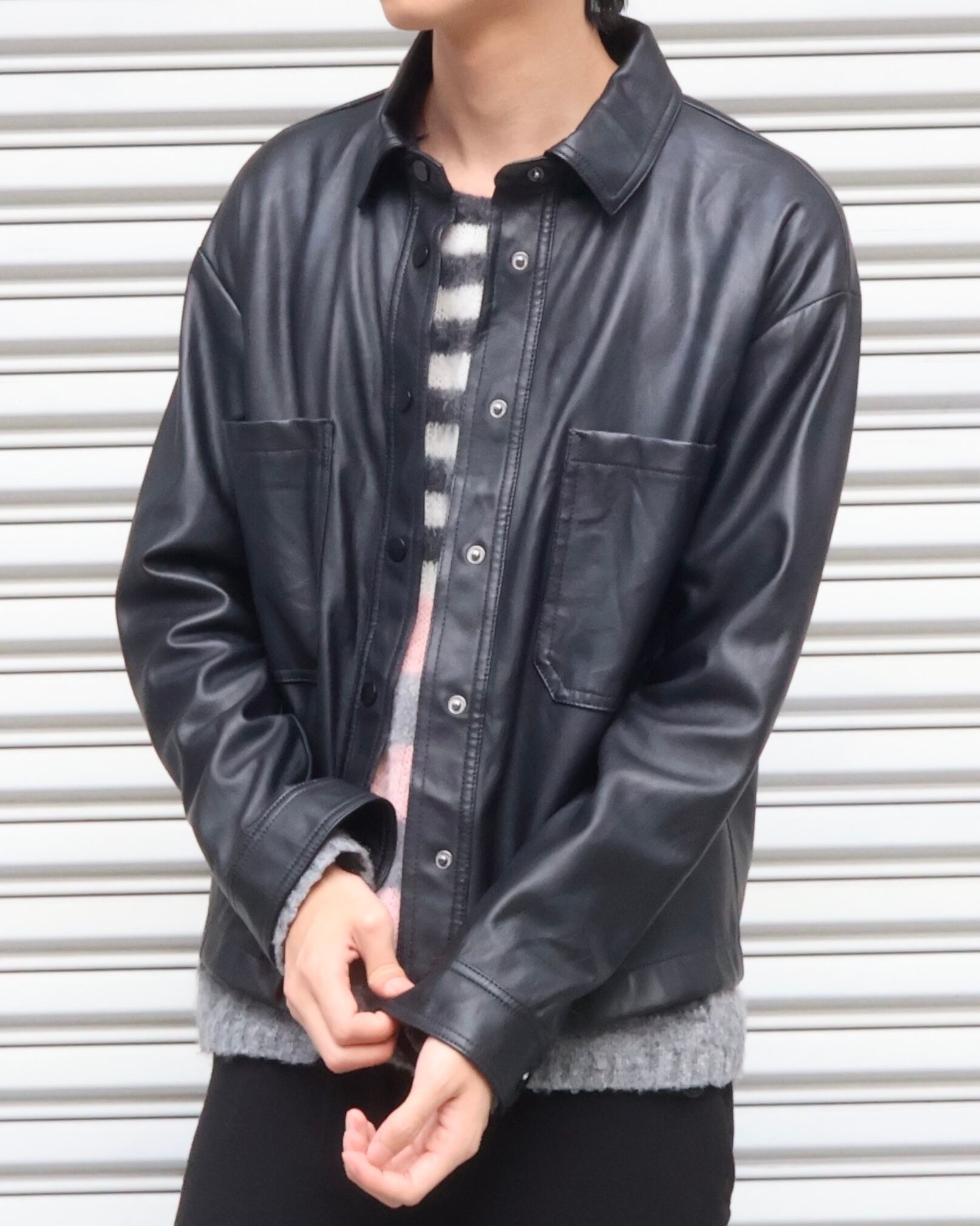 胸元の2つのポケットが特徴のフェイクレザージャケット