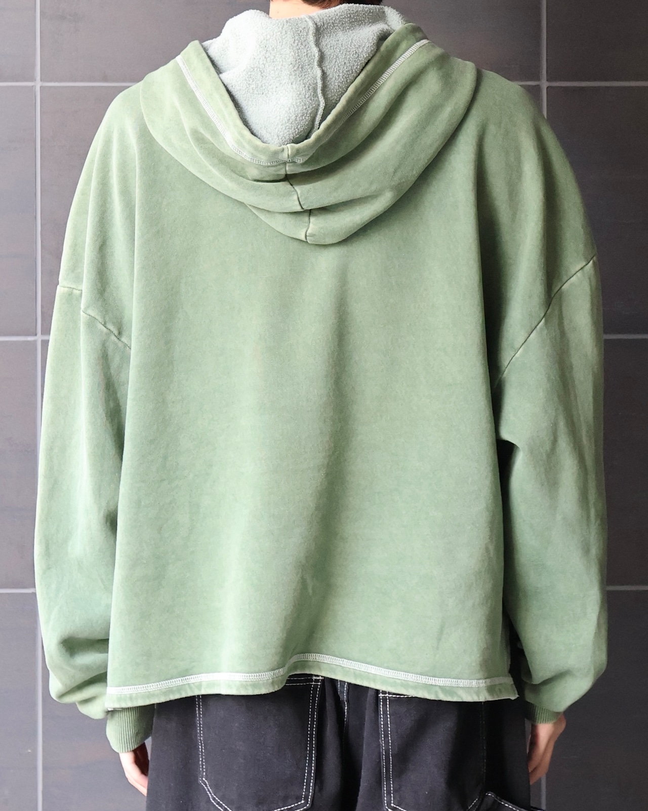 オーバーサイズでりながら着丈は短めでインナーでレイヤードも可能。ストリートはもちろんモードスタイルの外しとしても使えるアイテム。