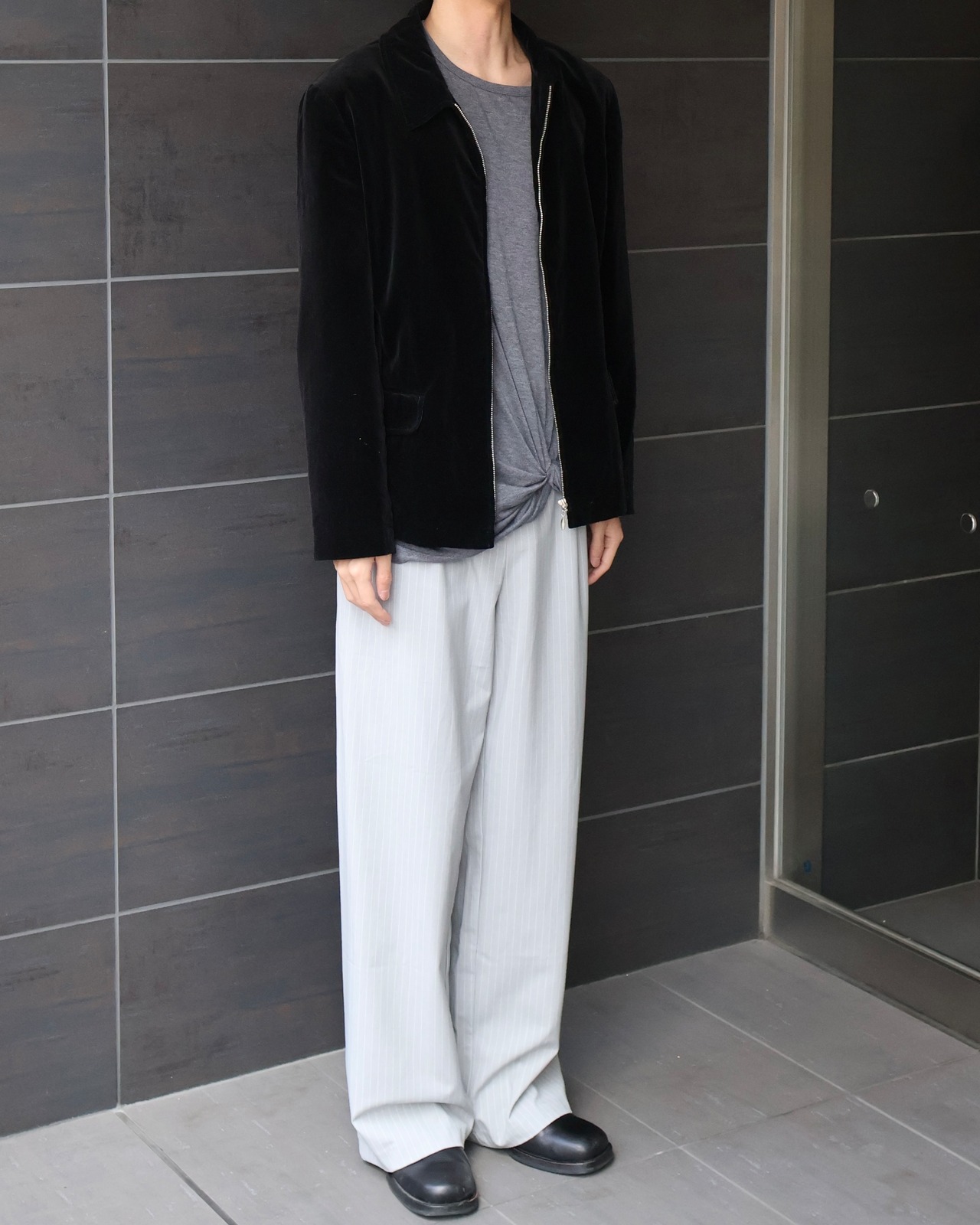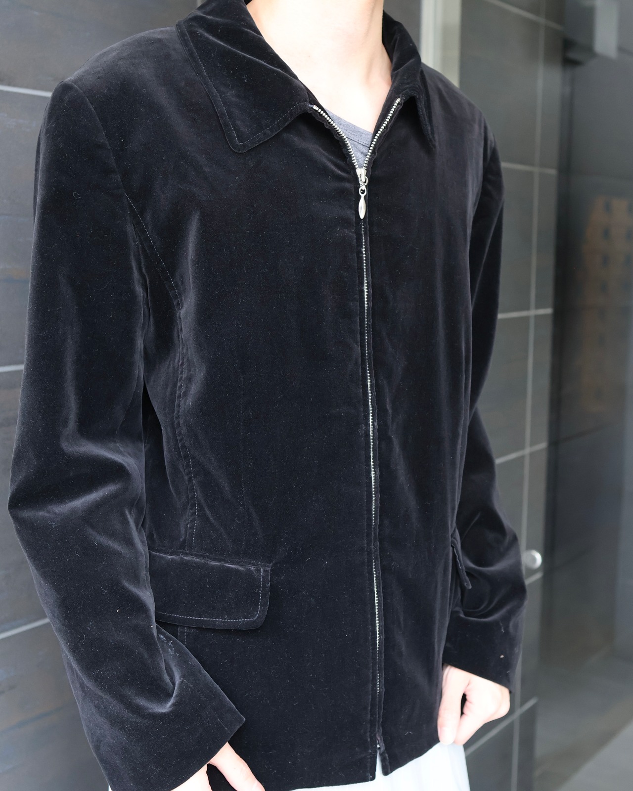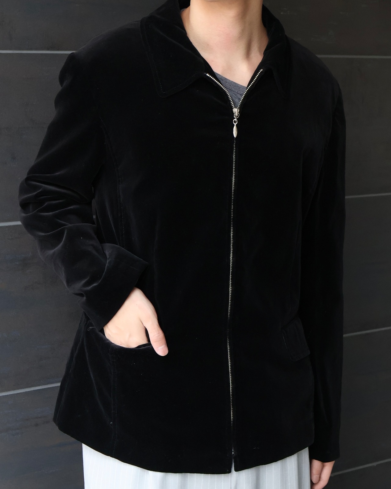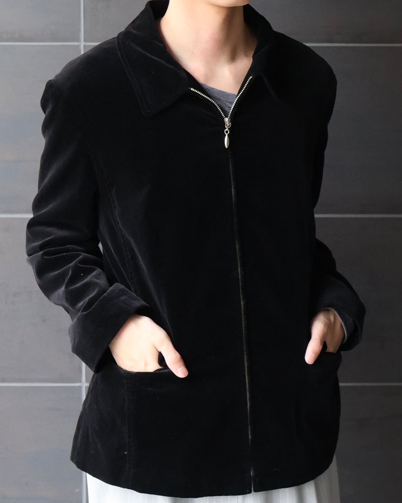 シンプルなデザインにベルベット生地が特徴のジップアップジャケット