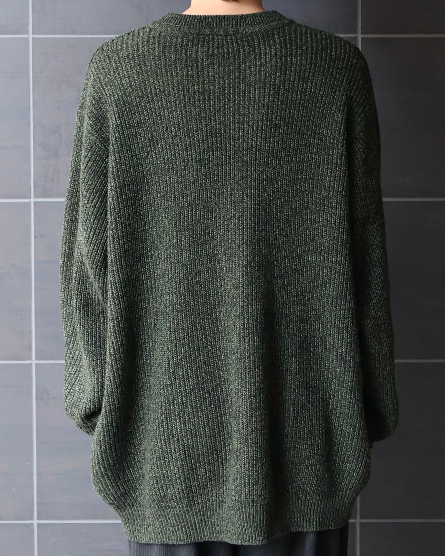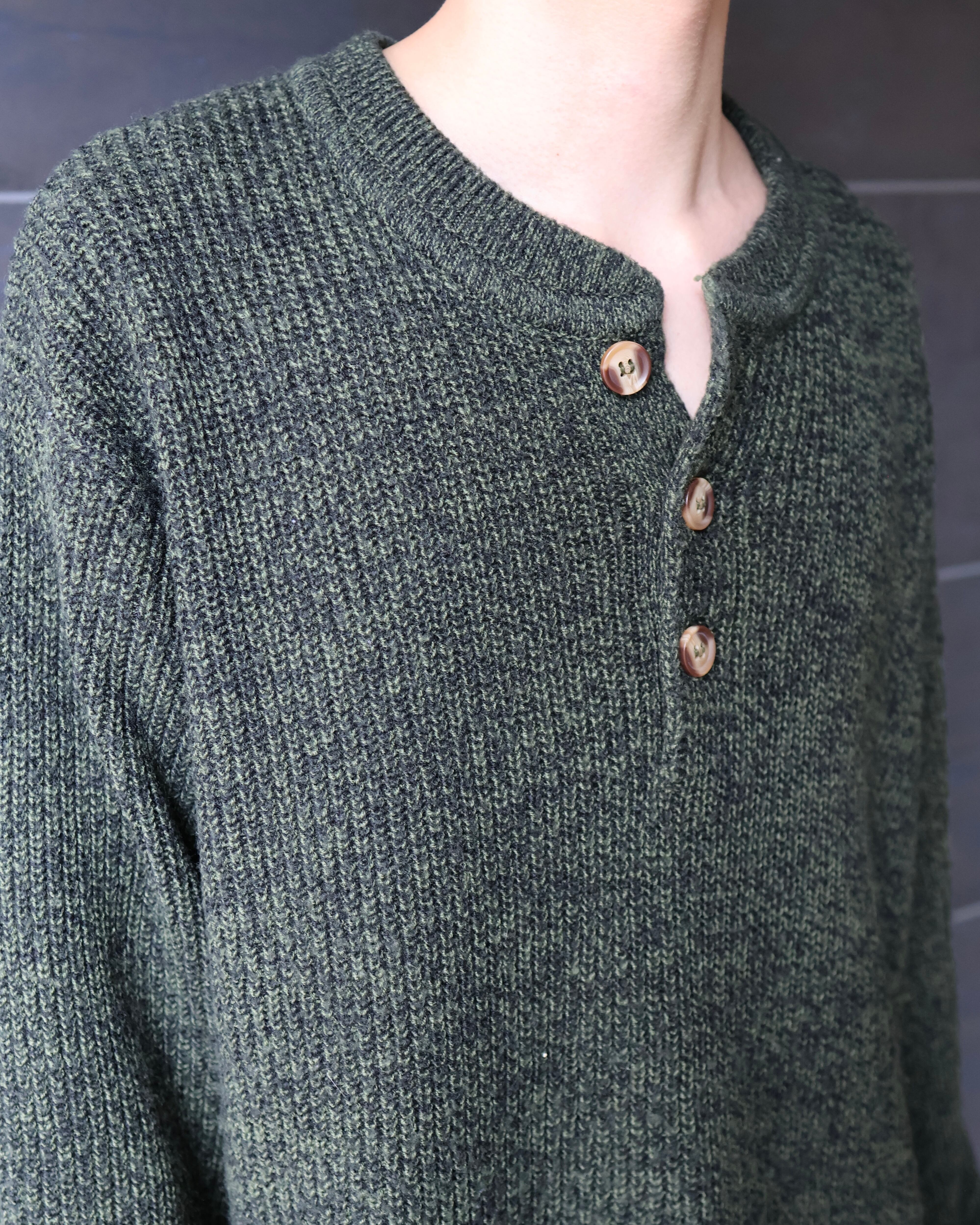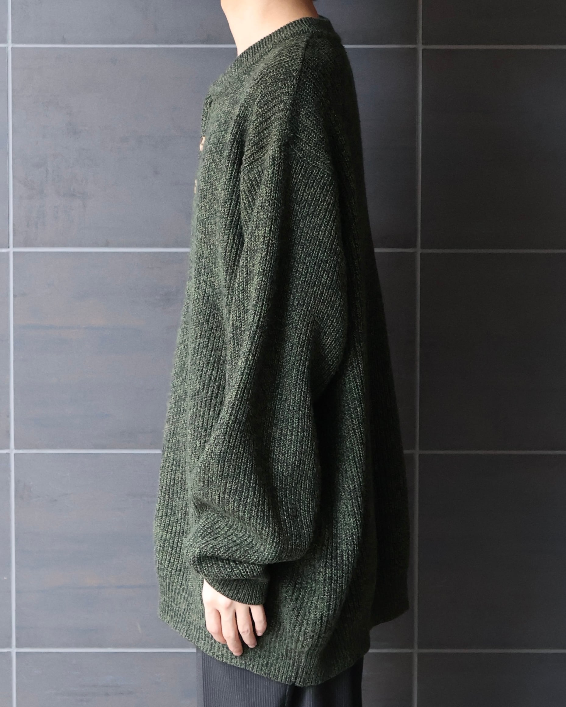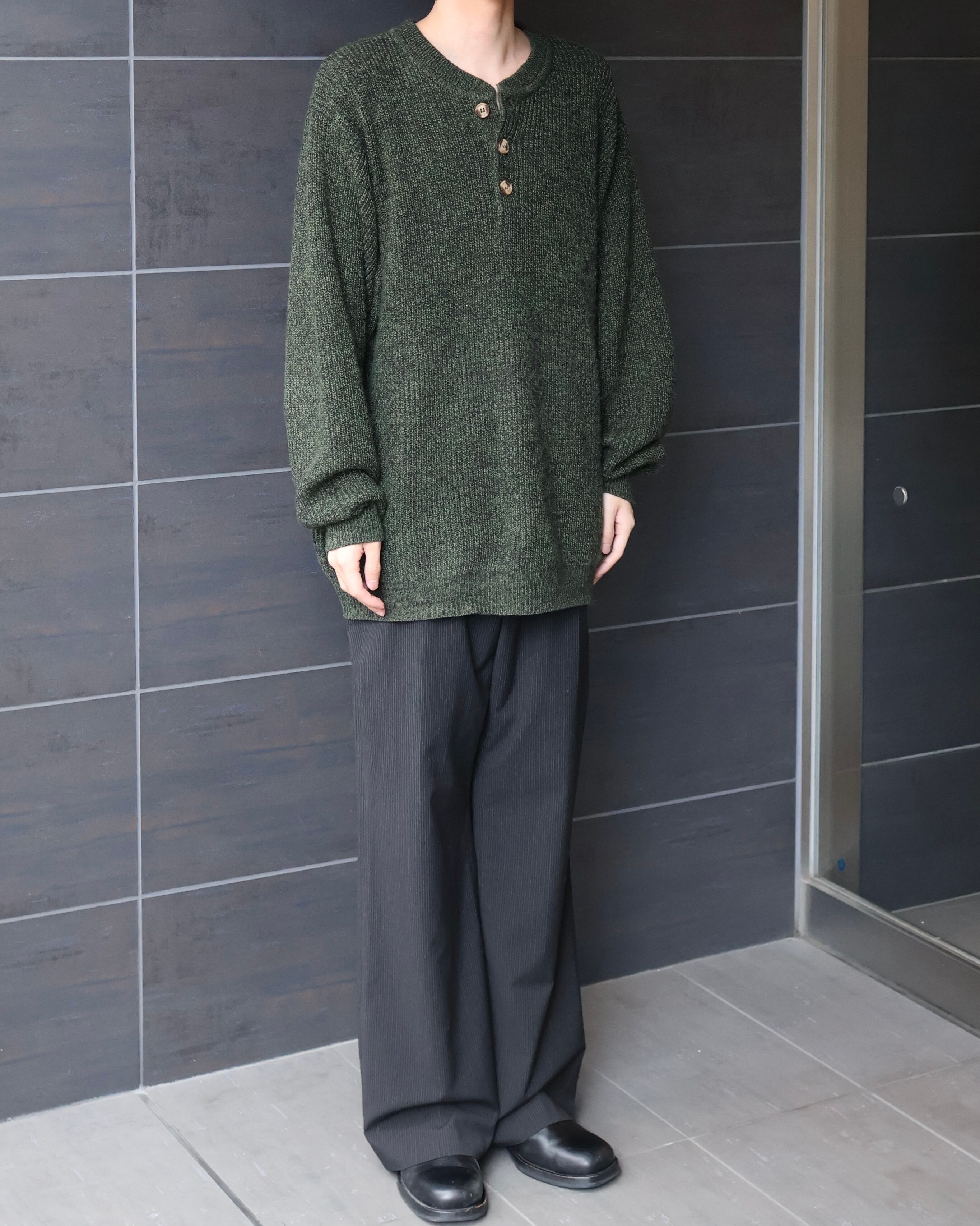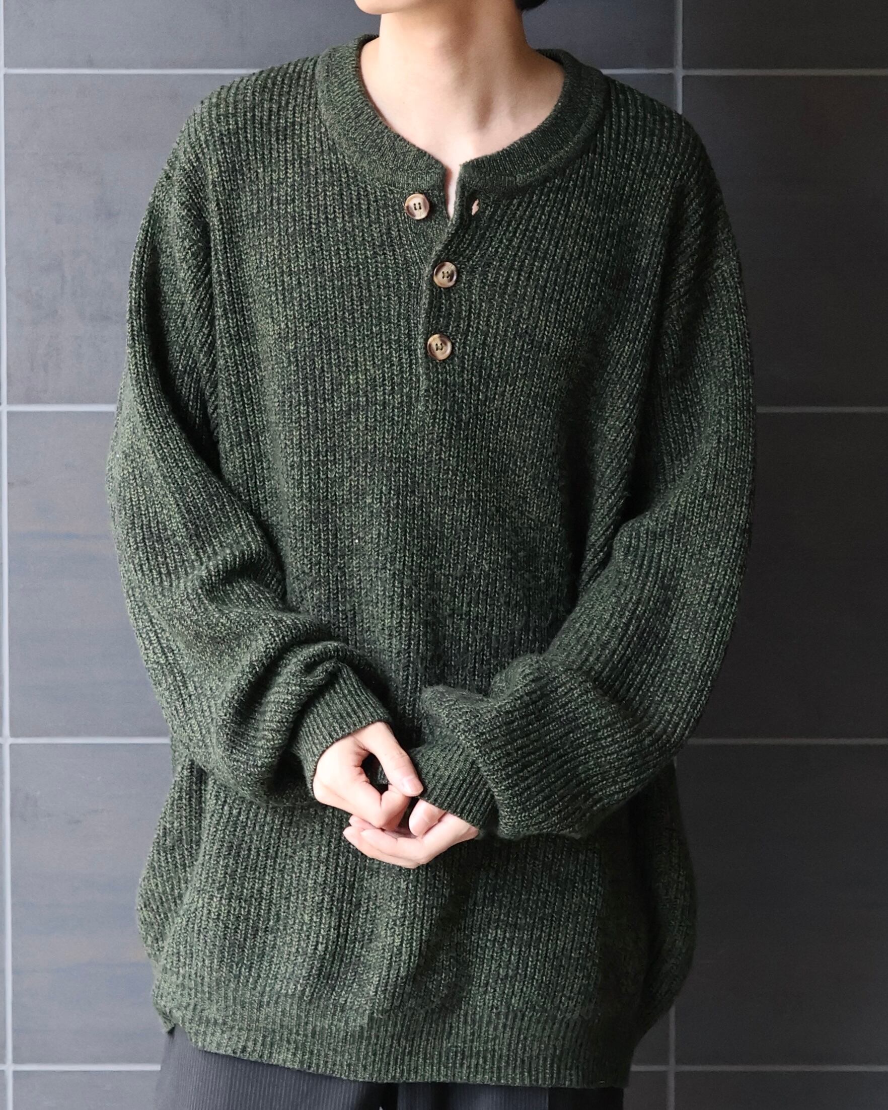 深みのあるグリーンカラーが特徴のオーバーサイズヘンリーネックニット