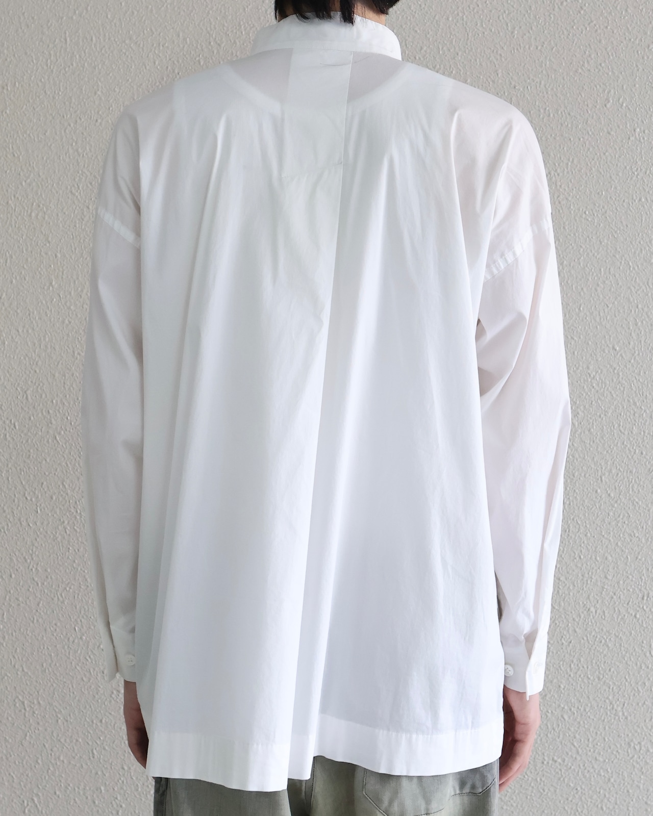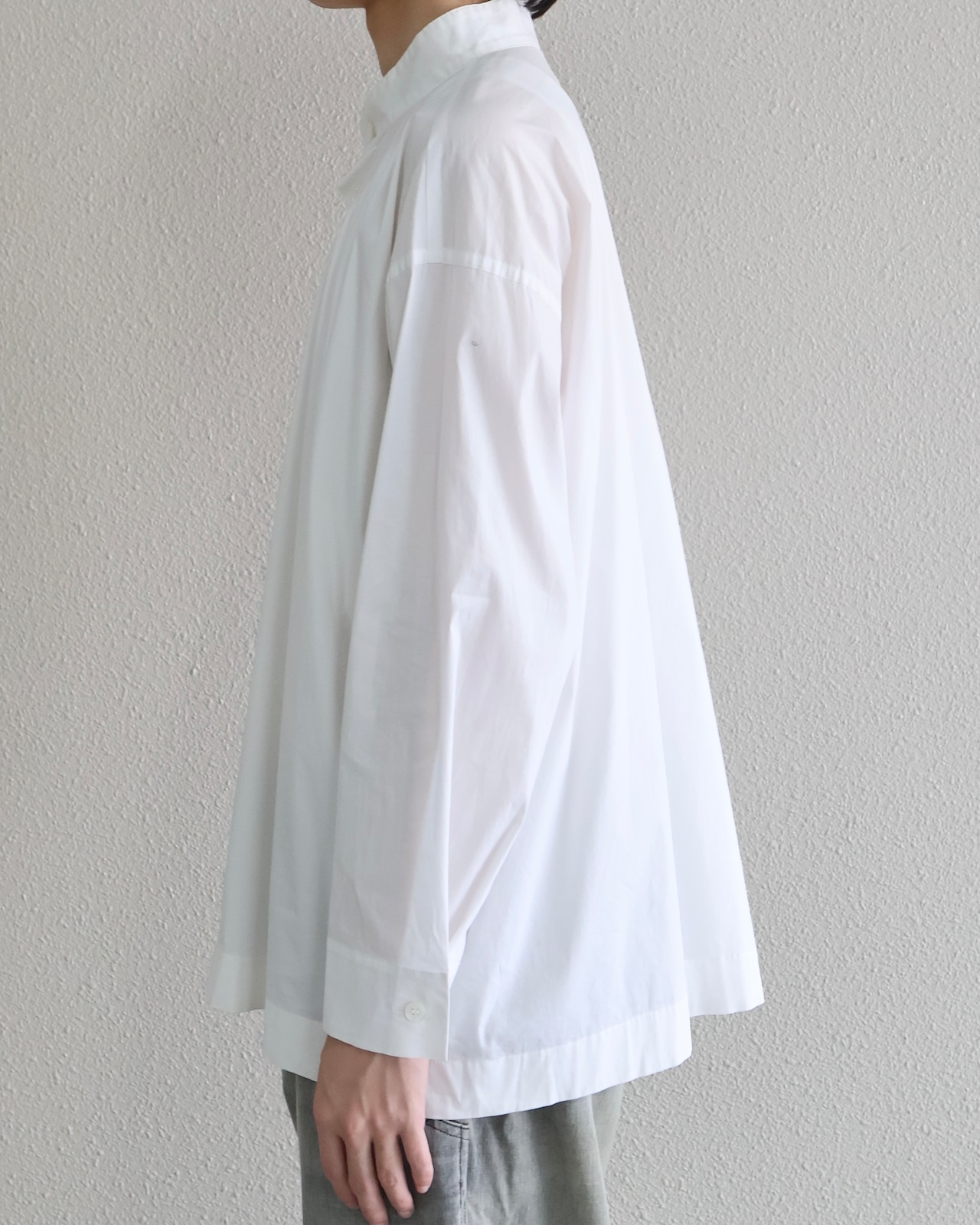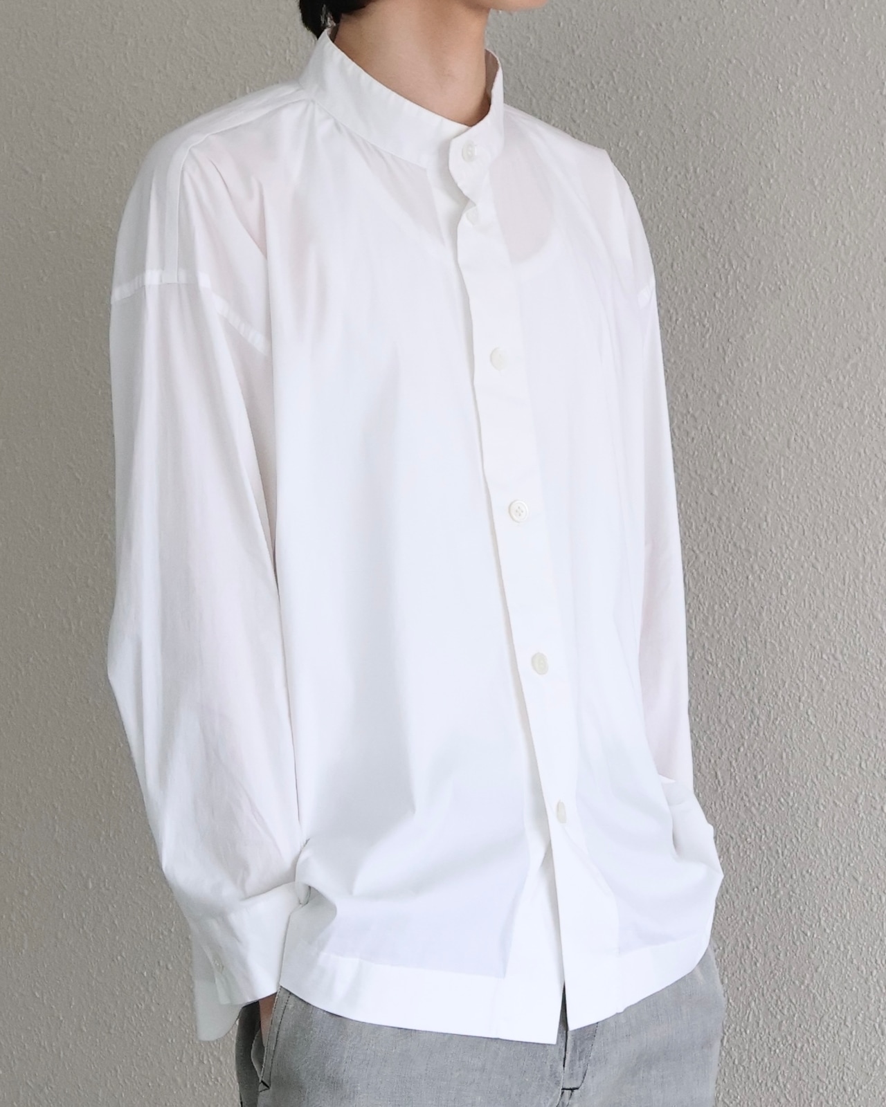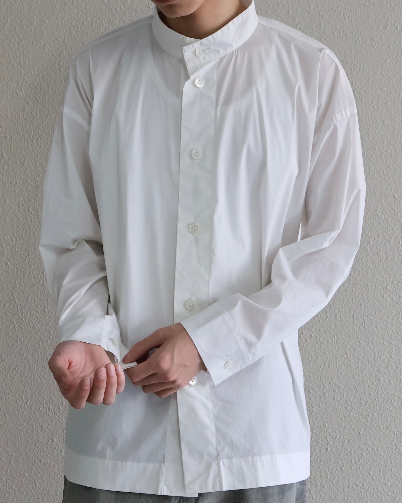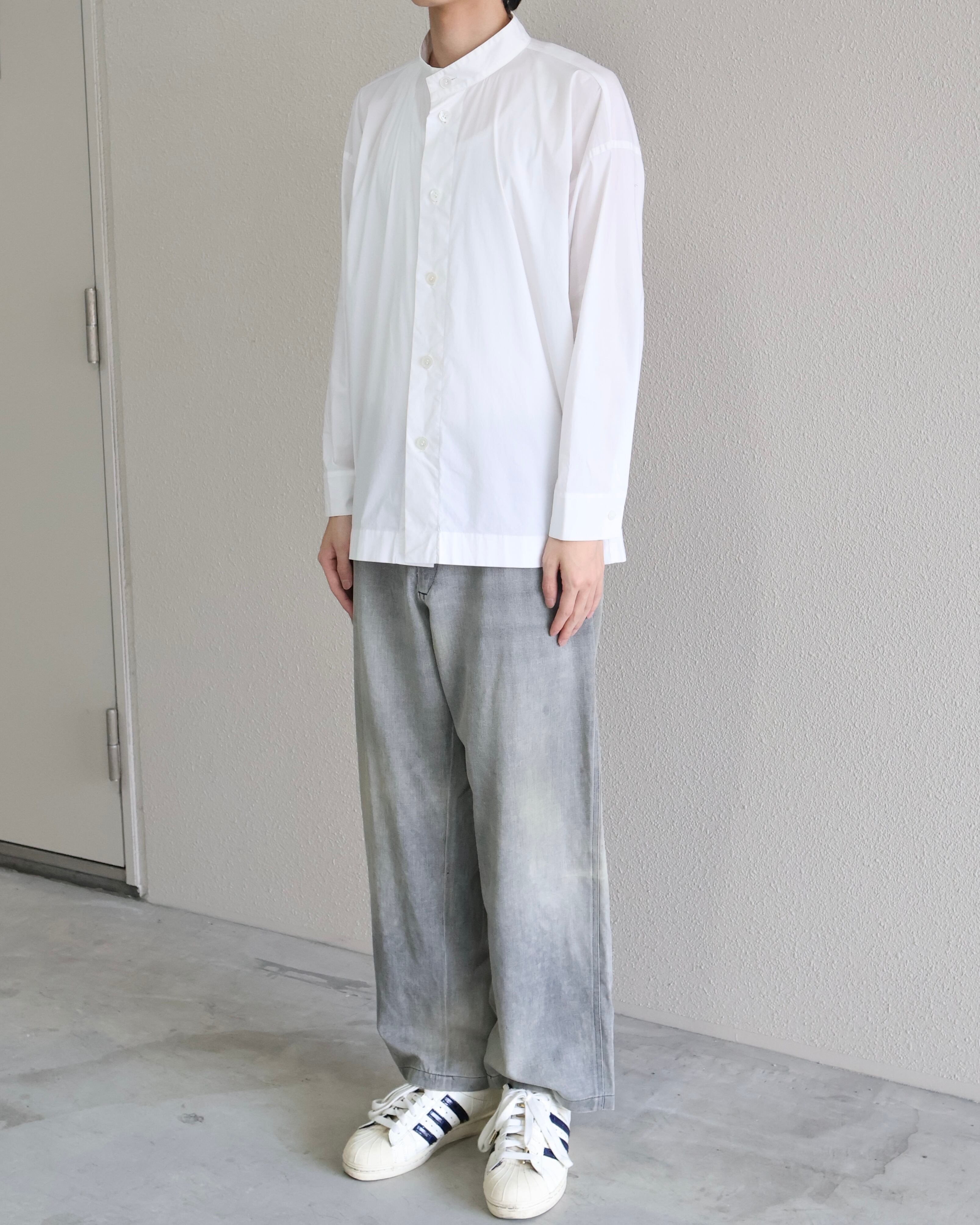 イッセイミヤケらしいミニマルな美学を体現したスタンドカラーシャツ