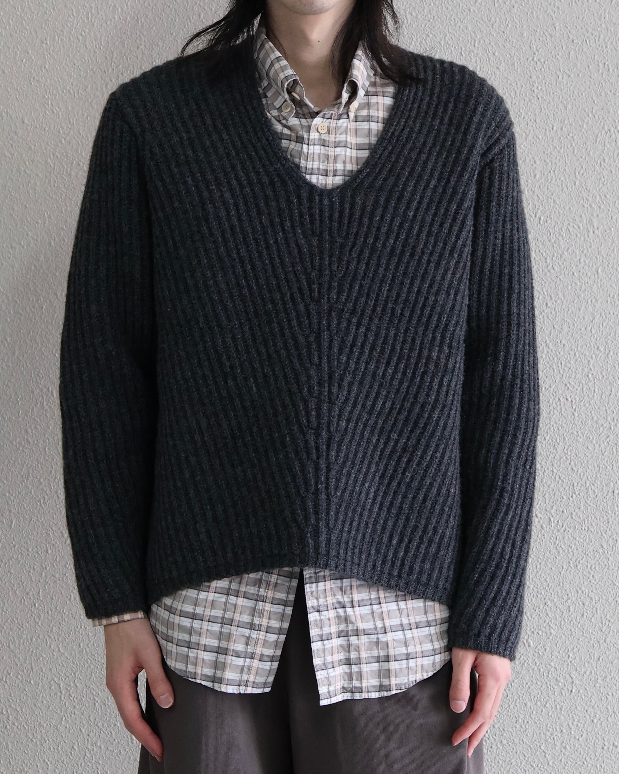 深めのVネックがレイヤードスタイルと相性が良く、シャツやカットソーとの組み合わせで都会的な抜け感を演出。程よく厚みのあるウール素材は、立体的なシルエットを生み出し、シンプルながら存在感のある一着。モードとカジュアルを行き来する、ブランドらしさのあるアイテム。