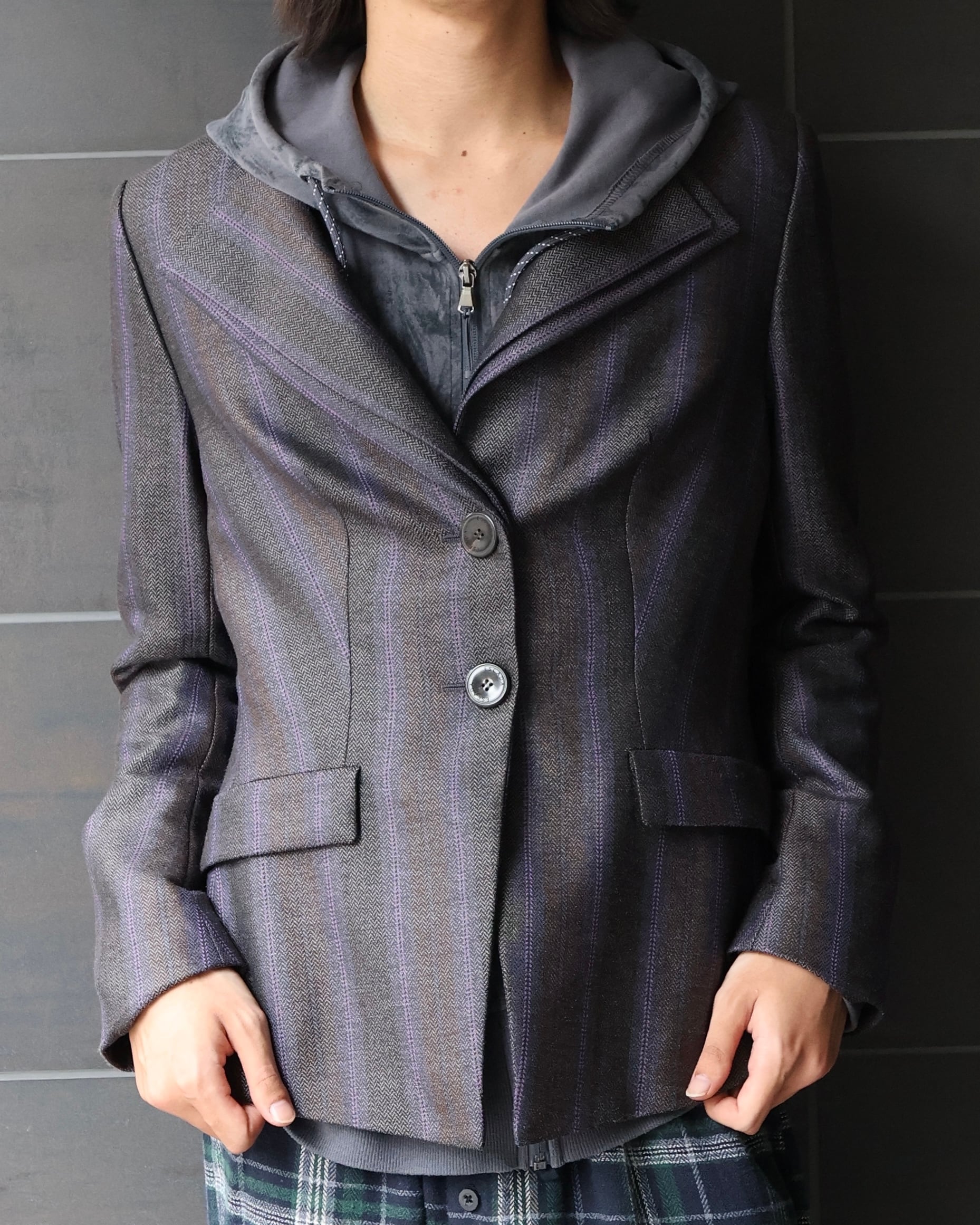 パープルのストライプとダブルラペルが特徴のシングルテーラードジャケット