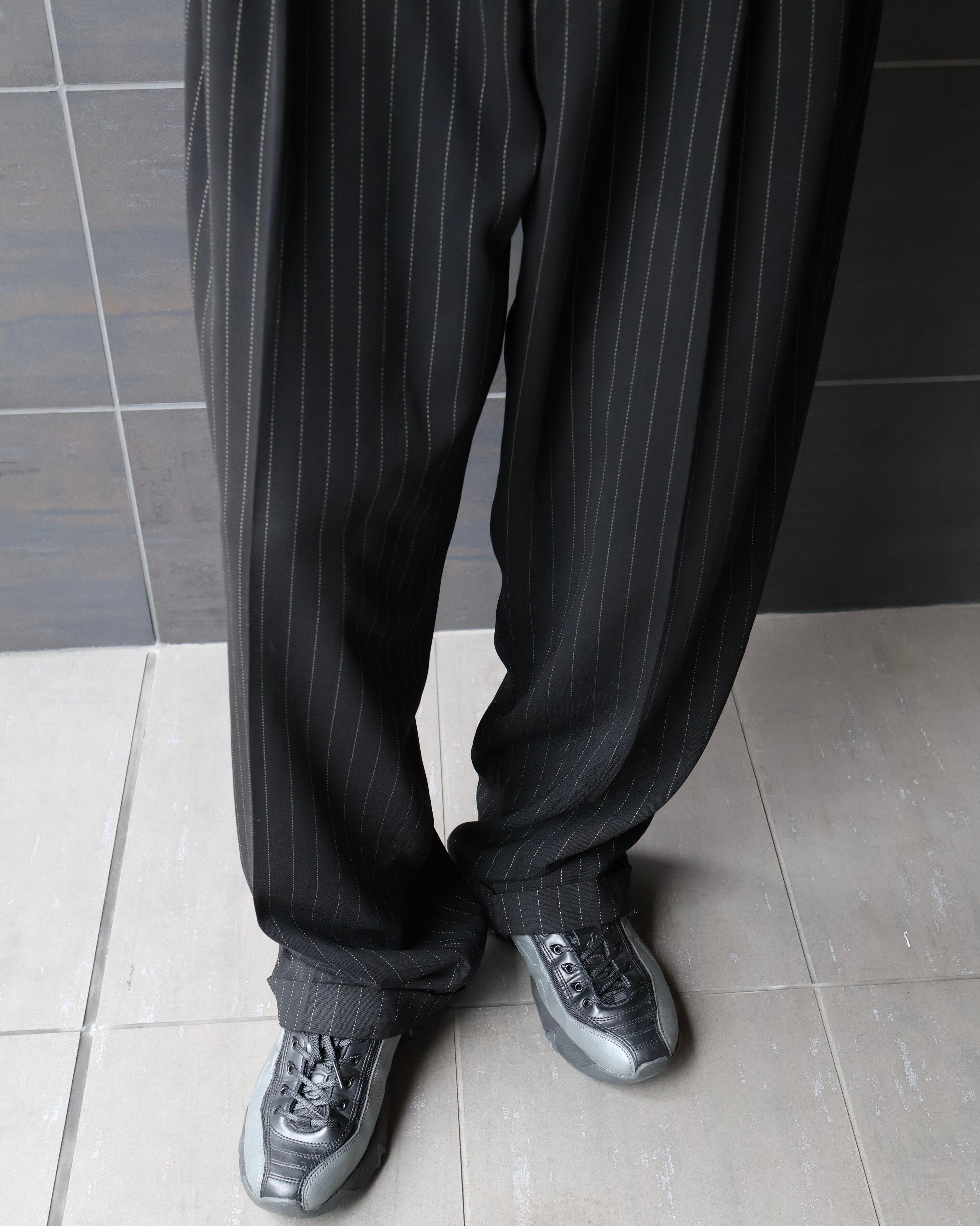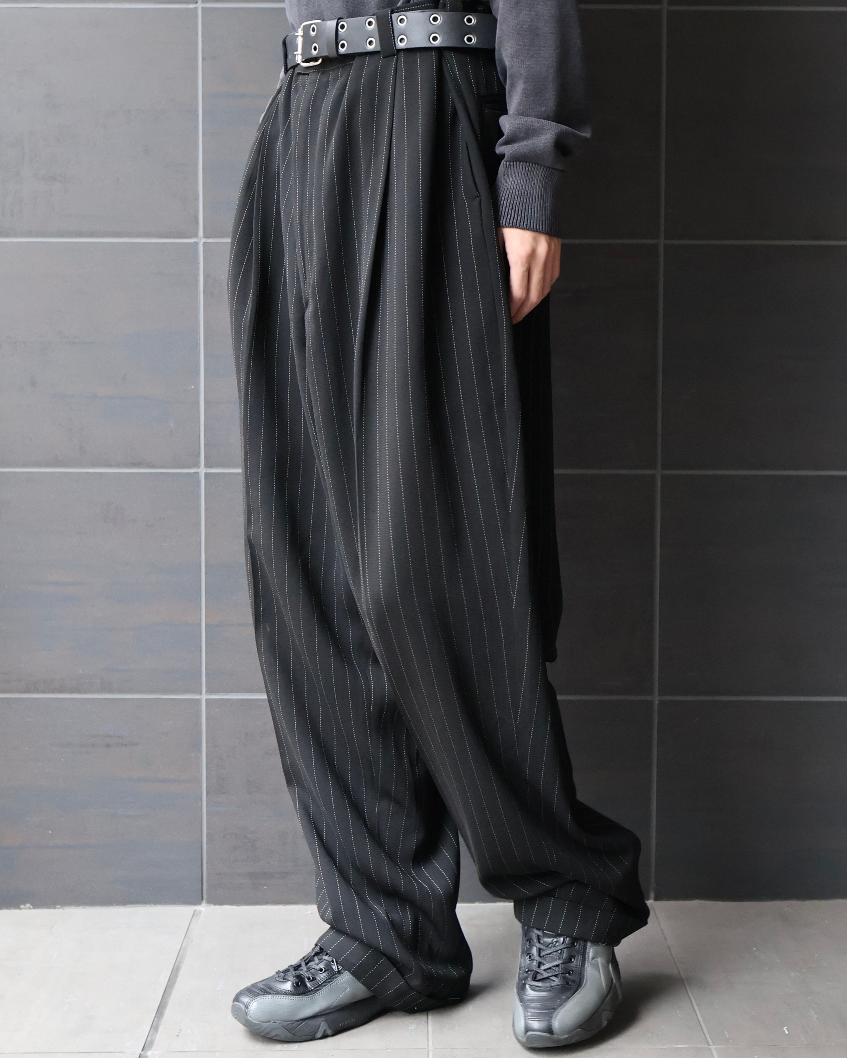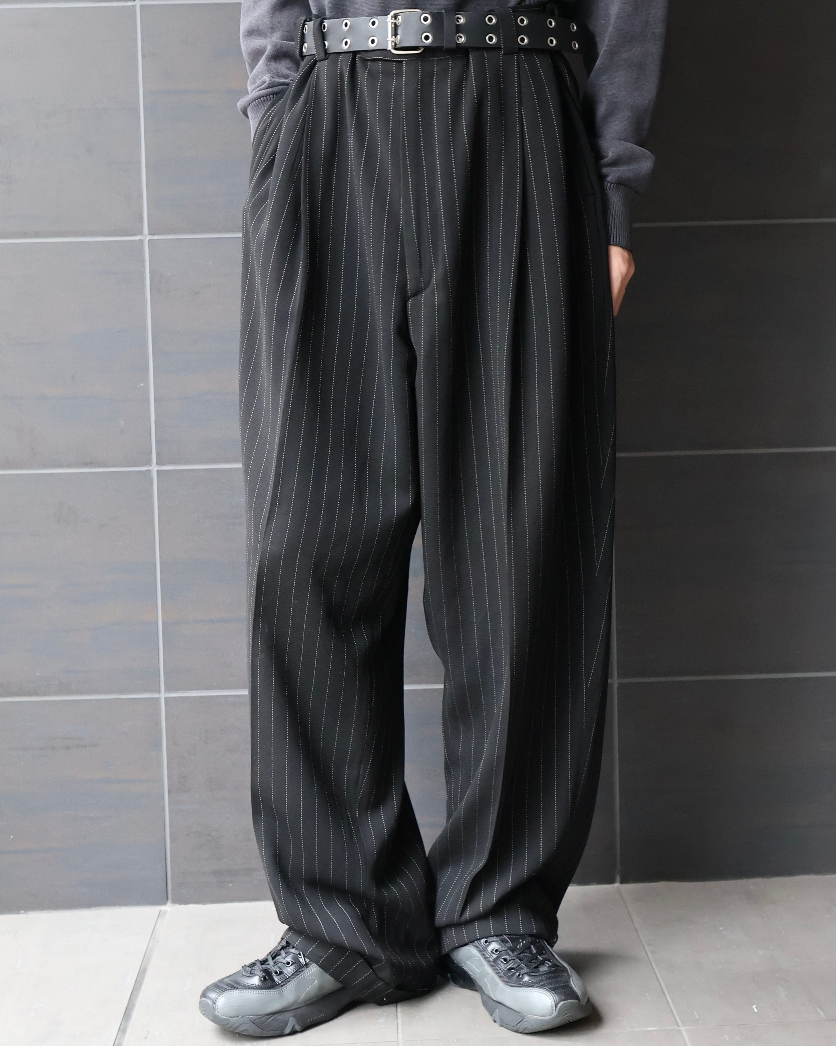 クラシックなピンストライプとワイドシルエットが特徴のスラックス