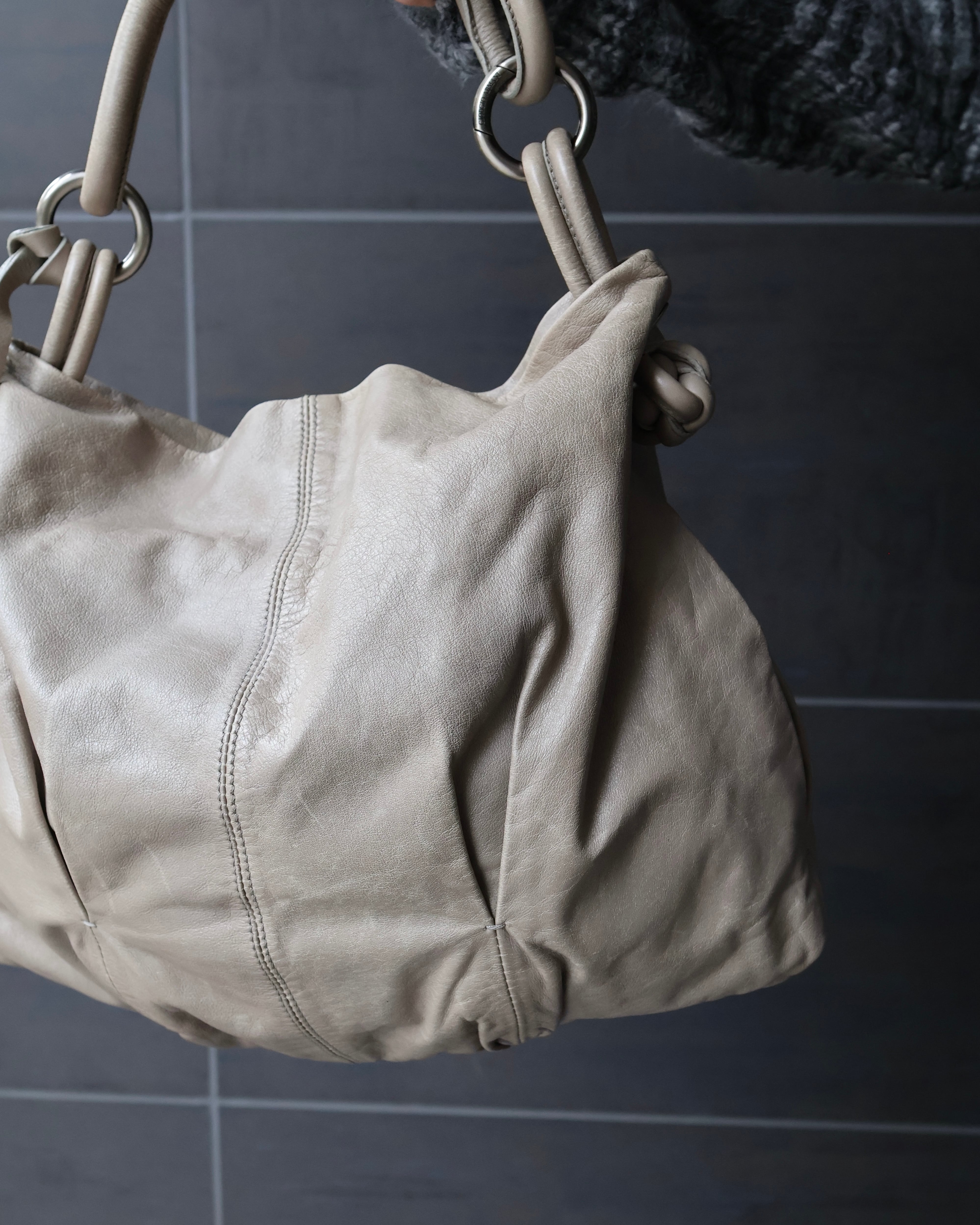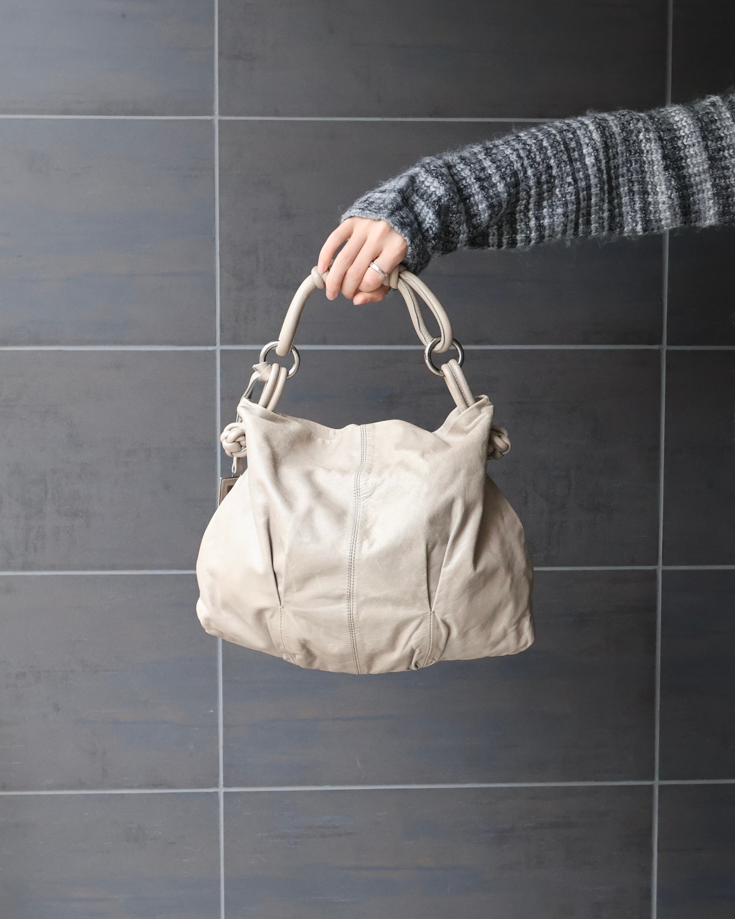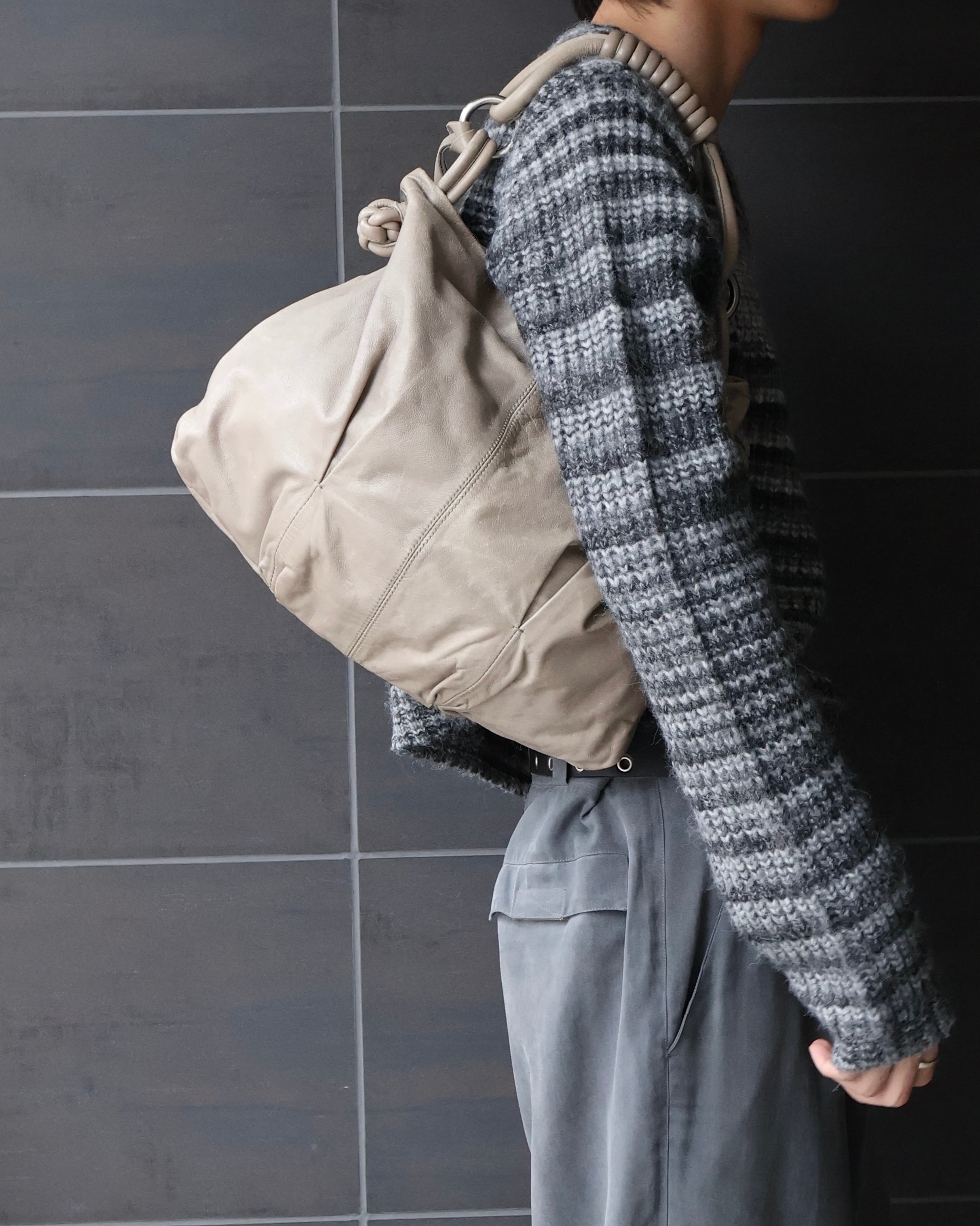 柔らかく馴染むレザーが生み出すドレープが、スタイリングに余裕と深みをプラス。カジュアルからドレススタイルまで幅広く馴染む、タイムレスなアイテム。