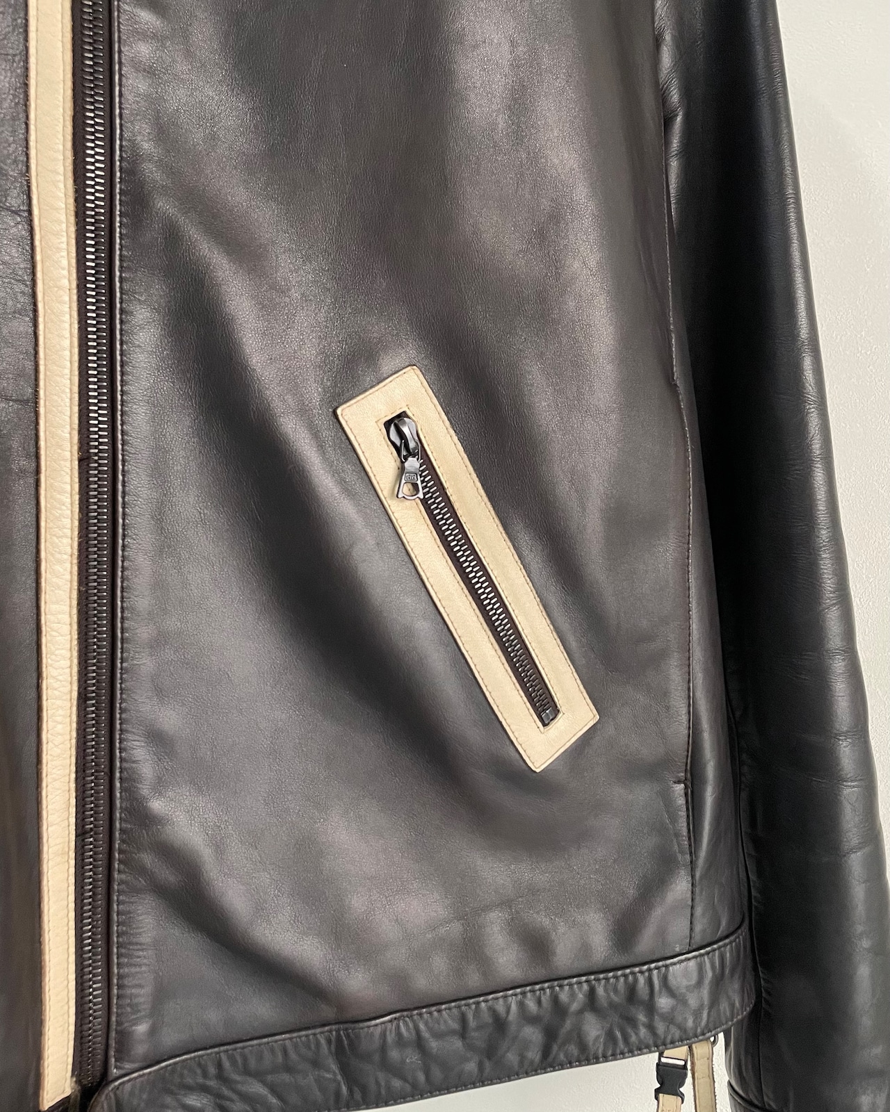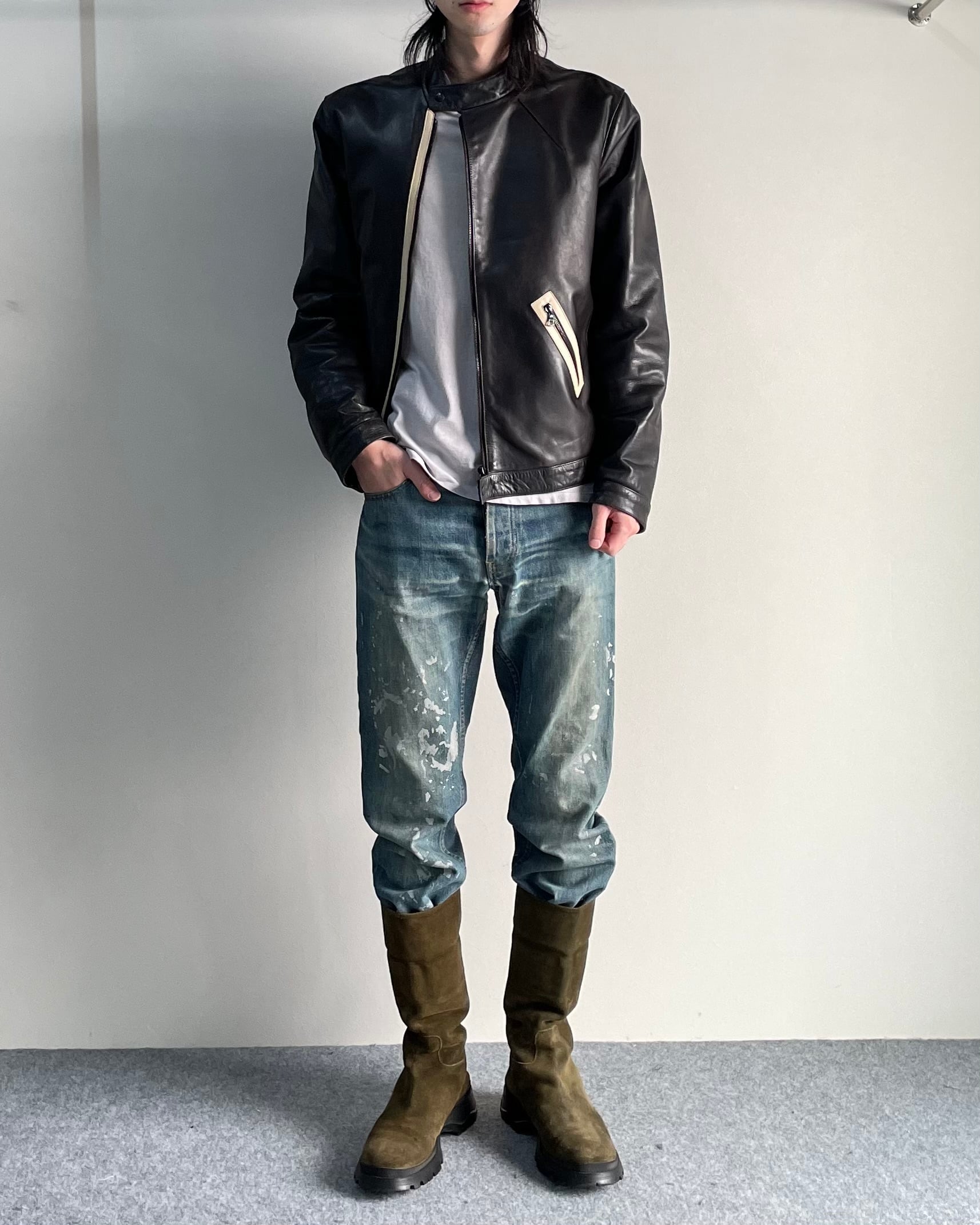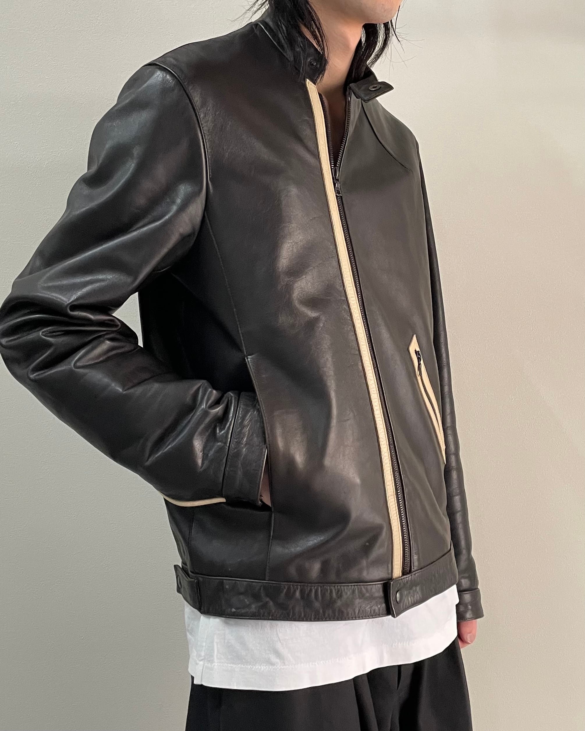 上質なレザーとアシンメトリーデザインがブランドらしさを感じられるアイテム。程よくコンパクトなサイズ感でタイムレスに着れる1着。