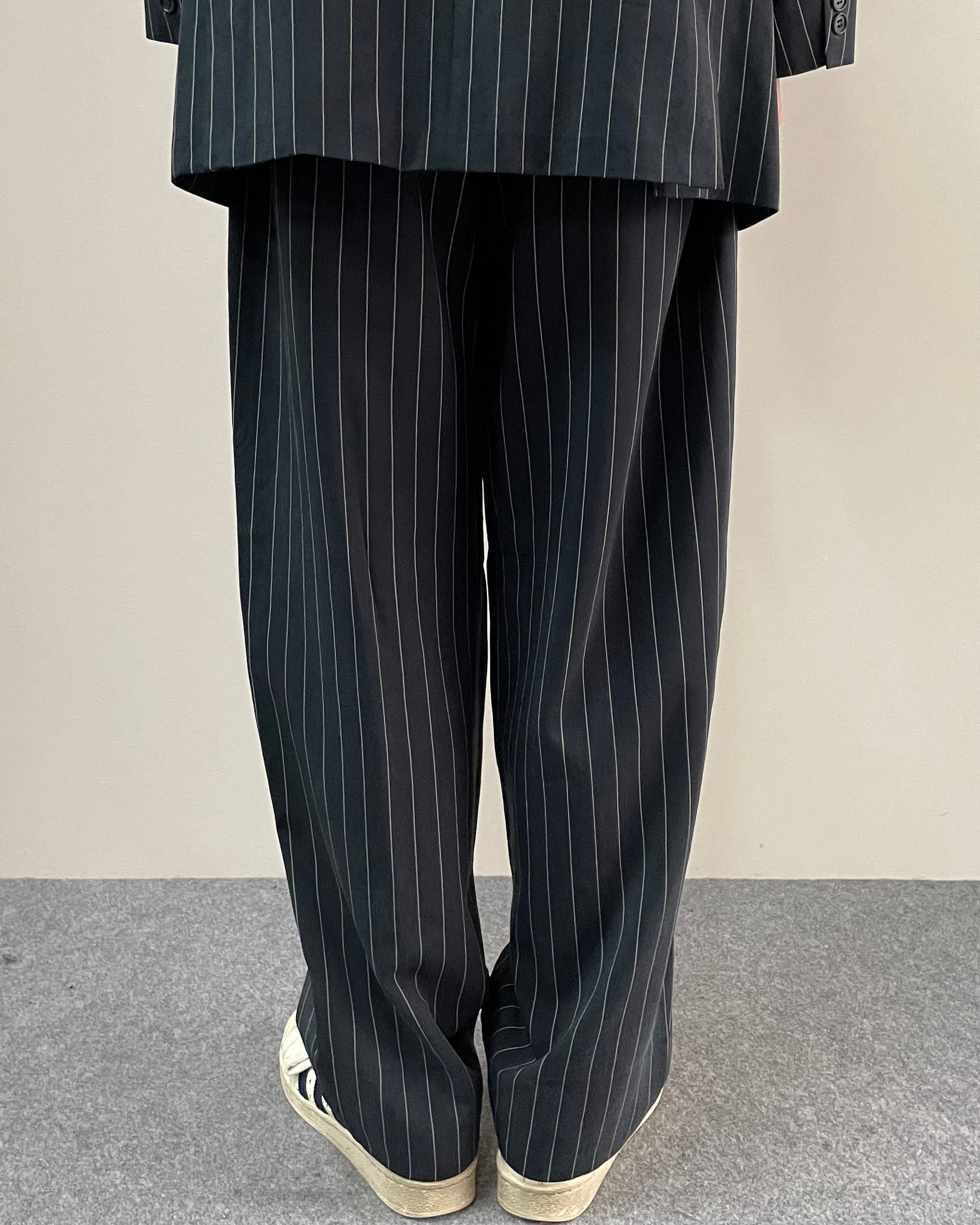 深めのタックとゆとりのあるワイドシルエットが、V2らしいリラックスしたエレガンスを演出。縦に流れるピンストライプがシルエットを美しく強調し、上品さと都会的な抜け感を両立。単体でもモードなスタイルに映える、存在感ある一本。
