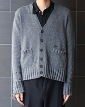 コンパクトな着丈に対して、袖やリブのボリュームがバランスよく構築された一枚。グレートーンとシンプルなデザインの中に、袖口のダメージディテールがブランドらしさを感じさせる。インナーとしても、カジュアルに羽織っても様になる上品かつ抜け感のあるアイテム。